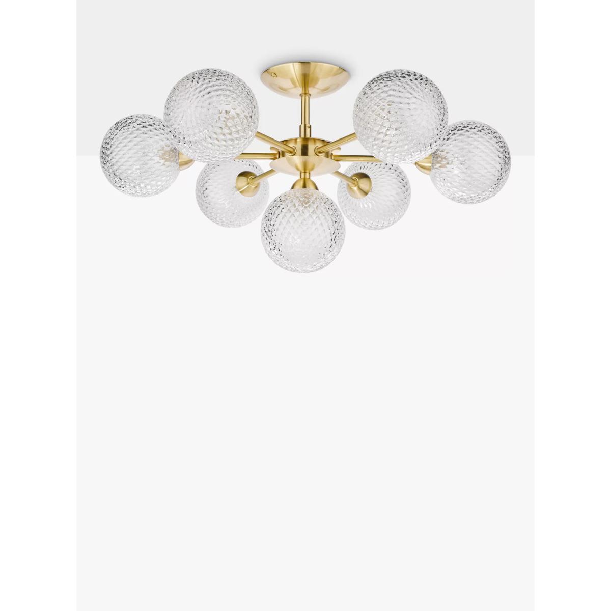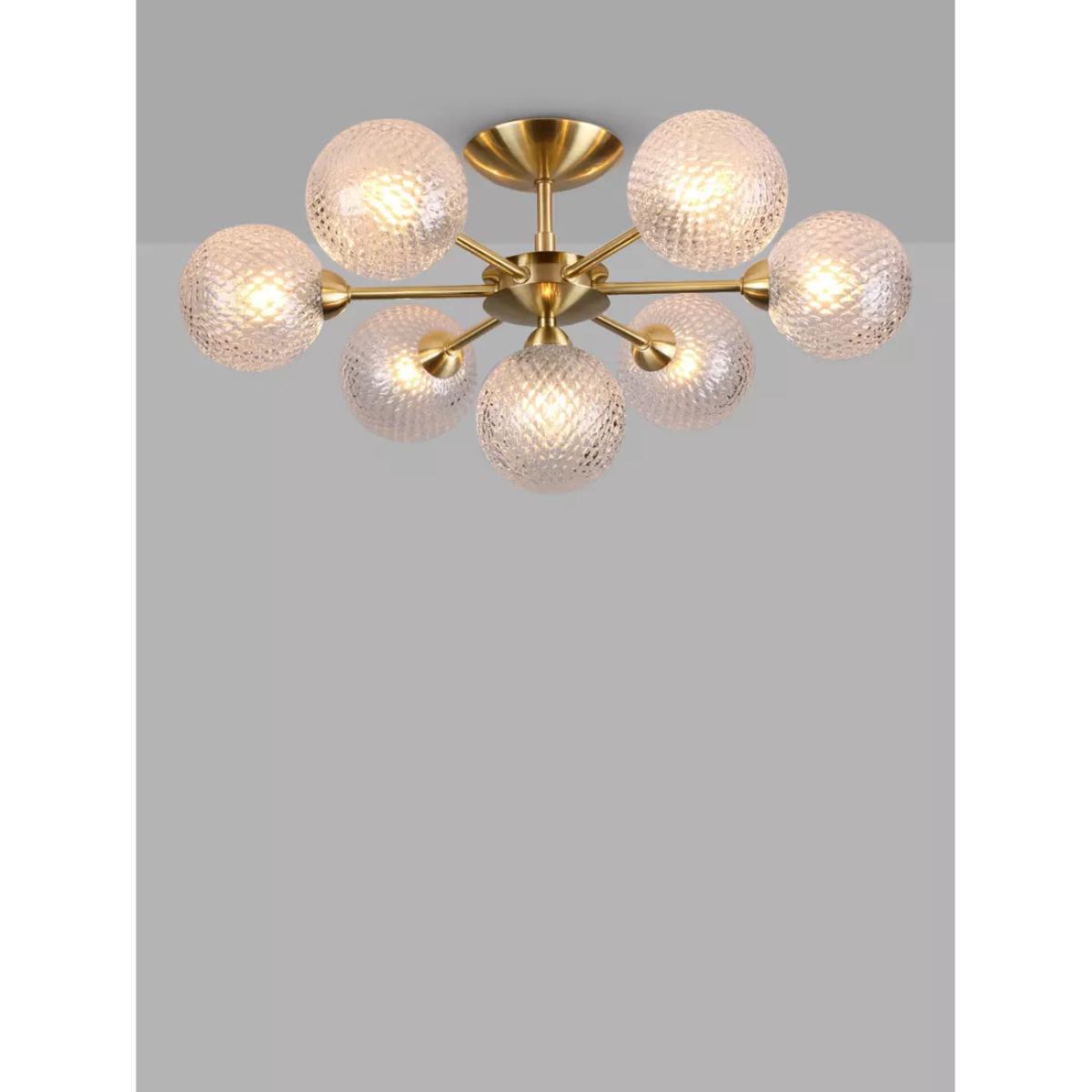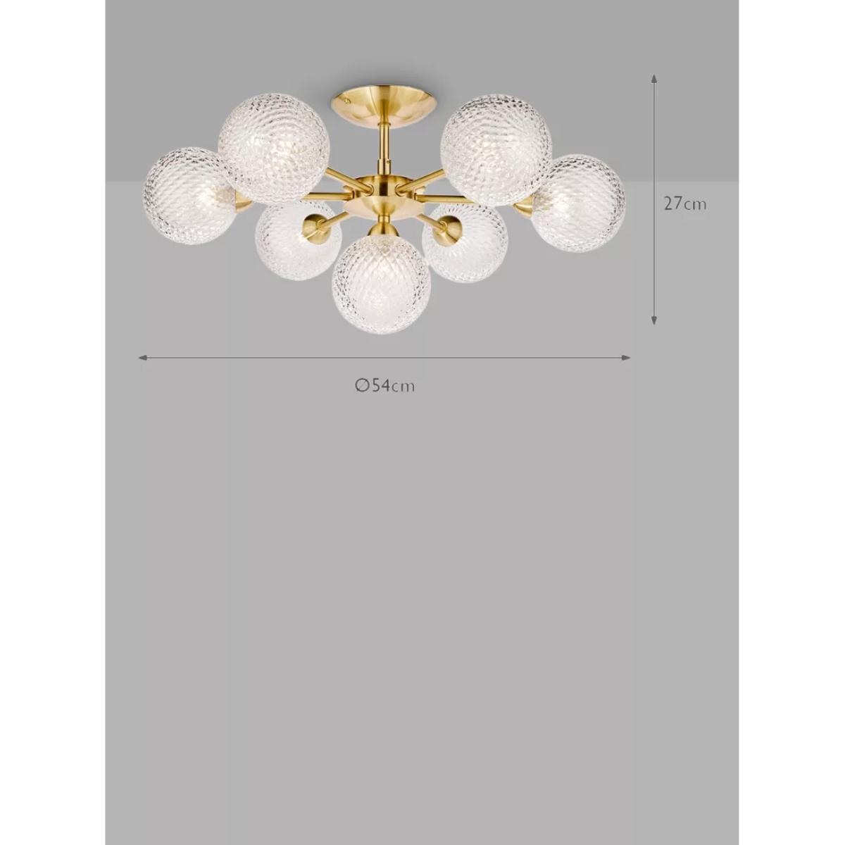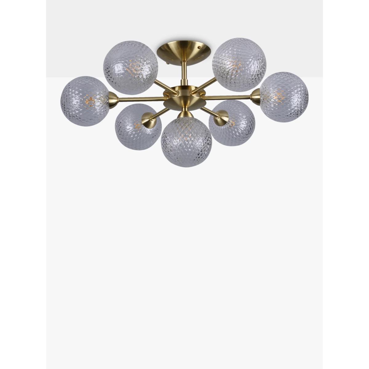 Thanks to its seven arms, this bold semi-flush ceiling fitting will spread light around your room. It has textured glass globe shades that offer a sparkly accent when illuminated and it's available in a choice of metal finishes. Seven LED bulbs are required.