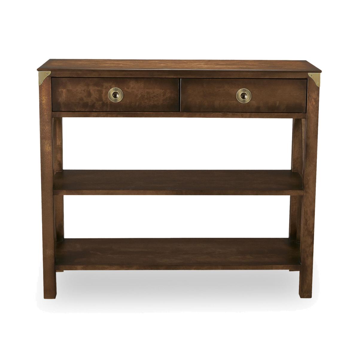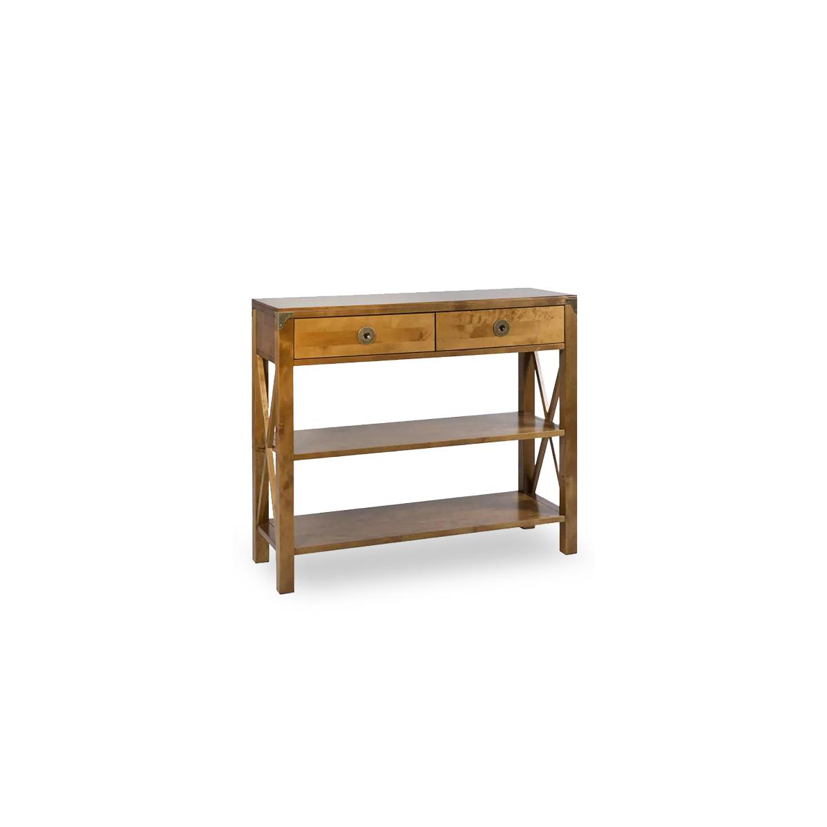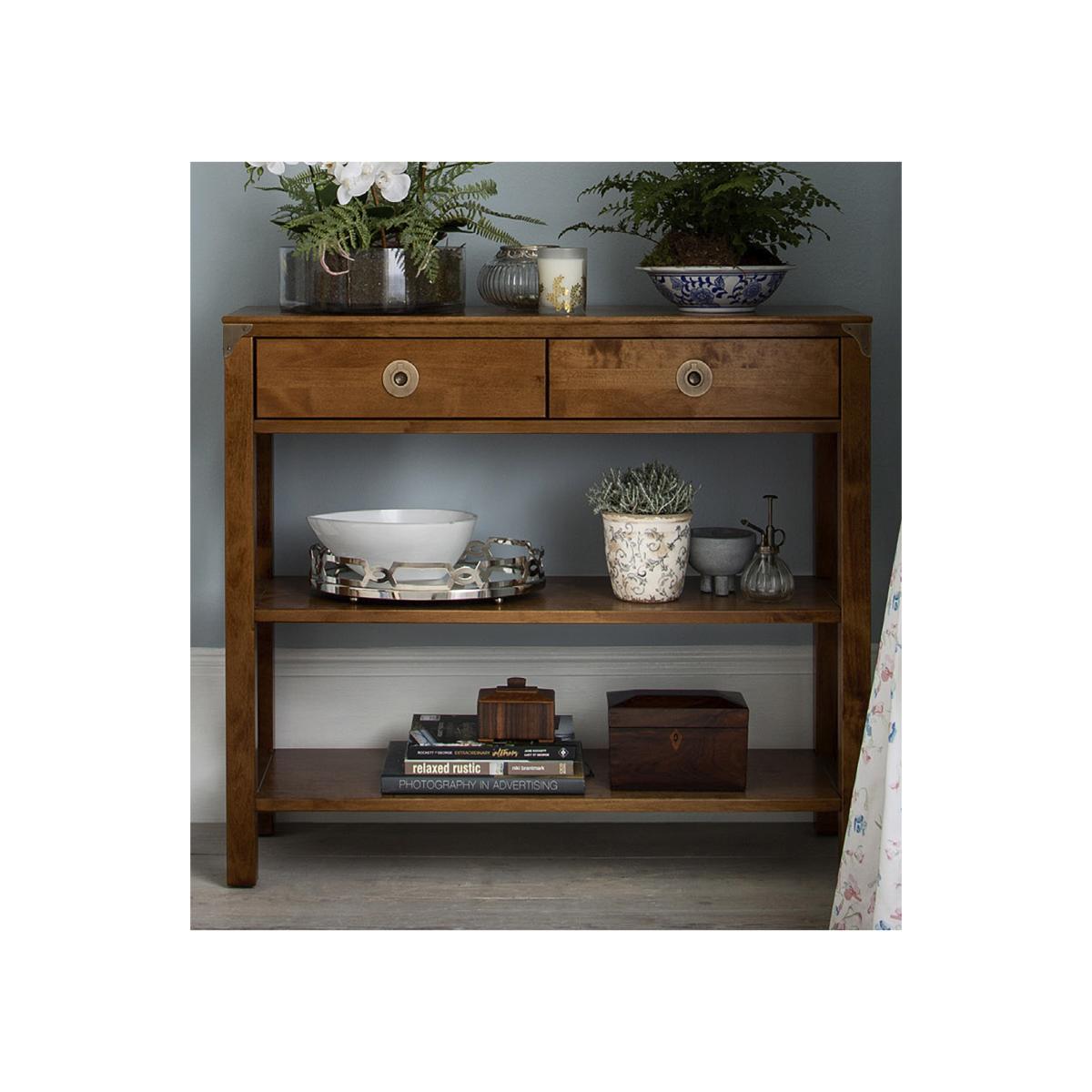 The Laura Ashley Balmoral collection seamlessly blends timeless design with practical elegance. Crafted from sturdy solid birch, each piece boasts a rich, hand-painted finish that highlights the natural beauty of the wood, showcasing its unique grain and colour variations. Inspired by traditional period furniture, the range features classic brushed brass handles and corner brackets, adding a touch of authentic charm. From extending dining tables to versatile storage solutions and comfortable seating, Balmoral offers sophisticated style and lasting durability. With its clean lines and refined details, this collection is perfect for creating a cohesive and inviting atmosphere throughout your home. The Laura Ashley Balmoral 2 drawer console table offers a sophisticated blend of style and utility, perfect for welcoming guests in a hallway or accenting a living room. Why you'll love it Timeless design with brushed brass hardware and corner accents. Two convenient drawers for keys, letters, or other essentials. Two spacious open shelves provide display space for books and decor. Crafted from sturdy solid birch wood for lasting durability. Available in two beautiful finishes: dark chestnut or honey. Part of the exquisite Laura Ashley Balmoral range. What you need to know Avoid direct sunlight or placing near heat sources. Wipe clean with a soft, dry cloth. Item code: LABACONSDC-001