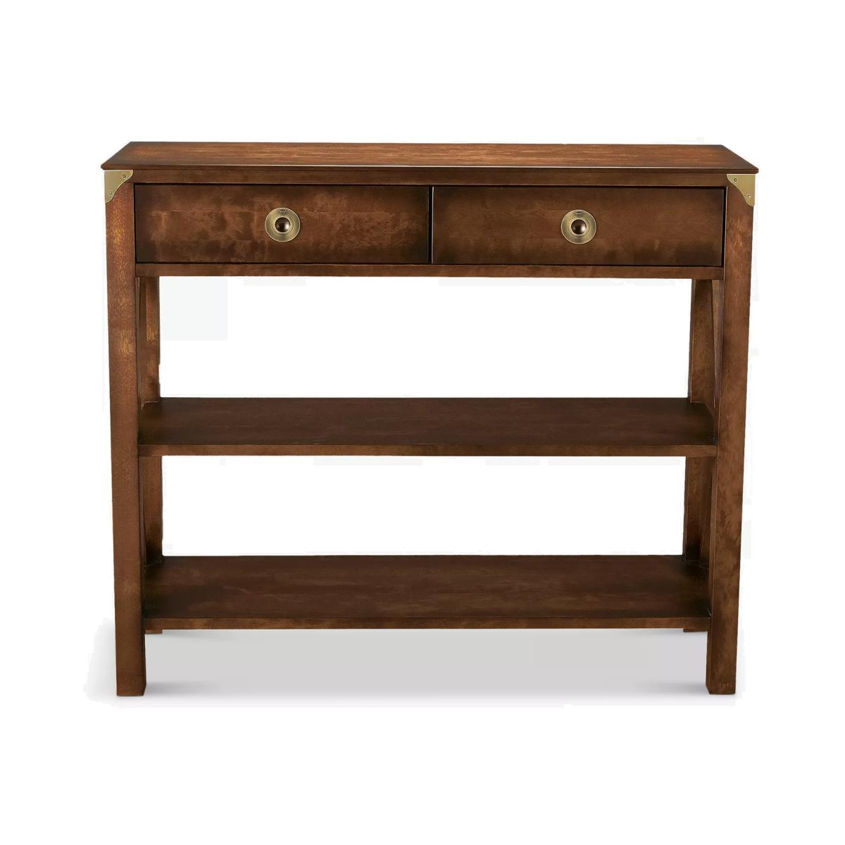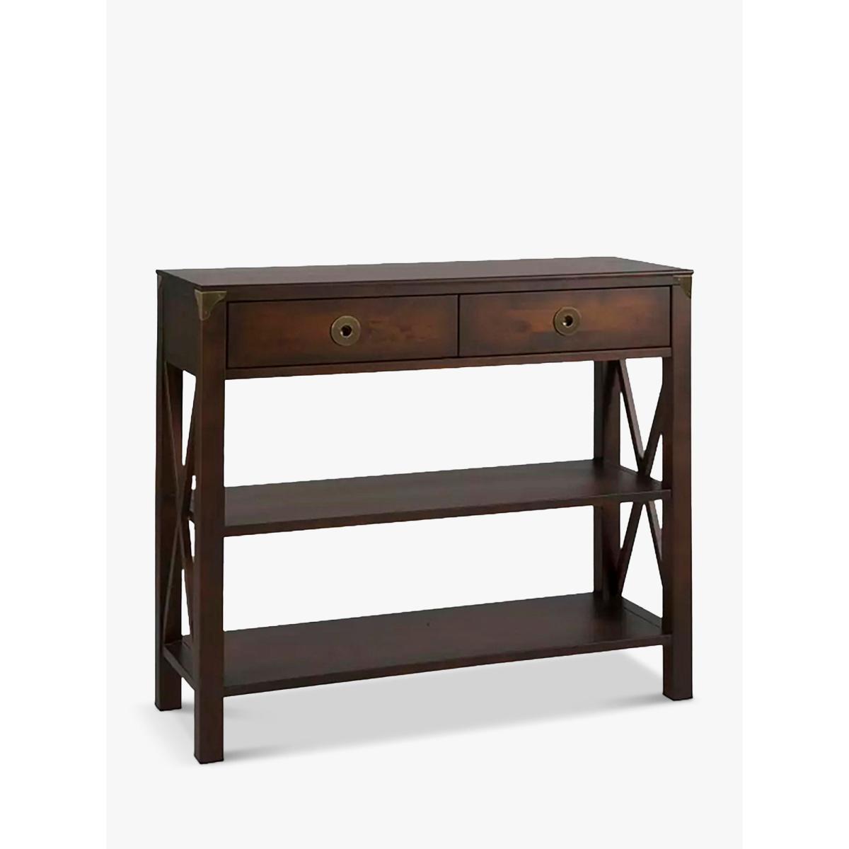 Made from solid birch wood with a hand-applied patina to enhance a warm finish, this console table is designed with two handy drawers and two fixed shelves. While its design may suit traditional interiors, note the cross-over detail on either side of the frame and the accents of antique-brass hardware. These design points give it a retro, Art Deco edge, making it both a distinctive and practical storage option for your home. Want to see it first? You may want to see and get a feel for this piece of furniture in one of our shops before ordering. We'll be able to tell you where the range you'd like to view is on display.