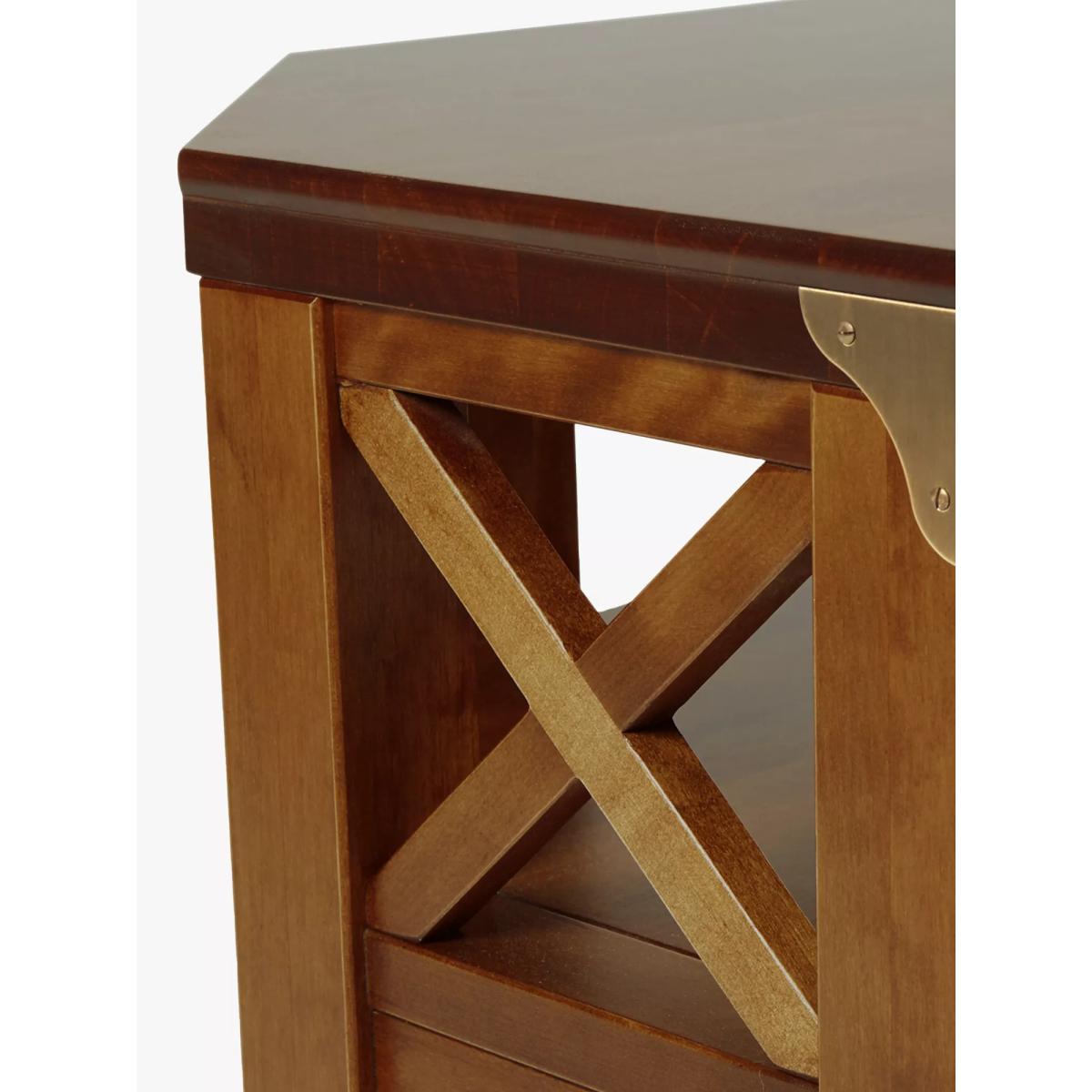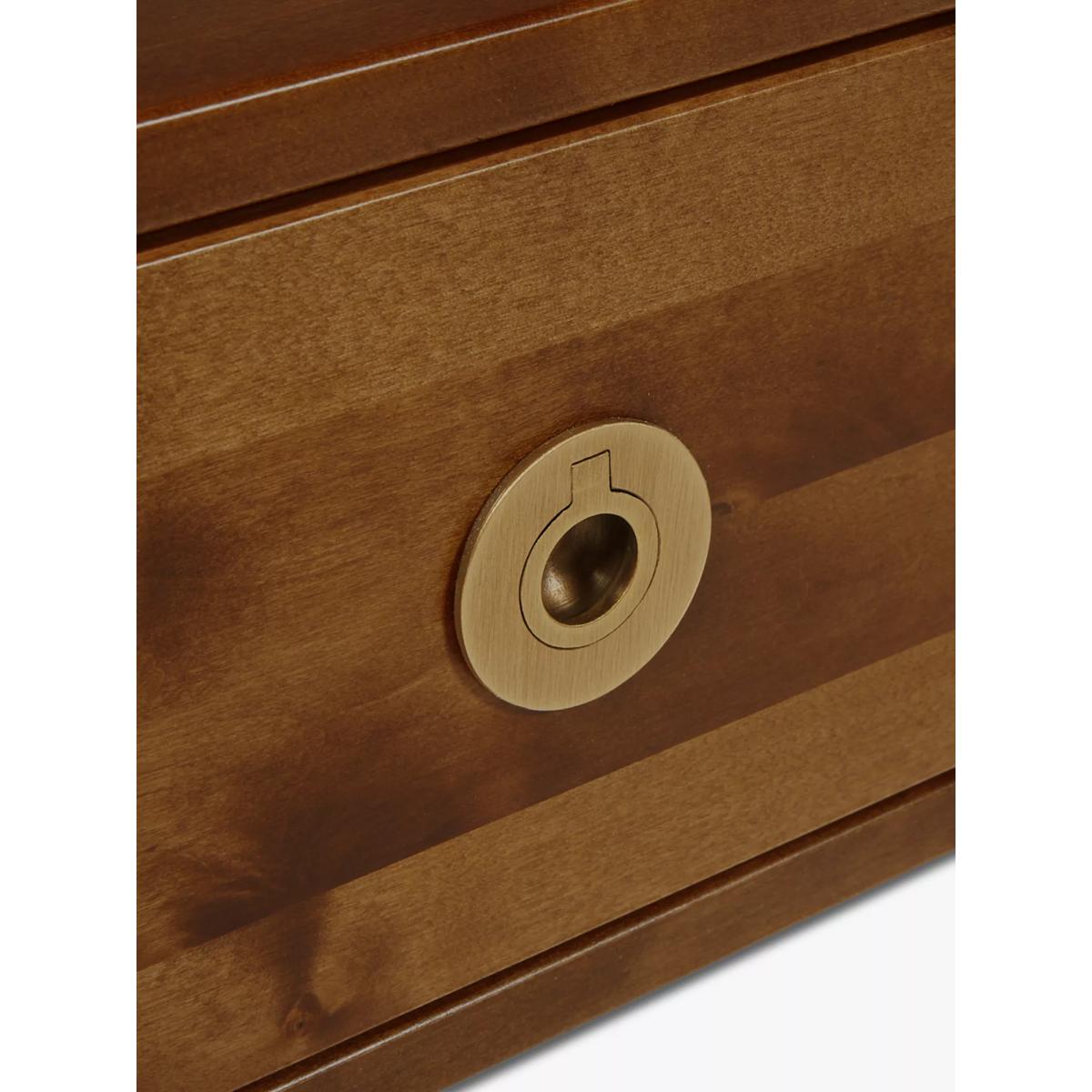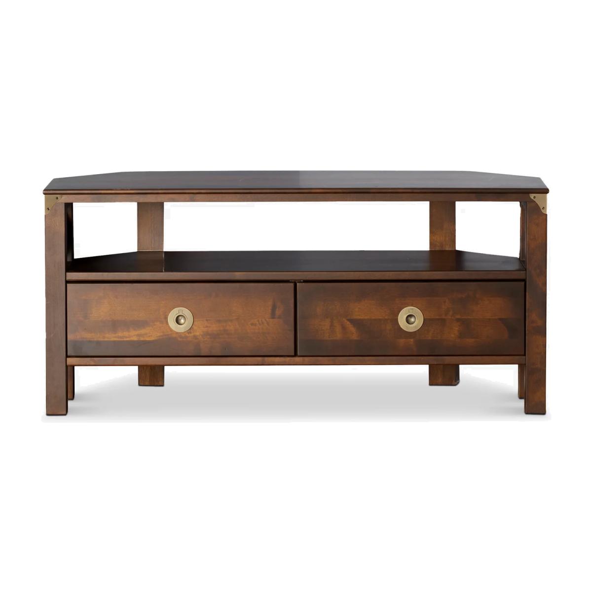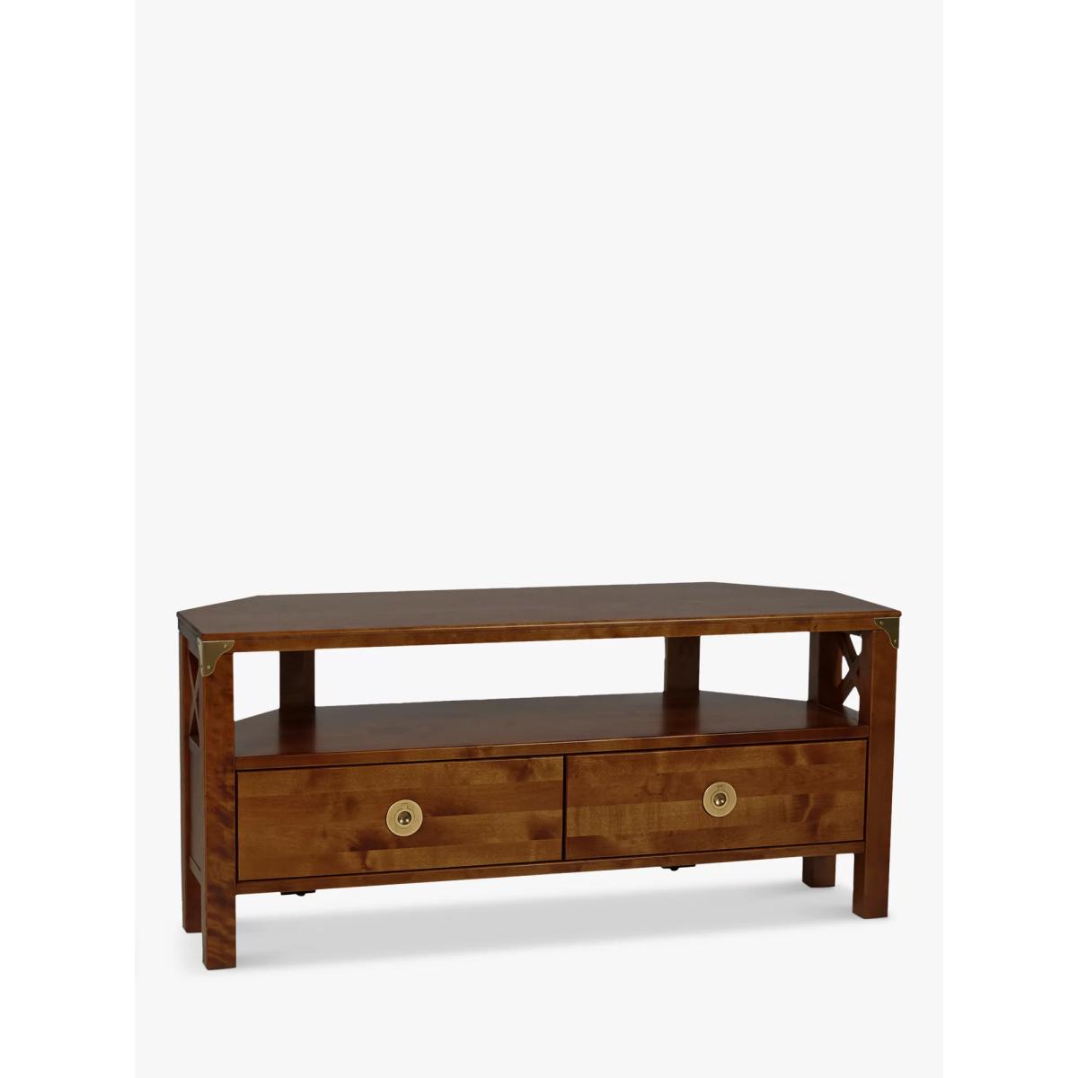 Made from solid birch and birch veneers with a hand-applied patina to enhance its natural grains and knots, this compact corner TV stand is a great option if you're short on space. With two drawers and an open-back shelf section, there's a useful amount of storage space and while its design may suit traditional interiors, note the accents of antique-brass hardware. This gives it a retro, Art Deco edge and complements the warm colour and tone of the wooden frame. Want to see it first? You may want to see and get a feel for the furniture in one of our shops before ordering. We'll be able to tell you where the range you'd like to view is on display.