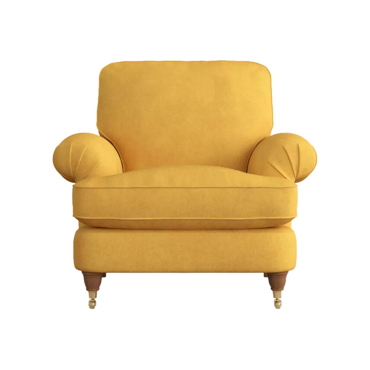 I love this armchair for its classic yet versatile style, making it a great statement piece in both traditional and contemporary interiors. The soft, mustard yellow fabric adds warmth and personality to a room, while the teak legs provide a natural, refined finish that complements wood flooring or other natural textures. It works particularly well in living rooms, reading nooks, or even bedrooms that could benefit from a pop of colour and comfortable seating. Practical styling tips include pairing it with neutral throws and cushions to keep it looking fresh or mixing it with patterned textiles for added visual interest. Its substantial form lends itself to being paired with other vintage or mid-century furniture for a cohesive look.