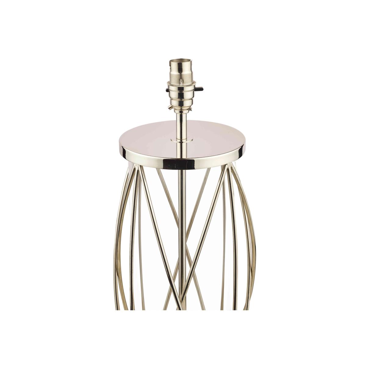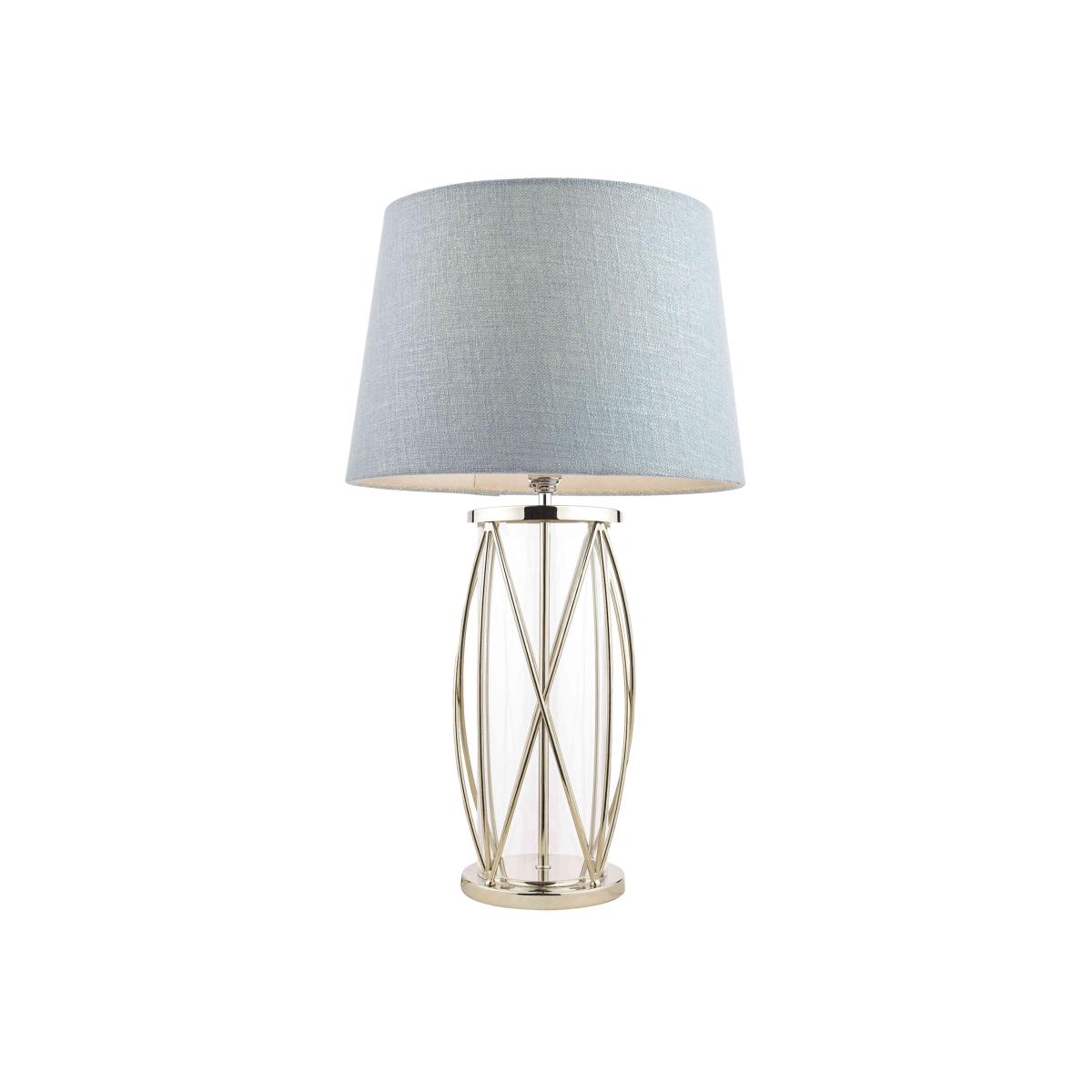 Elegant through and through, this contemporary glass and metal table lamp combines a modern aesthetic with a touch of traditional style in its lantern-inspired base. Why you'll love it Elegant contemporary table lamp enhances any style of living room. Lamp base recalls traditional lanterns. Cylindrical clear glass base. Constructing curved latticework surrounded in vintage polished nickel. Silver linen lampshade. This large table lamp is part of the Laura Ashley lighting collection. What you need to know Made of mild steel and glass. Linen lampshade. Supplied with 150 cm cable. Requires 1 x BC (B22) max. 60 W bulb (not included). Please do not exceed this wattage. To clean, wipe gently with a soft dry cloth. Do not use polishes or abrasive cleaning products. Disconnect from the power outlet before cleaning or changing the bulb. Dimensions including shade Height: 65 cm (26 in). Diameter: 41 cm (16 in).