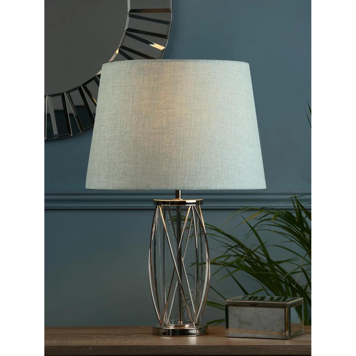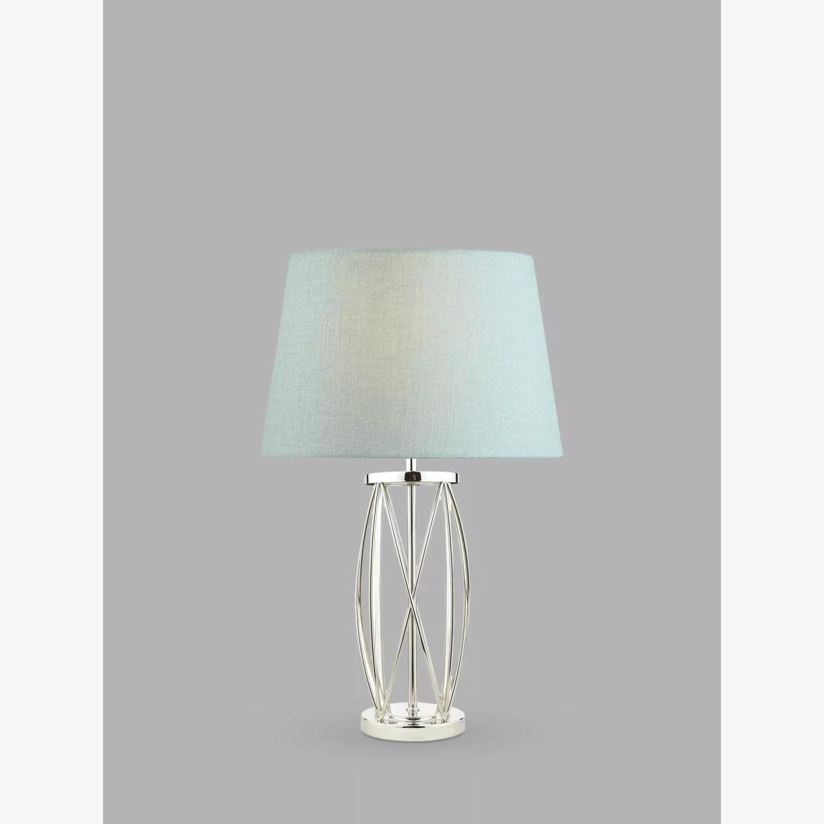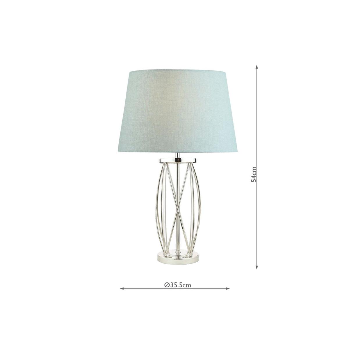 The Laura Ashley Beckworth petite table lamp is designed in a contemporary lantern style. A curved vintage, polished nickel, lattice encasing a clear glass cylinder gives this table lamp a modern style that enhances any interior theme. The base is paired with the Laura Ashley Bacall linen shade, finished in duck egg blue.