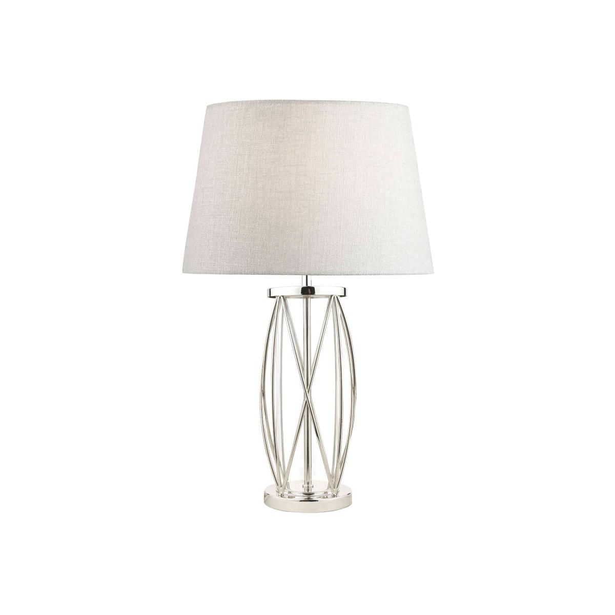 This contemporary glass and metal lantern-inspired table lamp combines a modern aesthetic with a touch of traditional style. Part of the Laura Ashley lighting range. Why you'll love it Elegant contemporary table lamp enhances any style of living room. Lamp base recalls traditional lanterns. Cylindrical clear glass base. Constructing curved latticework surrounded in vintage polished nickel. Silver linen lampshade. This small table lamp is part of the Laura Ashley lighting collection. What you need to know Mild steel and glass base. Linen lampshade. Supplied with 130 cm cable. Requires 1 x BC (B22) max. 60 W bulb (not included). Please do not exceed this wattage. To clean, wipe gently with a soft dry cloth. Do not use polishes or abrasive cleaning products. Disconnect from the power outlet before cleaning or changing the bulb. Dimensions including shade Height: 57 cm (23 in). Diameter: 31 cm (13 in). Item code: LBECTL----001
