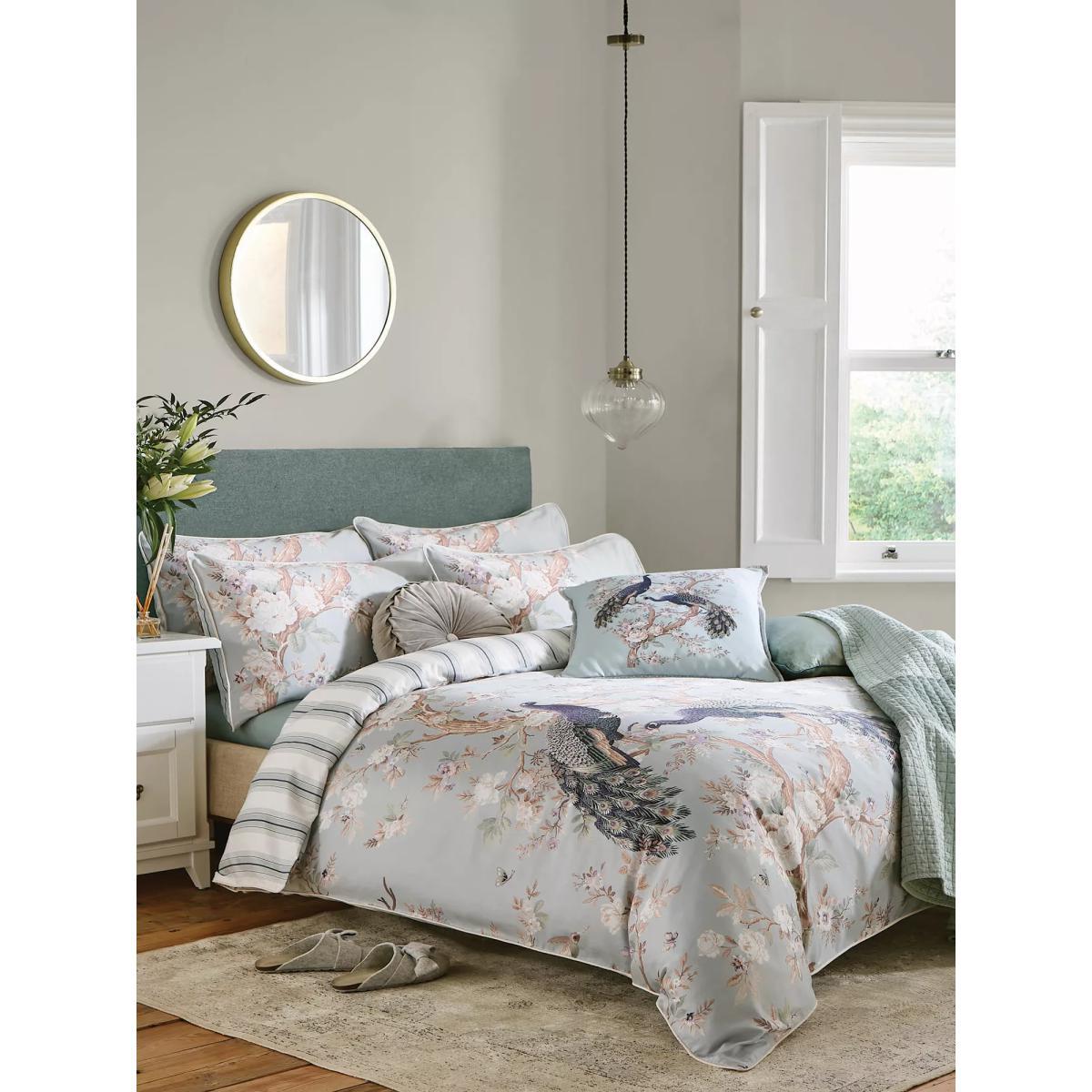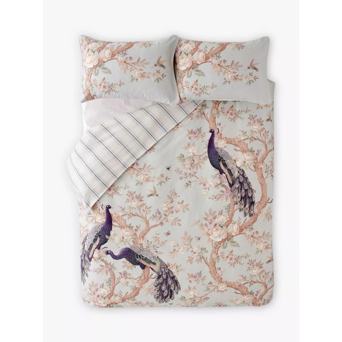 Classically ornate, the Belvedere print features elegant peacocks and timeless florals and is the perfect addition to luxurious spaces. Belvedere is made from 220 thread count cotton sateen and finished with a piped edge. This Laura Ashley duvet cover set is reversible so that you can style it two ways. Each set comes with 2x standard pillowcases. Have you thought about sheeting? Shop. Bedding sizes To fit duvet/pillow size (cm) Standard pillowcase, L75 x W50cm Double duvet cover, L200 x W200cm King duvet cover, L220 x W225cm Super king duvet cover, L220 x W260cm