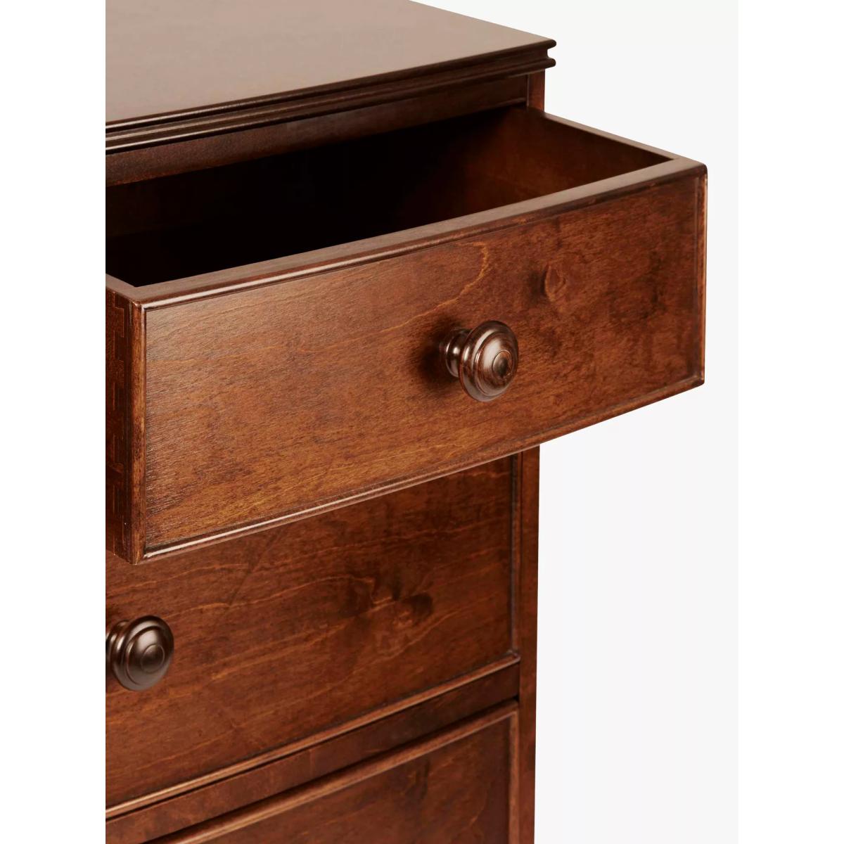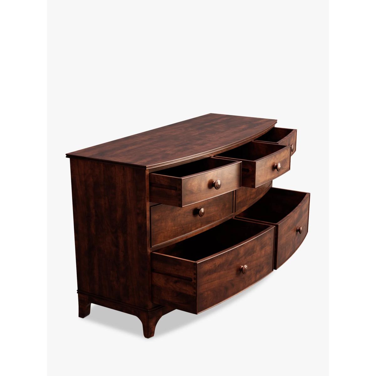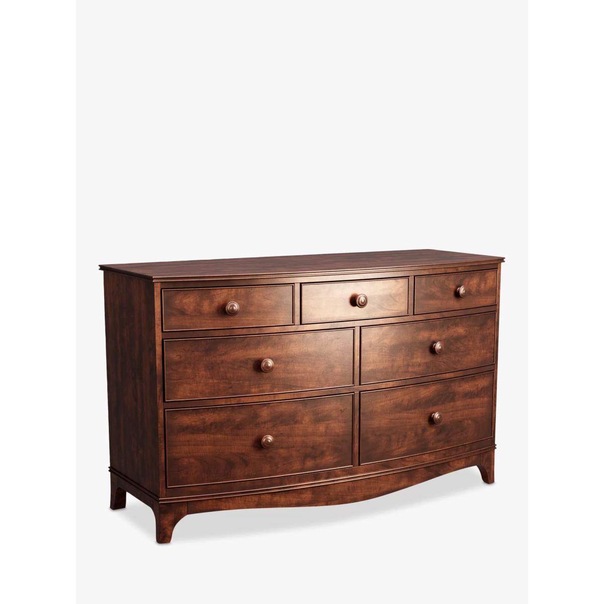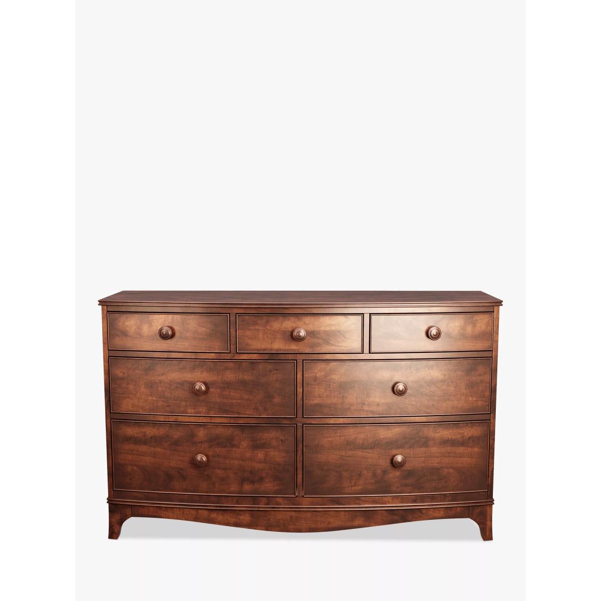 Bedroom storage with a stately edge. Crafted from solid birch wood with high-quality birch veneers, this chest of drawers is made with strong dovetail joints and earns design points for Georgian curves and turned wood details. It's finished in a low maintenance lacquer and seven drawers provide all the storage space you'll need. And as it's low and wide in shape, you can also use the surface top to display favourite photos or style it with a table lamp and other decorative accessories. Want to see it first? You may want to see and get a feel for the furniture in one of our shops before ordering. We'll be able to tell you where the range you'd like to view is on display.