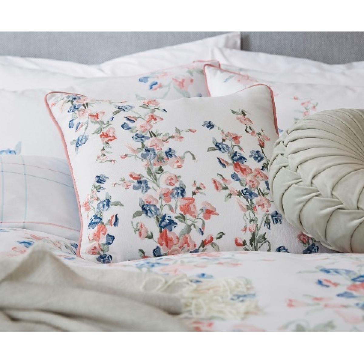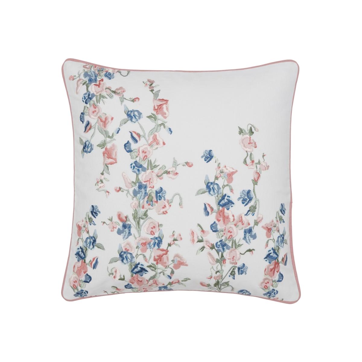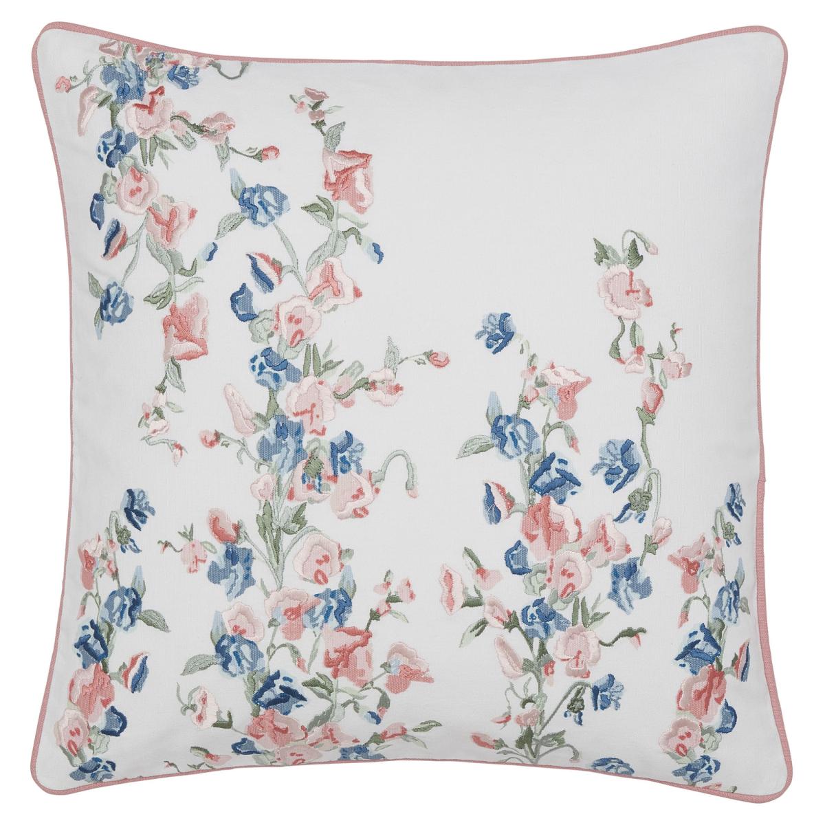 This is a pretty Laura Ashley cushion features intertwined bunches of sweet peas cast amongst scrolling tendrils and falling leaves. With a delicate soft pinks and brighter blue colour palette mixed its stunning embroidery detail and piped edge finish gives it a touch of luxury. Dimensions - H 45cm x W 45cm x D 10cm Sponge clean only 100% Cotton All screens vary in colour reproduction and whilst every effort has been made to display the colour as accurately as possible it is for guidance only.