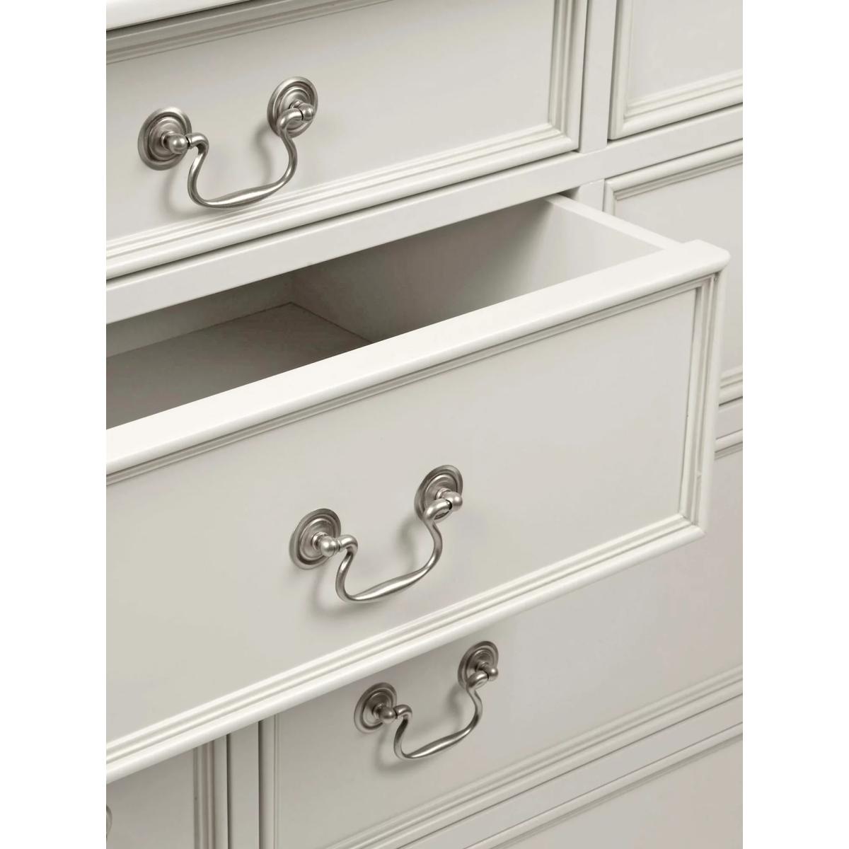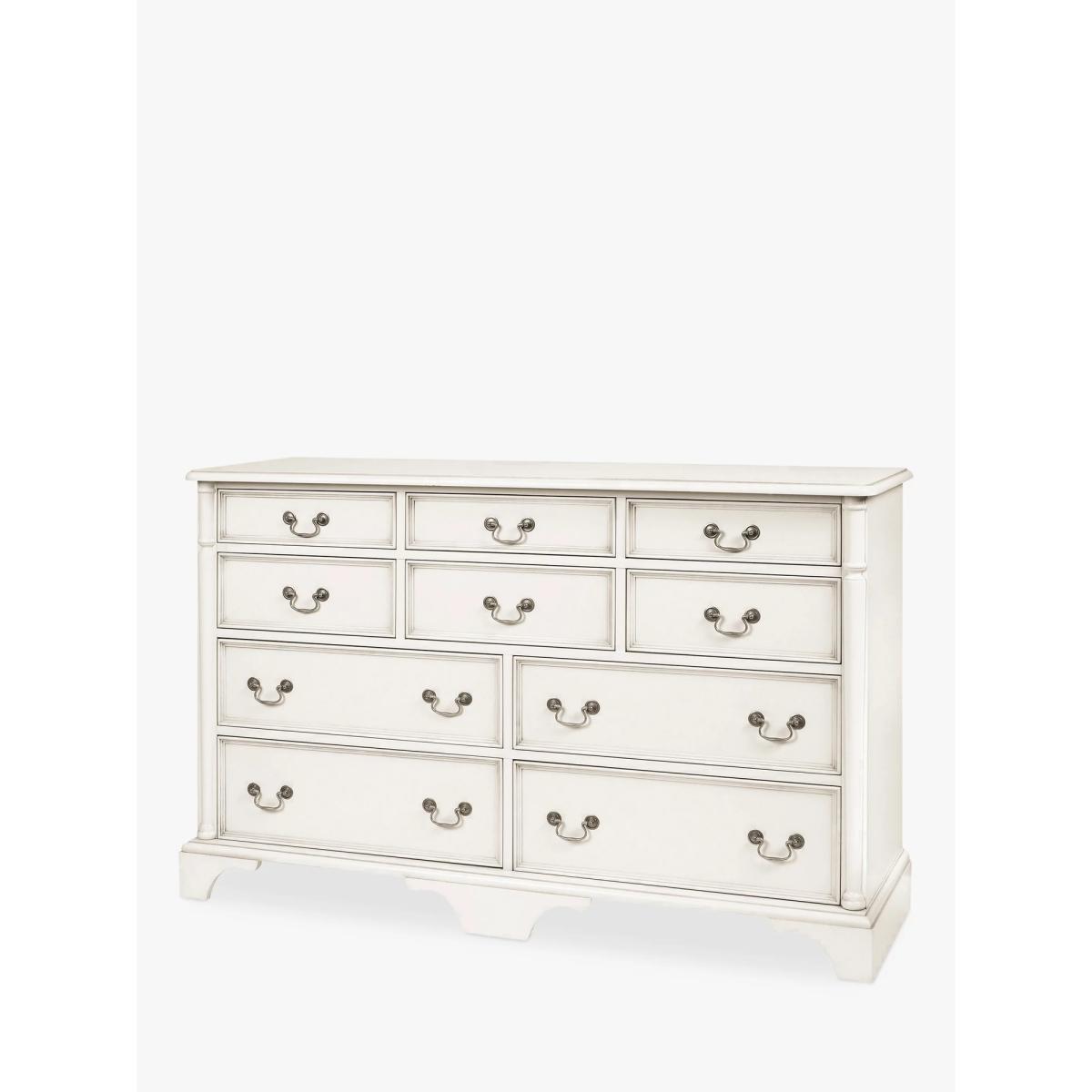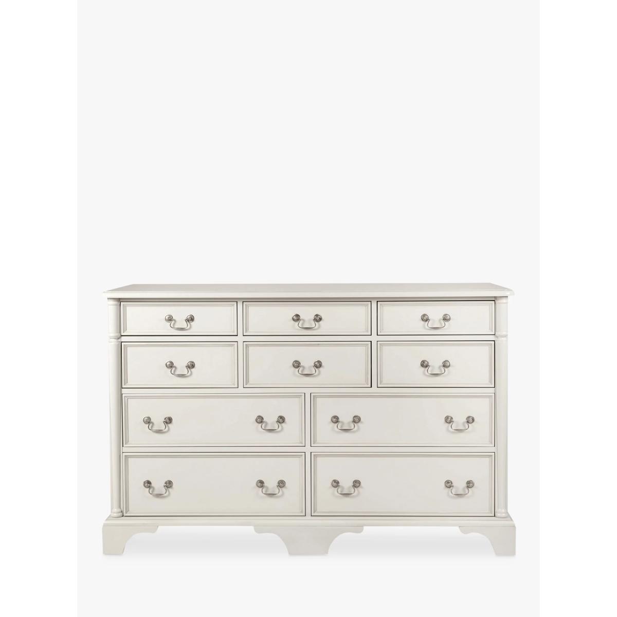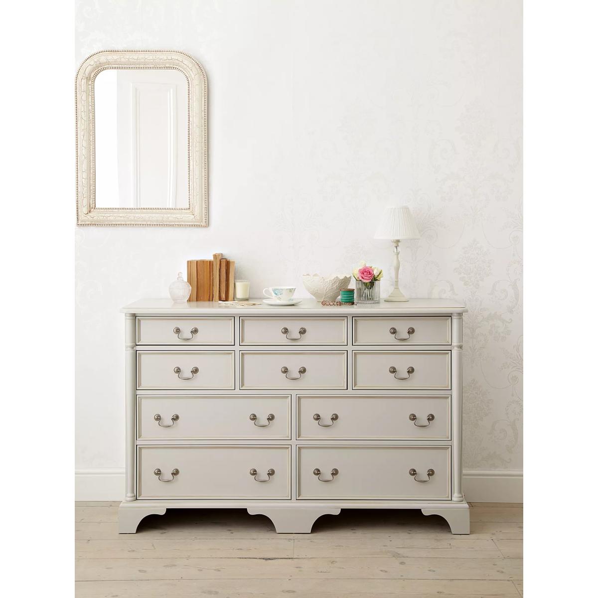 Turned wooden legs and panelling detail honours the timeless aesthetic of this chest of drawers, which is made from sturdy timbers. There's plenty of storage space thanks to a total of 10 drawers and its antique-style handles enhances its traditional look. It's painted and finished with a hand-applied patina to create an aged effect, as well as a protective lacquer. Want to see it first? You may want to see and get a feel for the furniture in one of our shops before ordering. We'll be able to tell you where the range you'd like to view is on display.