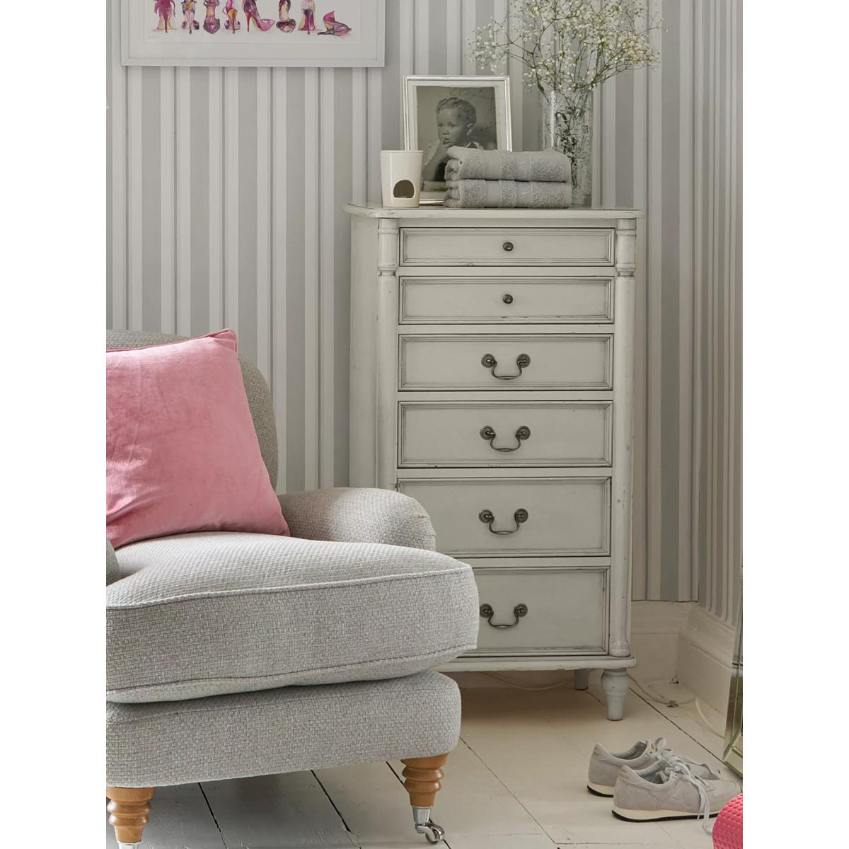 Turned wooden legs and panelling detail honours the timeless aesthetic of this chest of drawers, which is made from sturdy timbers. With a tall and narrow profile, it's well-suited in rooms which have limited floor space and six drawers in total provide a helpful amount of storage space. Antique-style handles complement its aged-effect finish which has been created from a hand-applied patina. Want to see it first? You may want to see and get a feel for the furniture in one of our shops before ordering. We'll be able to tell you where the range you'd like to view is on display.