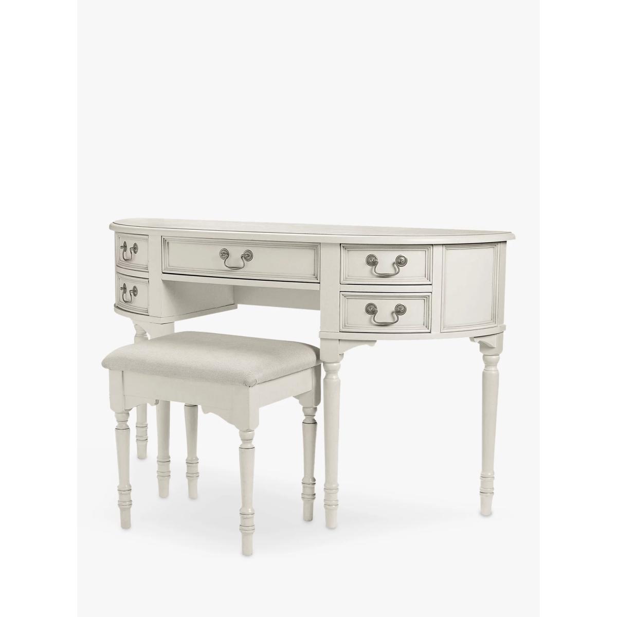 Turned wooden legs and panelling detail honours the timeless aesthetic of this dressing table, which is supplied with a coordinating stool. Made from a combination of sturdy timbers, it provides the perfect place to get ready each day and five drawers means you can safely store make up and jewellery. Both the table and stool are painted and finished with a hand-applied patina which creates an aged effect. Want to see it first? You may want to see and get a feel for the furniture in one of our shops before ordering. We'll be able to tell you where the range you'd like to view is on display.