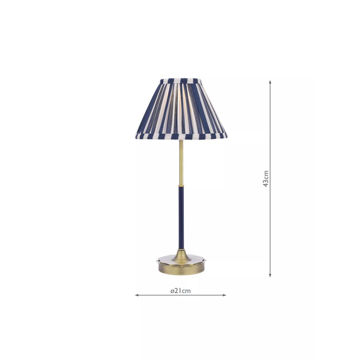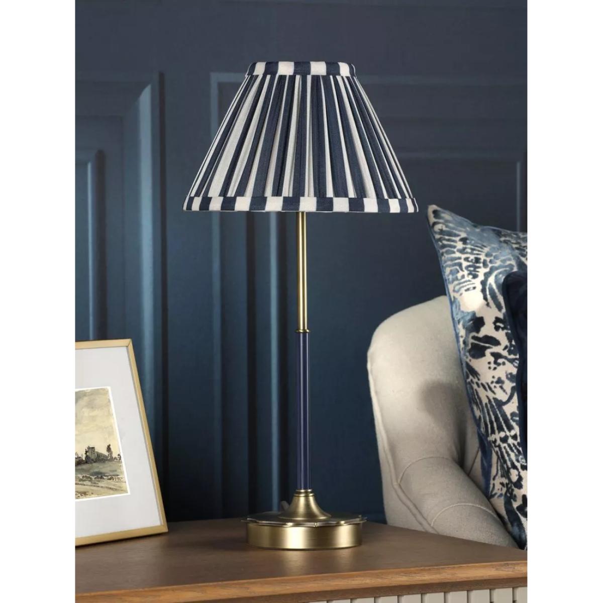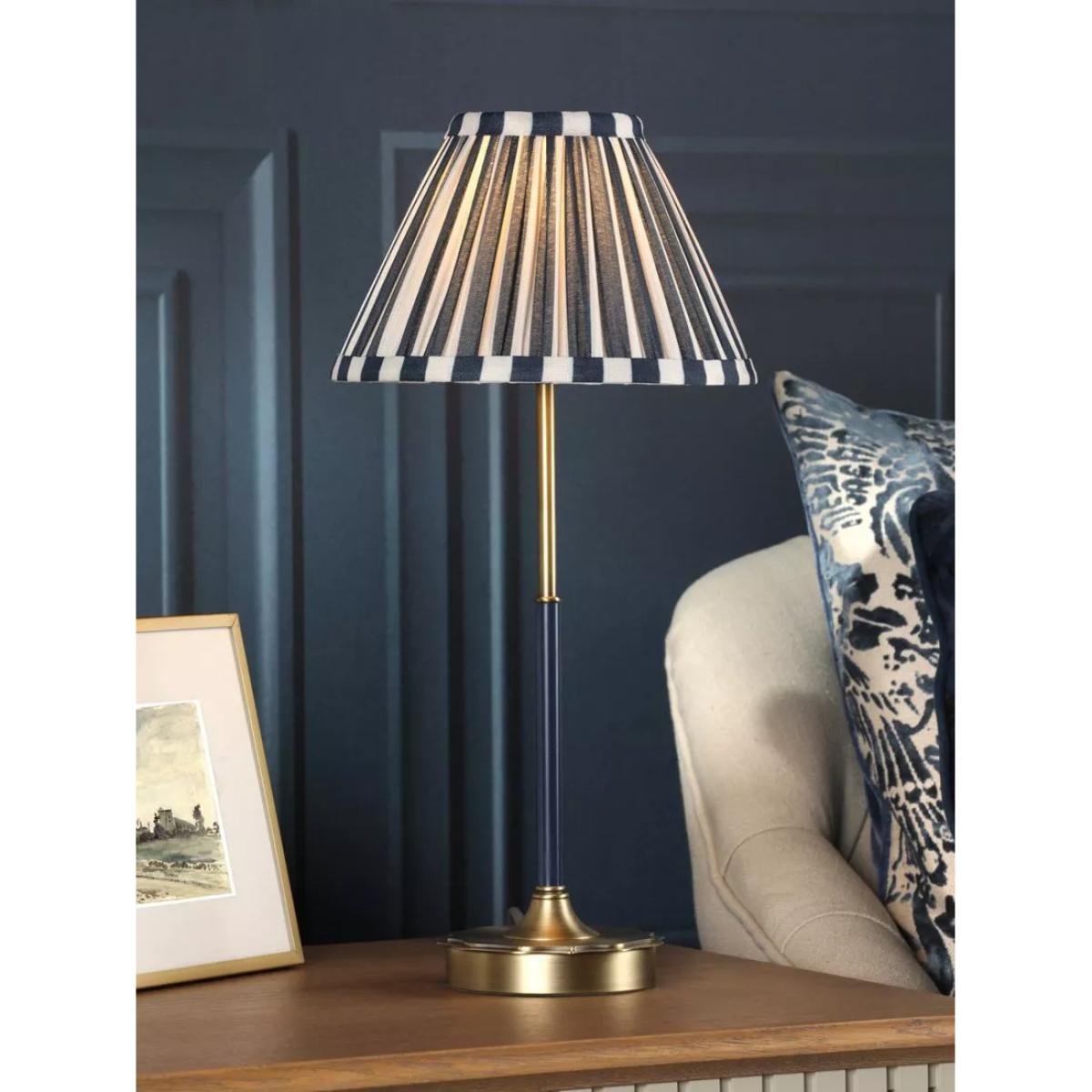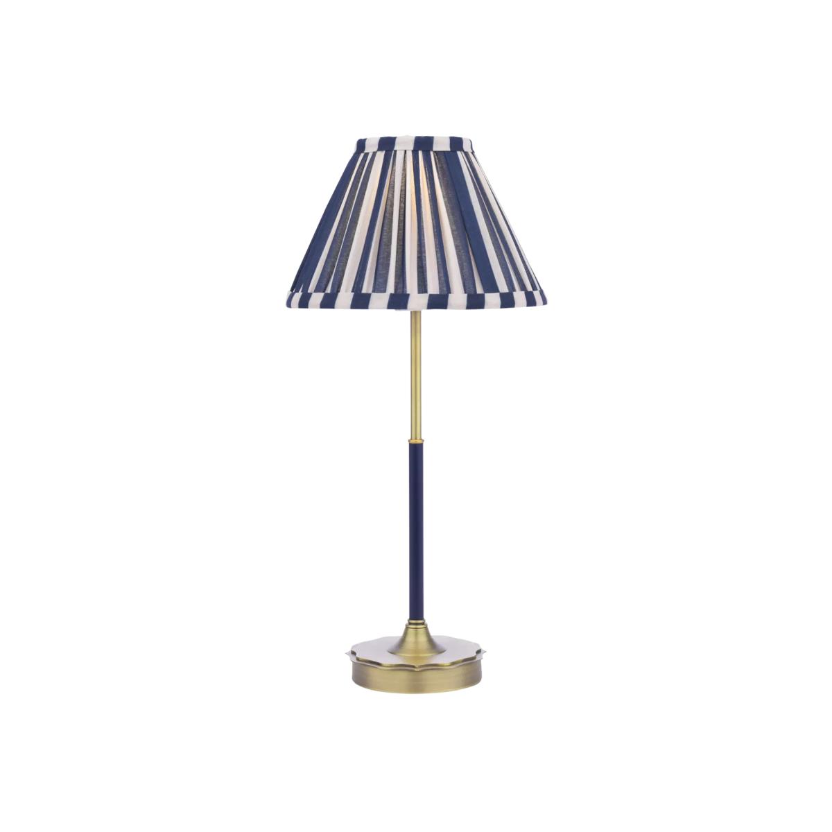 Elegant and timeless, the Laura Ashley Denwick Table Lamp features a dual-toned navy and cream striped shade that offers a classic yet contemporary look. Crafted with an antique brass base and detailing, this lamp exudes subtle vintage charm, elevating any room. Whether placed on a nightstand, end table or console, this lamp makes a stylish statement as a standalone piece or when coordinated with Laura Ashley's matching range for a cohesive look. The Denwick comes with a bespoke cotton mix pleated striped shade.