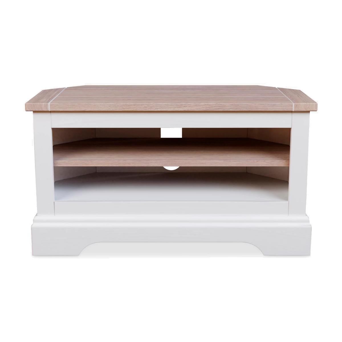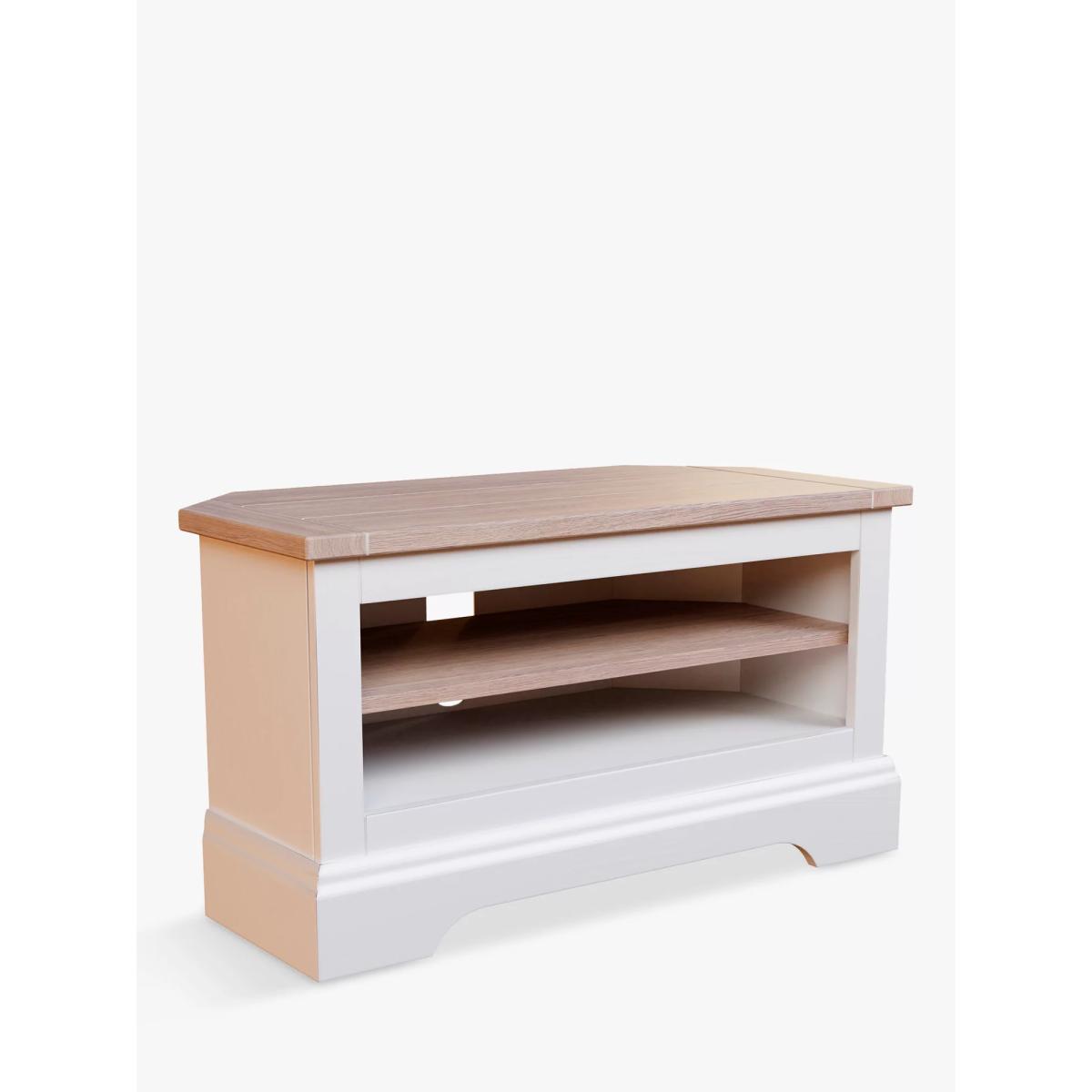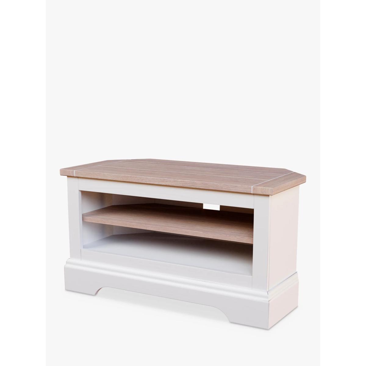 A compact and practical corner TV stand, built from a combination of tough timbers which includes a natural ash wood top. Painted with lightly distressed edges to add character, it features an adjustable shelf and a large port at the rear to manage media console cables. Want to see it first? You may want to see and get a feel for the furniture in one of our shops before ordering. We'll be able to tell you where the range you'd like to view is on display.