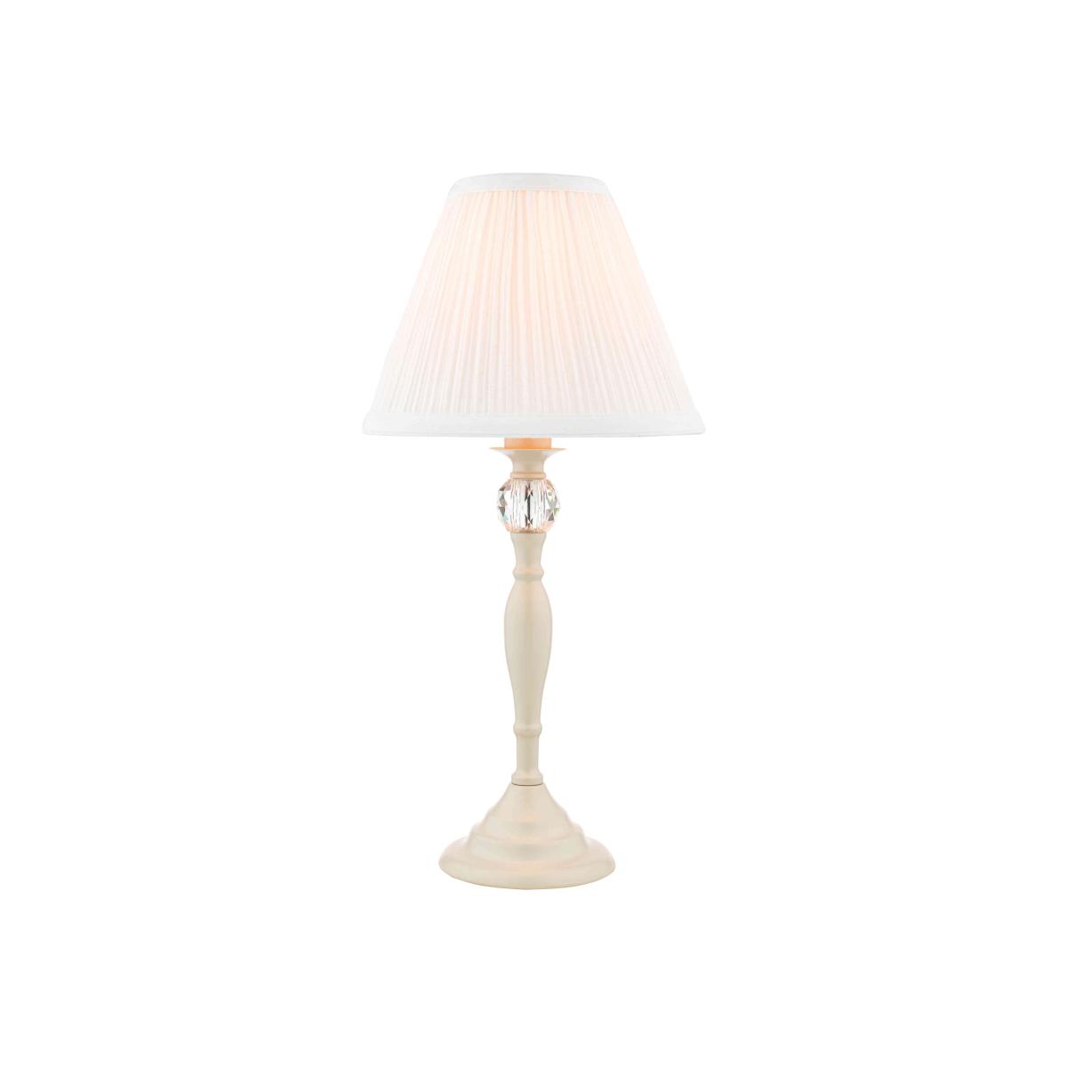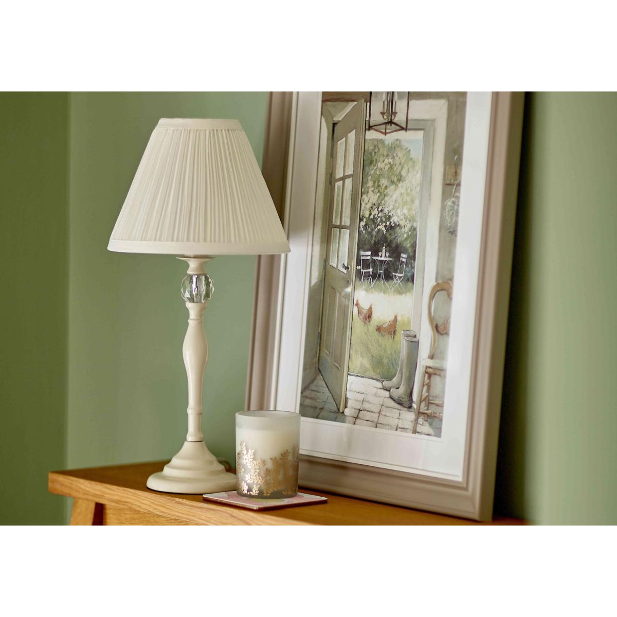 Simple and elegant, this table lamp is based on a traditional turned wood spindle and has an on-trend satiny painted finish. Finished with a glass finial and a pleated lampshade. Why you'll love it This elegant table lamp has a slender spindle-like base. Gently curved with a satin painted finish in cream. Neatly finished with a faceted glass finial. Pleated cotton lampshade in a soft ivory colour. This table lamp is part of the Laura Ashley lighting collection. What you need to know Made of crystal glass and mild steel. Cotton blend lampshade. Supplied with 150 cm cable. Requires 1 x E14 (SES) max. 40 W bulb (not included). Please do not exceed this wattage. To clean, wipe gently with a soft dry cloth. Do not use polishes or abrasive cleaning products. Disconnect from the power outlet before cleaning or changing the bulb. Dimensions including shade Height: 43 cm (17 in). Diameter: 21 cm (9 in).