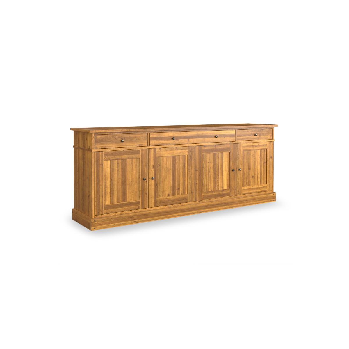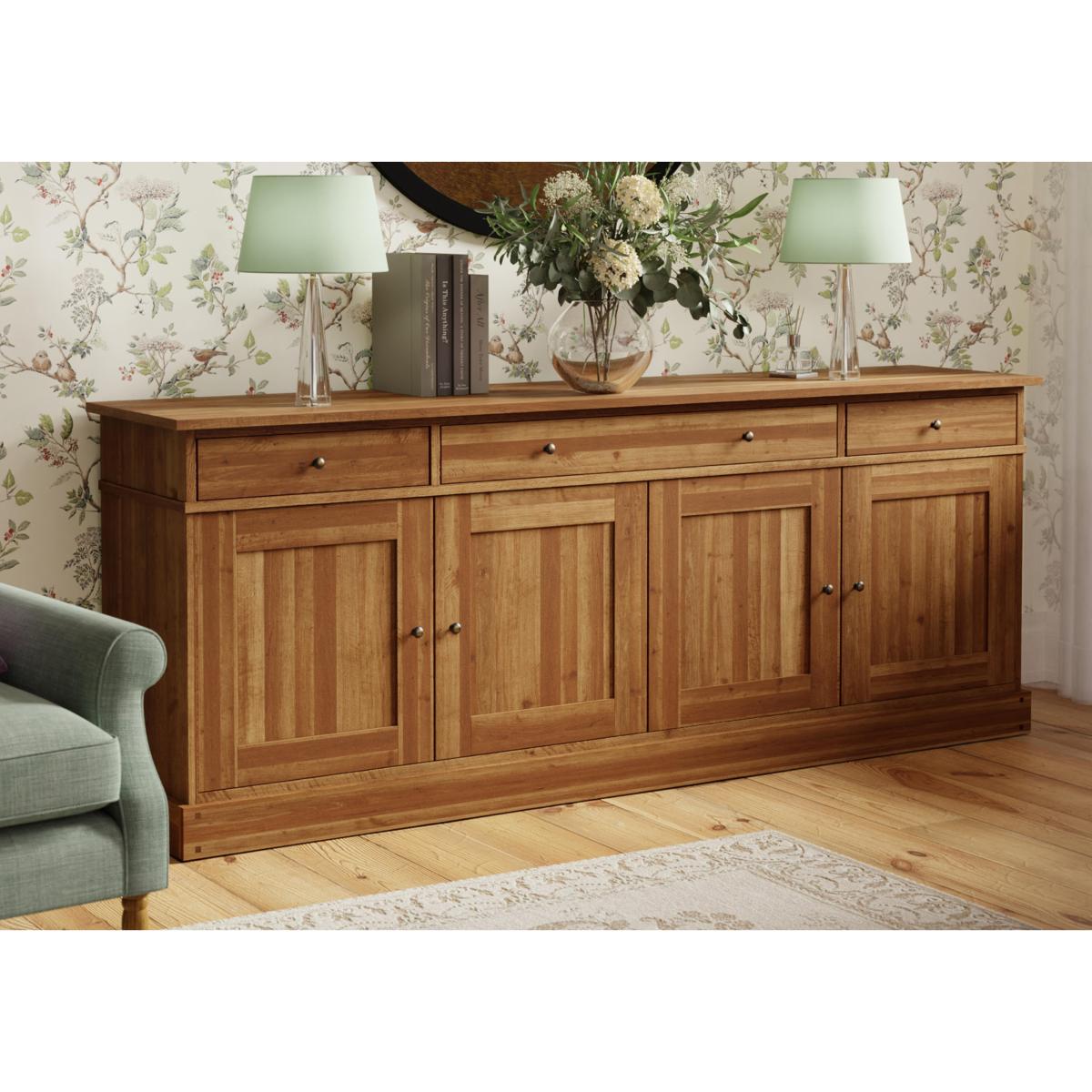 Discover the Laura Ashley Garrat range – a timeless collection of expertly crafted furniture made from solid birch. With its warm finishes, antique brass-finish handles and classic design, each piece adds charm and practicality to your home. Whether you’re updating your dining room, living space or hallway, Garrat offers elegant storage and style to suit every setting. Available in chestnut and honey finishes to suit your space. A grand 4 door 3 drawer sideboard from Laura Ashley that boasts impressive storage in a timeless, panelled design. Why you'll love it Chic 4 door 3 drawer sideboard by Laura Ashley. Crafted with care from solid birch. Neat storage in both drawers and behind doors. Antique brass-finish handles add charm. Available in two finishes: chestnut or honey. Part of the Laura Ashley Garrat collection. What you need to know Made from solid birch and birch veneers. Soft-close doors and drawers. Wipe clean with a damp cloth. We recommend using coasters and placemats at all times. Item code: LAG-4SB-CHE-001