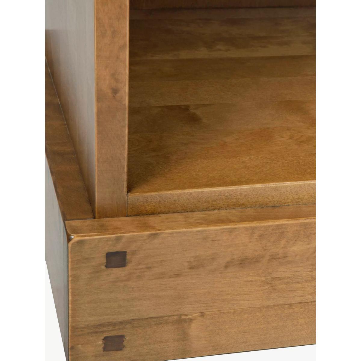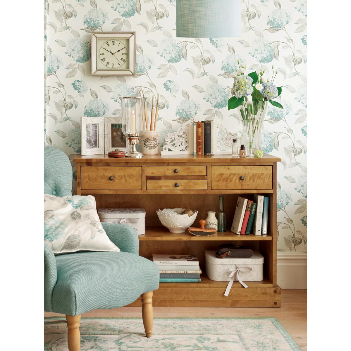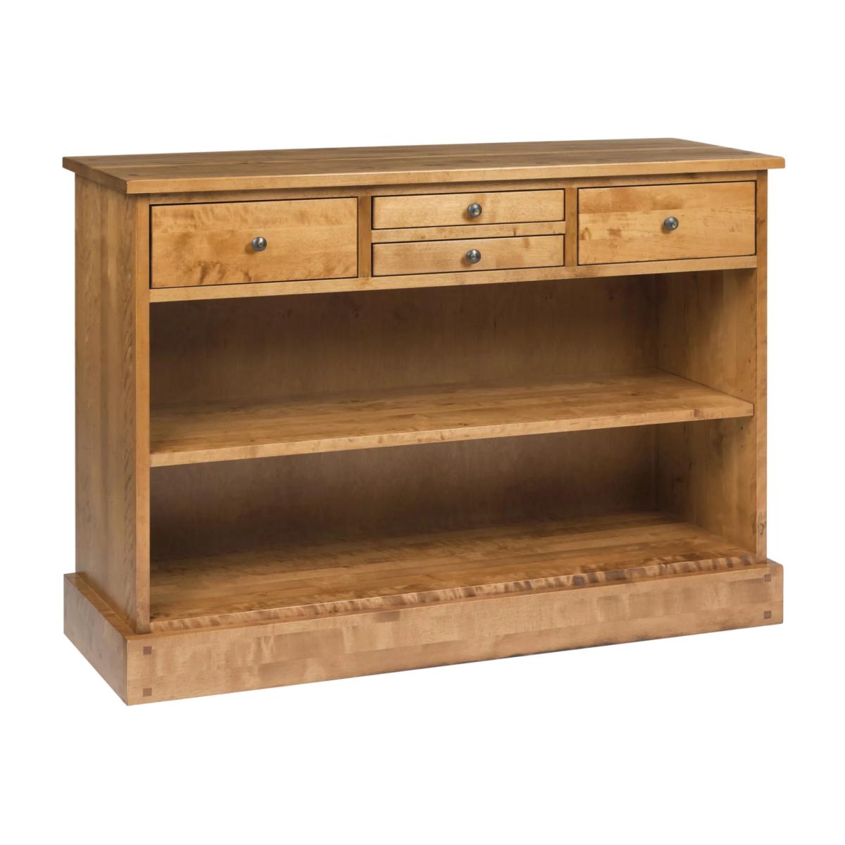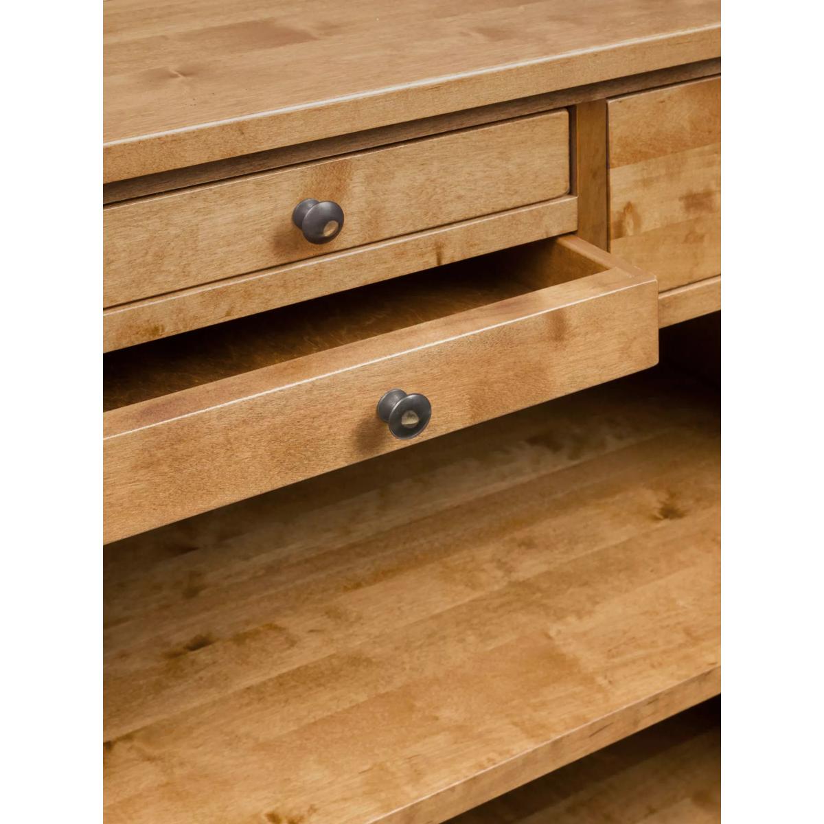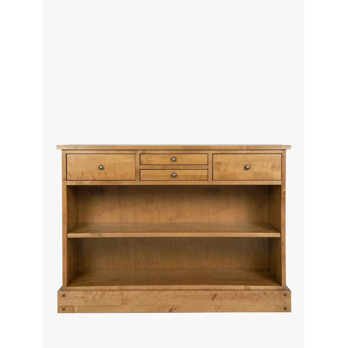 Crafted from predominantly solid birch but with some birch veneer modern materials, this console table is a useful addition to suit any decor. It benefits from four drawers - two small and two large - and in the open section below there is a fixed shelf. It has a rippled top and is stained to help enhance the natural wood effects. Brass effect fittings give it a truly authentic look. Want to see it first? You may want to see and get a feel for the furniture in one of our shops before ordering. We'll be able to tell you where the range you'd like to view is on display.
