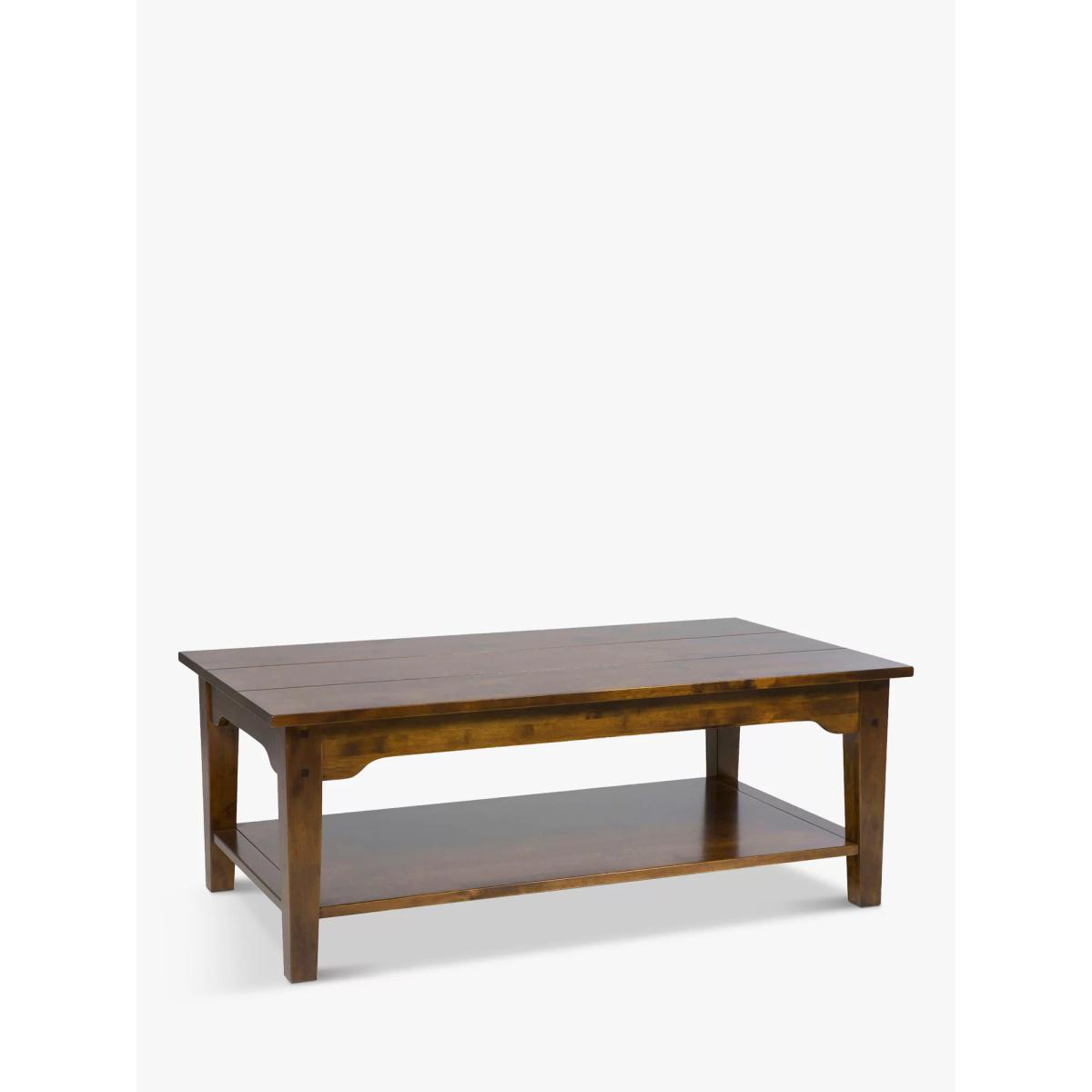 A solid, well-proportioned coffee table that's ready to be styled in the centre of your living room. Fully assembled, it's made from solid birch with high-quality birch veneers adding to its sturdiness and it features a fixed shelf for extra storage, or even just stashing away the TV remotes. We like how its stained finish brings out the natural colour variations of the wood and enhances its authentic period look. Want to see it first? You may want to see and get a feel for this piece of furniture in one of our shops before ordering. We'll be able to tell you where the range you'd like to view is on display.