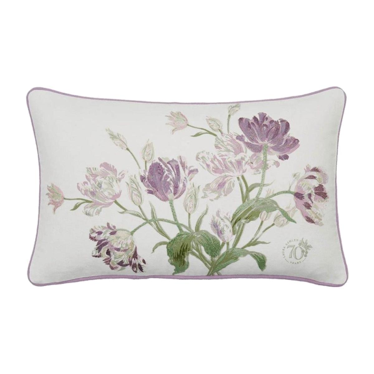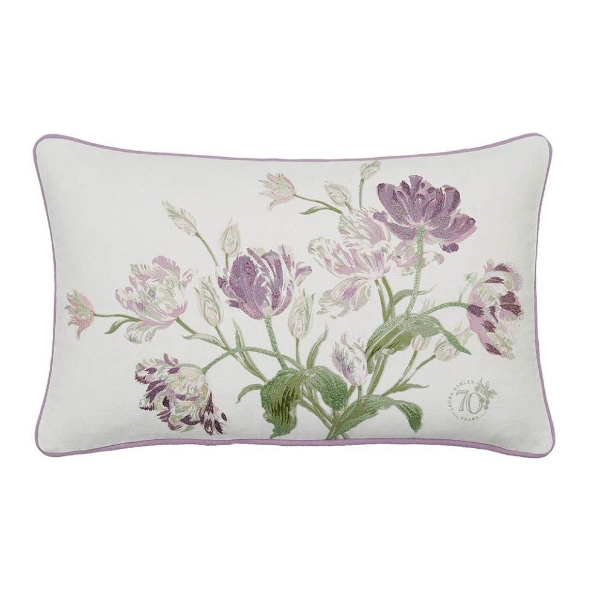 Celebrate 70 Years of Laura Ashley with this classic tulip design from the archive. Printed onto 100% cotton with embroidery details, this cushion has been coloured in soft lilacs and greens bringing the outside in. This stunning cushion comes filled with a feather pad and finished with a matching piped edge. Available sizes: 30x50cm Aftercare: Spot Clean only