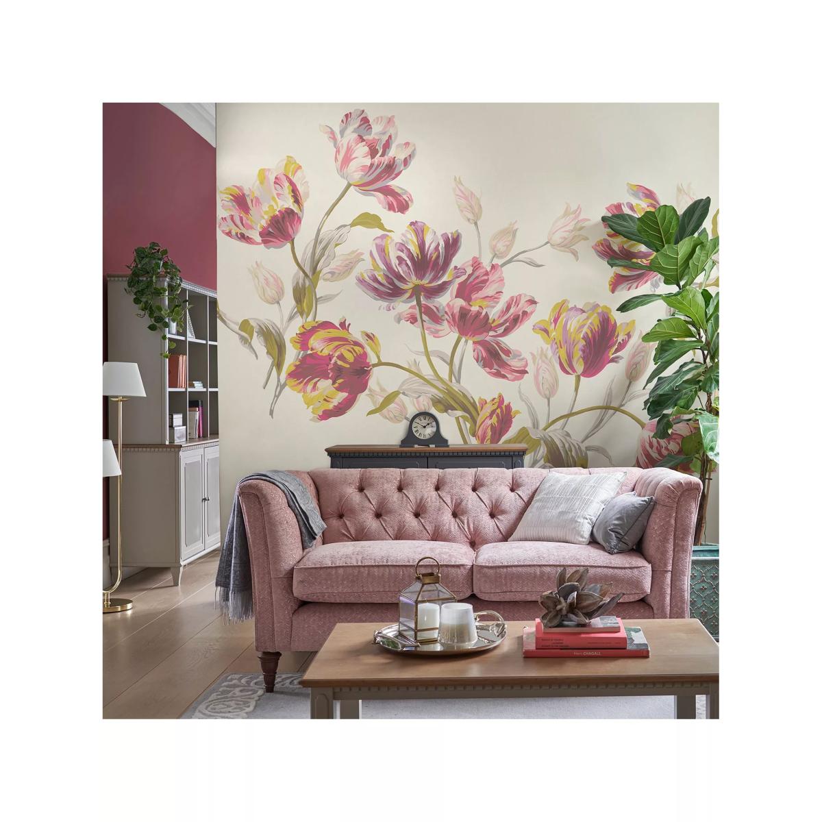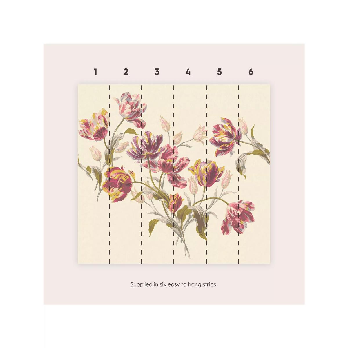 A classic Laura Ashley design, featuring gorgeous bold tulips in cranberry hues, blownup to mural size to create a beautiful centrepiece. This mural comes on one roll with 6 referenced panels.
