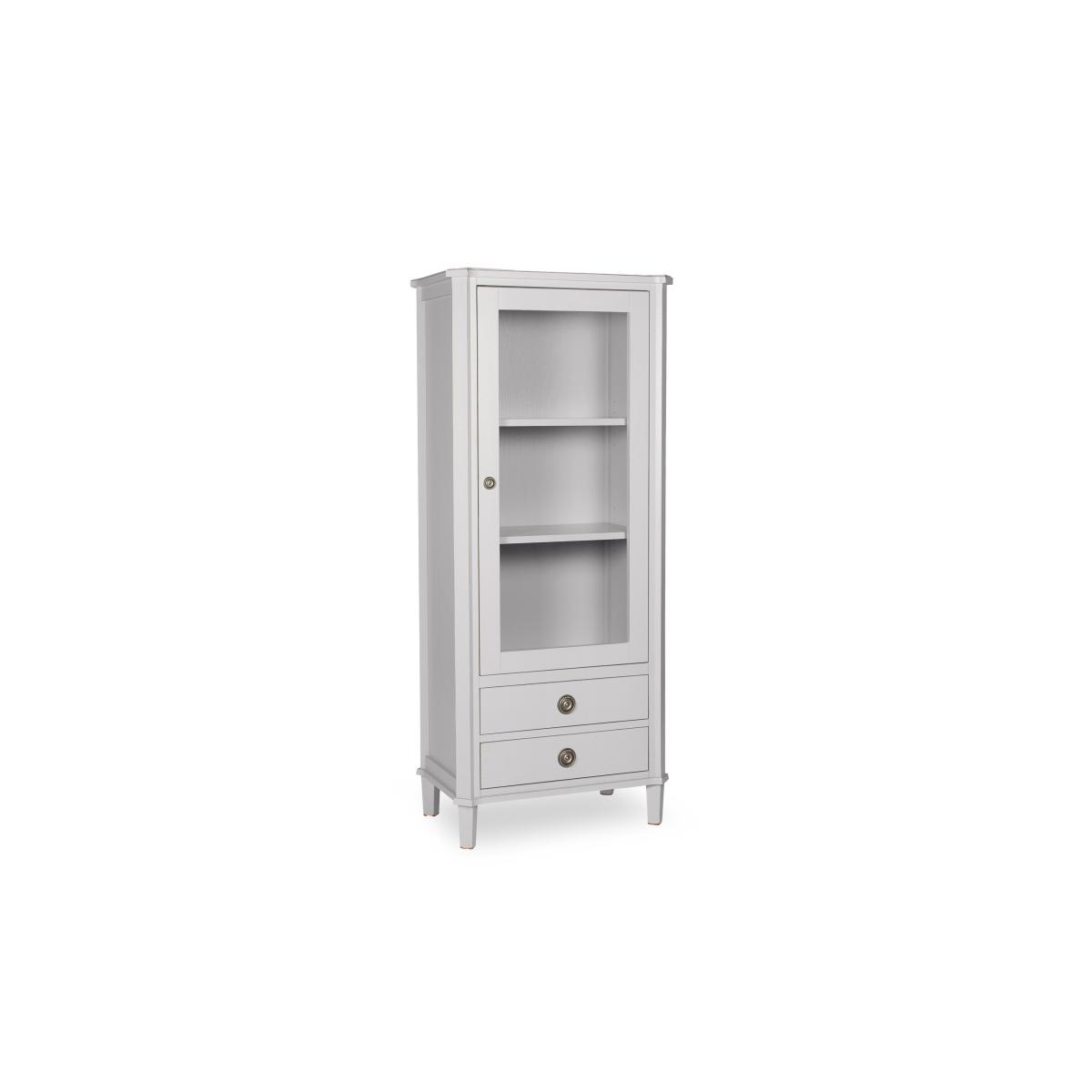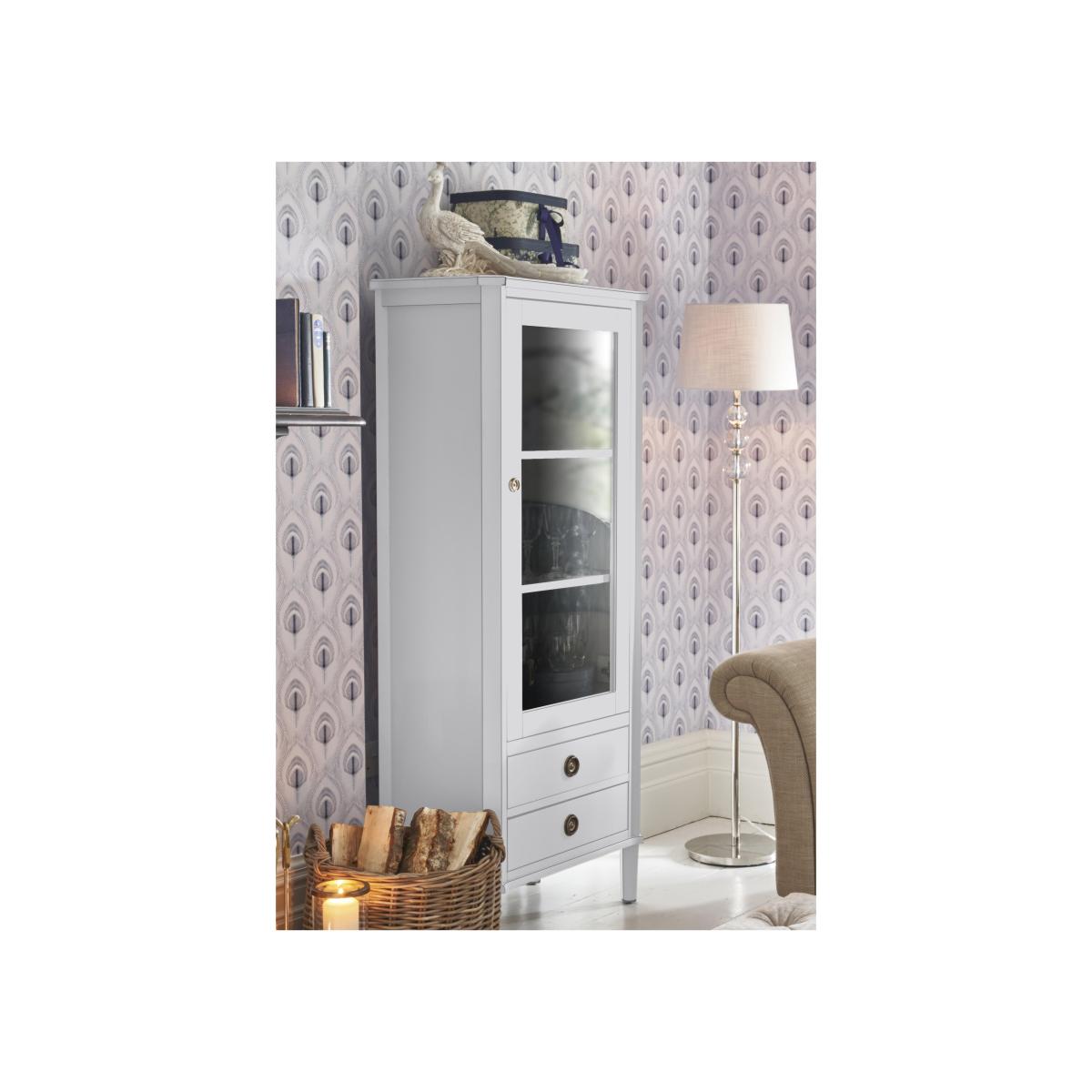Discover the enduring vintage charm of the Laura Ashley Henshaw range. This beautifully painted collection features sideboards, console tables, TV units, chests, coffee tables, nests and more. Each piece is carefully crafted from solid wood with quality veneers and finished in a choice of two stylish shades with a delicate distressed finish. Understated brass-effect ring handles bring refined detail while adjustable shelving and spacious drawers offer plenty of flexible storage for every room of your home. Whether styled in your hallway, lounge, bedroom or dining room, this range blends timeless charm with effortless functionality. Show off your collection of ornaments with this lovely 1 door 2 drawer display unit by Laura Ashley. We love its distressed painted finish and brass-effect handles. Why you'll love it 1 door 2 drawer triple display unit by Laura Ashley for vintage design lovers. Crafted from solid oak and oak veneers. Beautiful vintage-style painted finish. Distressed brass-effect handles add character. Glass-fronted doors display your ornaments. 3 adjustable shelves for books, plants and trinkets. Available in two classic finishes: black or pale steel. Part of the Laura Ashley Henshaw collection. What you need to know Made from solid oak with oak veneers. Wipe clean with a damp cloth. We recommend using coasters and placemats at all times. Item code: LAH-DISPPS-001