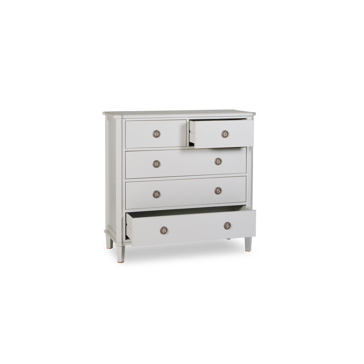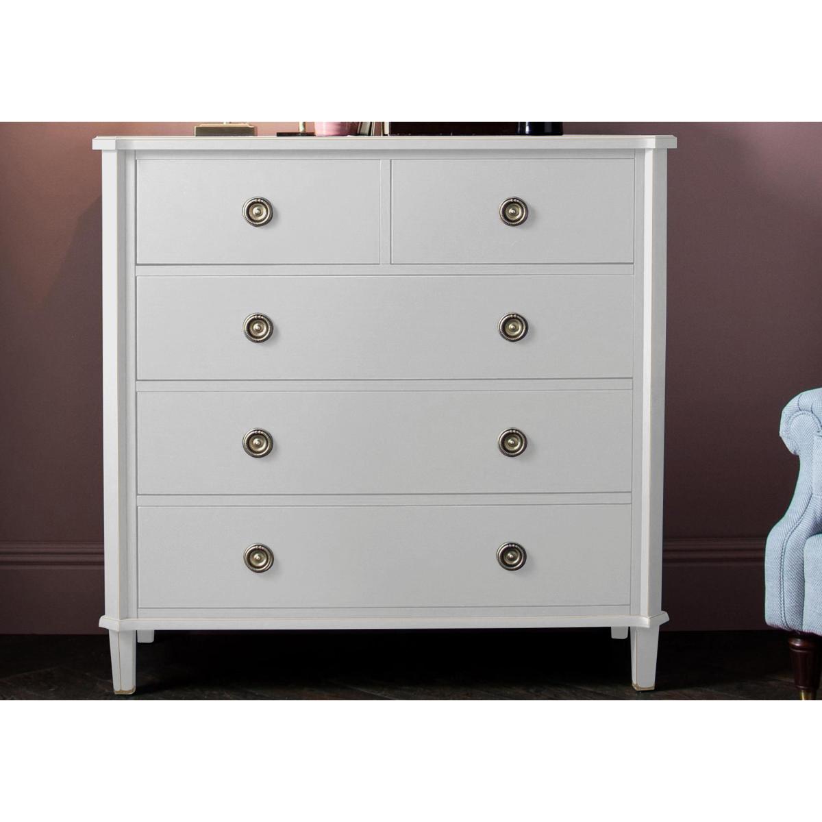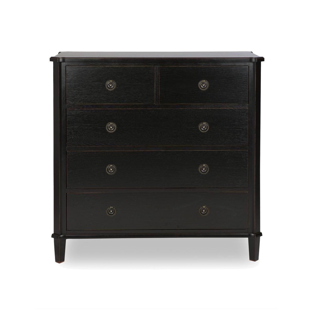 Discover the enduring vintage charm of the Laura Ashley Henshaw range. This beautifully painted collection features sideboards, console tables, TV units, chests, coffee tables, nests and more. Each piece is carefully crafted from solid wood with quality veneers and finished in a choice of two stylish shades with a delicate distressed finish. Understated brass-effect ring handles bring refined detail while adjustable shelving and spacious drawers offer plenty of flexible storage for every room of your home. Whether styled in your hallway, lounge, bedroom or dining room, this range blends timeless charm with effortless functionality. Storage never looked so good with this timeless 2+3 drawer chest from Laura Ashley. Crafted from solid oak with oak veneers, it’s the perfect choice for modern and traditional interiors. Why you'll love it A classic 2+3 drawer chest by Laura Ashley. Crafted from solid oak and oak veneers. Beautiful vintage-style painted finish. 5 good-sized drawers to store clothes and bedding. Available in two classic finishes: black or pale steel. Part of the Laura Ashley Henshaw collection. What you need to know Made from solid oak with oak veneers. Wipe clean with a damp cloth. We recommend using coasters and placemats at all times. Item code: LAH-CHT-BLK-001