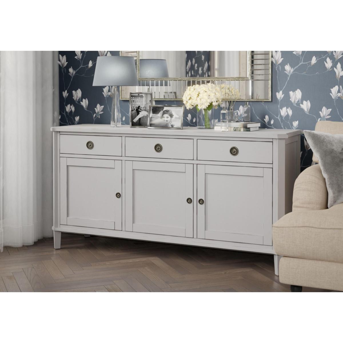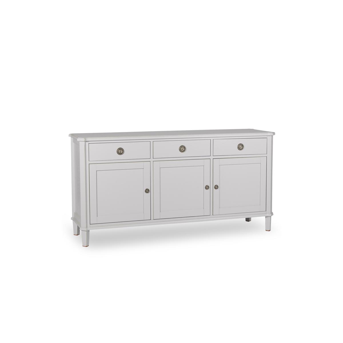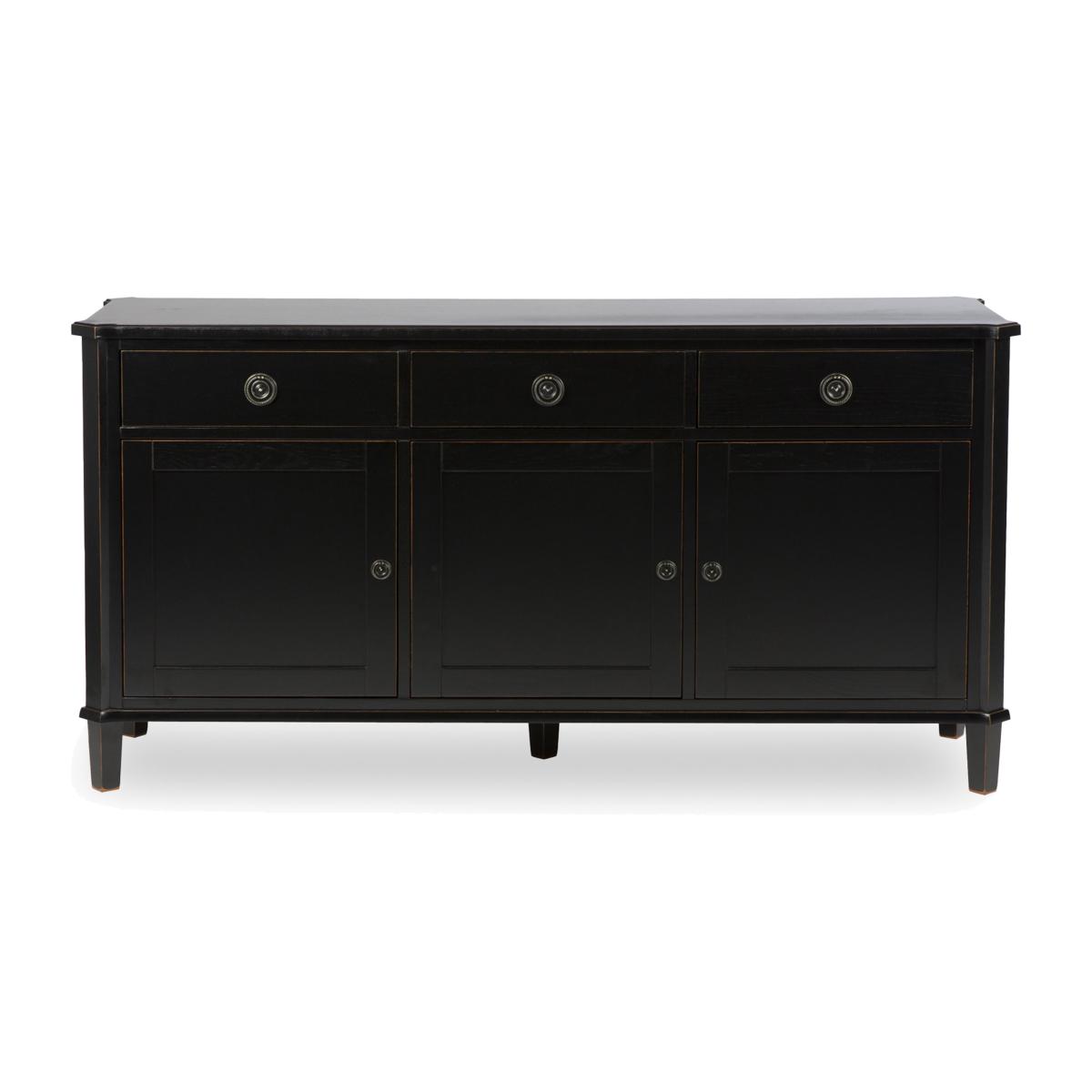Discover the enduring vintage charm of the Laura Ashley Henshaw range. This beautifully painted collection features sideboards, console tables, TV units, chests, coffee tables, nests and more. Each piece is carefully crafted from solid wood with quality veneers and finished in a choice of two stylish shades with a delicate distressed finish. Understated brass-effect ring handles bring refined detail while adjustable shelving and spacious drawers offer plenty of flexible storage for every room of your home. Whether styled in your hallway, lounge, bedroom or dining room, this range blends timeless charm with effortless functionality. Maximise your storage space with this vintage-style 3 door 3 drawer sideboard from Laura Ashley. It elevates any space with its timeless sophistication and distressed finish. Why you'll love it Elegant 3 door 3 drawer sideboard by Laura Ashley. Crafted from solid oak and oak veneers. Beautiful vintage-style painted finish. Distressed brass-effect handles add character. Adjustable shelving behind each door offers spacious storage. Available in two classic finishes: black or pale steel. Part of the Laura Ashley Henshaw collection. What you need to know Made from solid oak with oak veneers. Wipe clean with a damp cloth. We recommend using coasters and placemats at all times. Item code: LAH-3DSBBLK-001