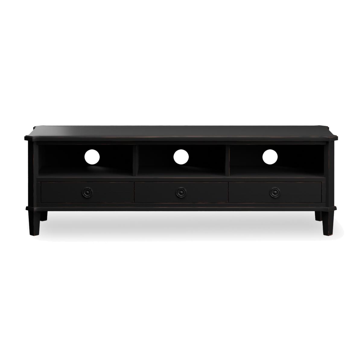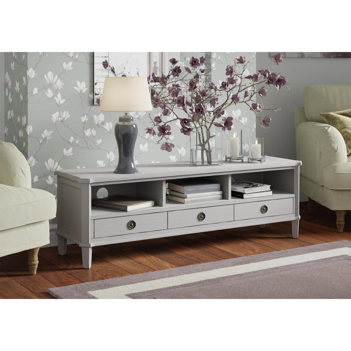 Discover the enduring vintage charm of the Laura Ashley Henshaw range. This beautifully painted collection features sideboards, console tables, TV units, chests, coffee tables, nests and more. Each piece is carefully crafted from solid wood with quality veneers and finished in a choice of two stylish shades with a delicate distressed finish. Understated brass-effect ring handles bring refined detail while adjustable shelving and spacious drawers offer plenty of flexible storage for every room of your home. Whether styled in your hallway, lounge, bedroom or dining room, this range blends timeless charm with effortless functionality. Upgrade your home entertainment system with this beautiful 3 drawer wide TV unit by Laura Ashley. Its beautiful aged-effect paintwork looks stunning in any interior. Why you'll love it A timelessly elegant 3 drawer wide TV unit by Laura Ashley. Crafted from solid oak and oak veneers. Beautiful vintage-style painted finish. 3 good-sized drawers to hide away remotes, wires and more. Designed for TVs with screens up to 70”. Available in two classic finishes: black or pale steel. Part of the Laura Ashley Henshaw collection. What you need to know Made from solid oak with oak veneers. Wipe clean with a damp cloth. We recommend using coasters and placemats at all times. Item code: LAH-TVU-BLK-001