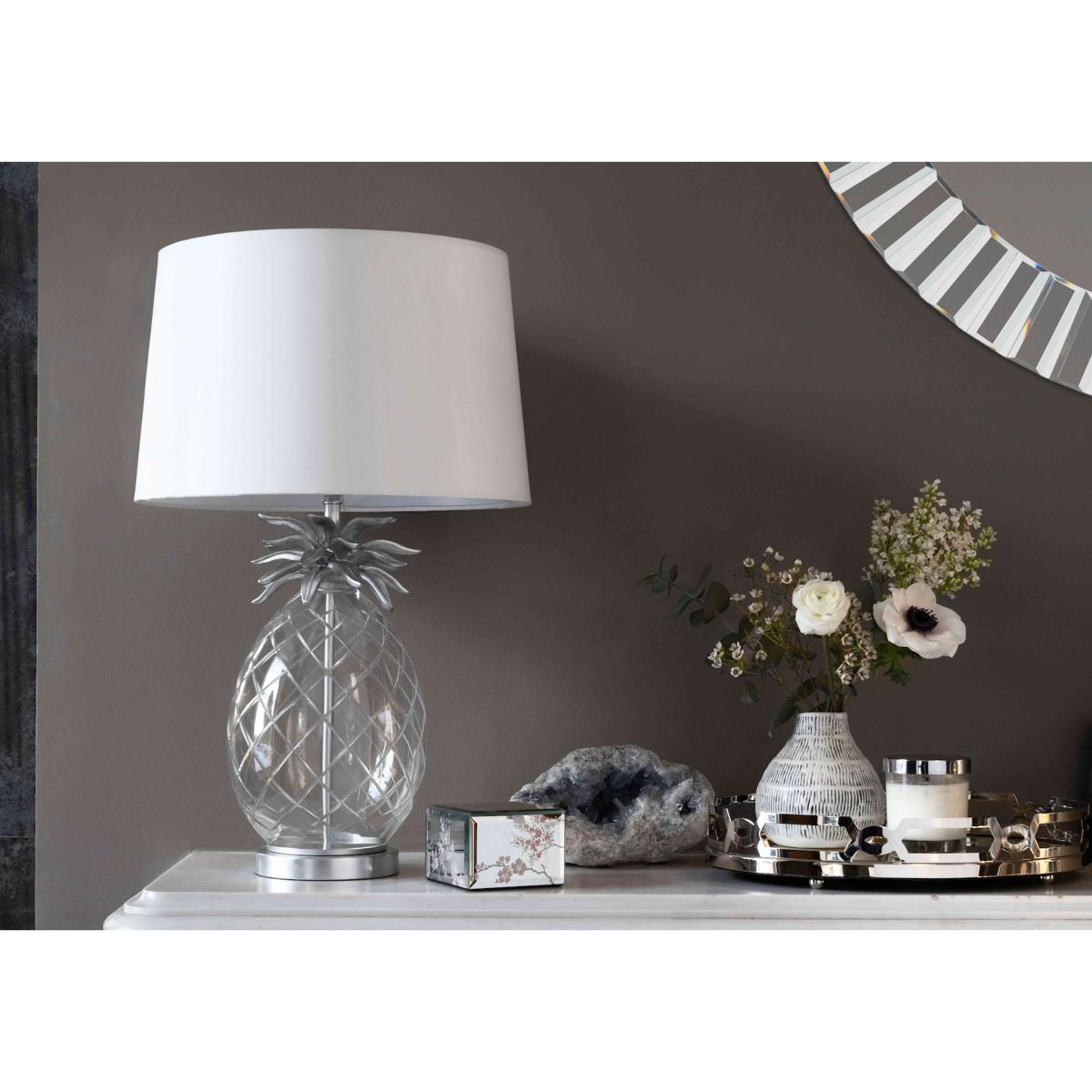 Bring tropical style to a living room corner with our Laura Ashley large pineapple table lamp. Beautifully made with a cut-glass base and hand-painted details. Why you'll love it Cute and quirky pineapple table lamp will brighten any corner. Hand-cut glass base is tinted a champagne colour. Resin pineapple leaves and flat circular base are hand painted in champagne gold. Faux silk tapered lampshade in taupe. This large table lamp is part of the Laura Ashley lighting collection. What you need to know Made of mild steel and glass. Supplied with 150 cm cable. Requires 1 x E147 (SES) max. 60 W bulb (not included). Please do not exceed this wattage. To clean, wipe gently with a soft dry cloth. Do not use polishes or abrasive cleaning products. Disconnect from the power outlet before cleaning or changing the bulb. Dimensions including shade Height: 59 cm (24 in). Diameter: 38 cm (15 in).