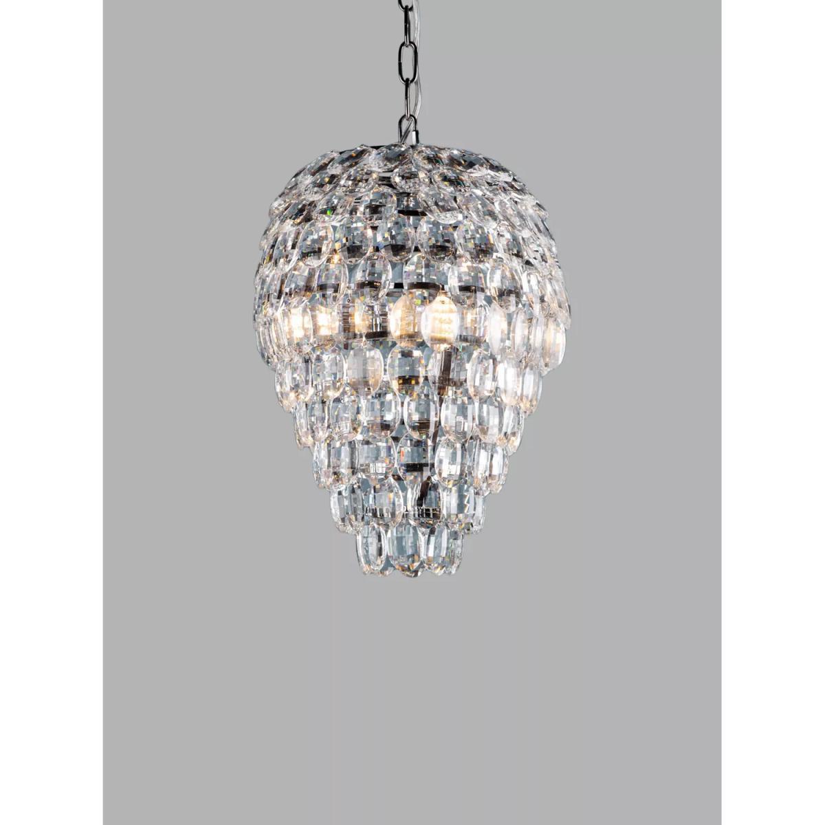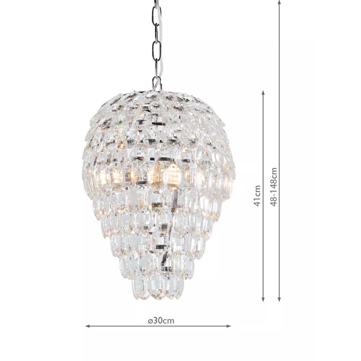 Designed in the shape of a teardrop from clear crystal glass, this ceiling light will draw the eye in your home. Impressive in size and suspended from a height-adjustable chain, it offers a bright glow of light and requires a total of three LED bulbs.