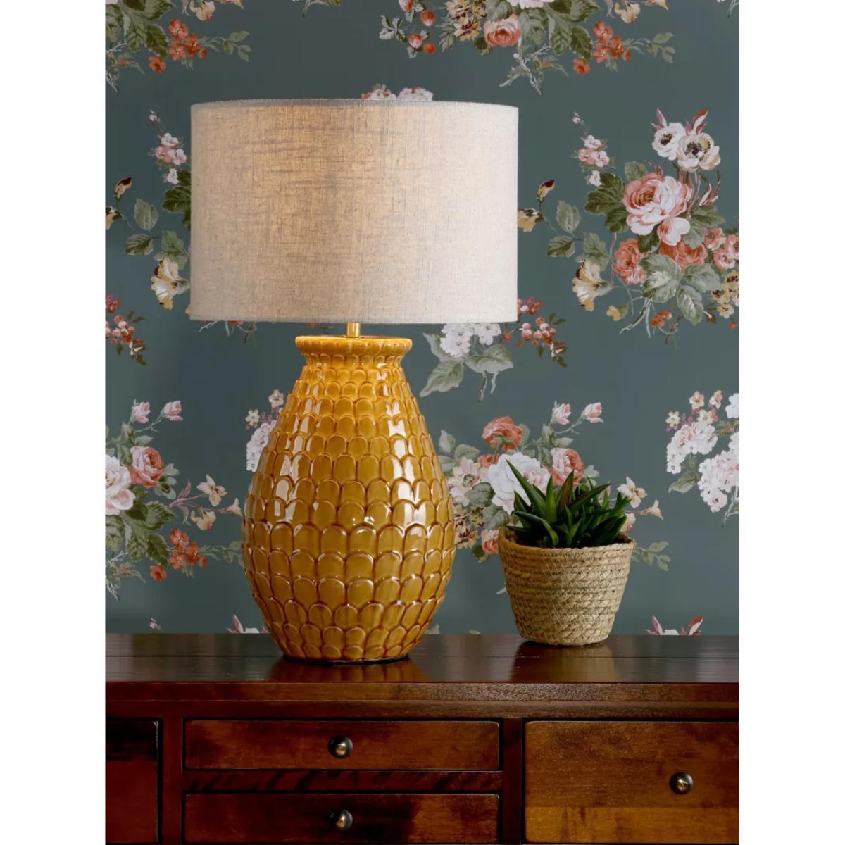 Bold colour and eye-catching texture is a winning combination and this table lamp takes first place. The base is made from ceramic in a gloss-glaze finish which enhances a unique colour distribution and it's designed with a tactile pattern of overlapping petals. Paired with a natural linen lampshade, it offers a warm glow of light and one LED bulb is required.