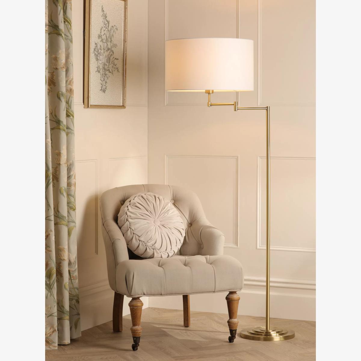 The Marlowe adjustable swing arm floor lamp from Laura Ashley is great for any reading nook. Freestanding and with a double-jointed 'elbow' arm to swing with ease into your preferred reading position, it illuminates corners beautifully, as well as the pages of your book. With metalwork in a straight stem and Art Deco-style round stepped base, it's finished with a neutral drum shade. Bulb not included. Takes one 60W E27 (ES) bulb. We recommend using LED bulbs as they are more energy efficient, typically last at least 15000 hours and use 90% less energy than a traditional halogen bulb. Less energy means lower electricity costs.