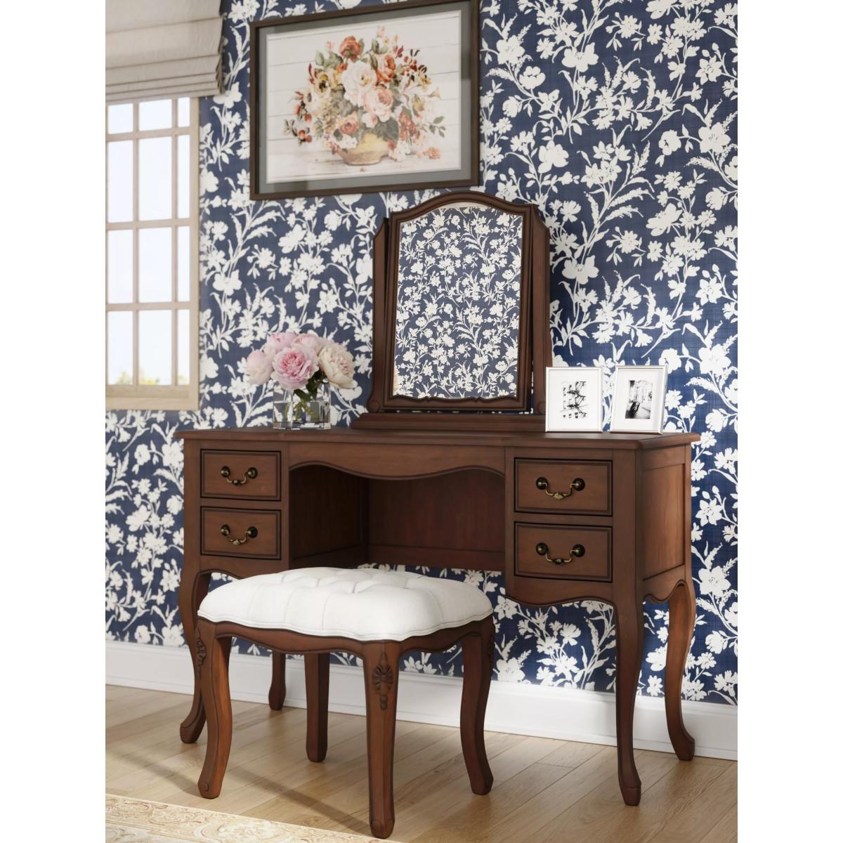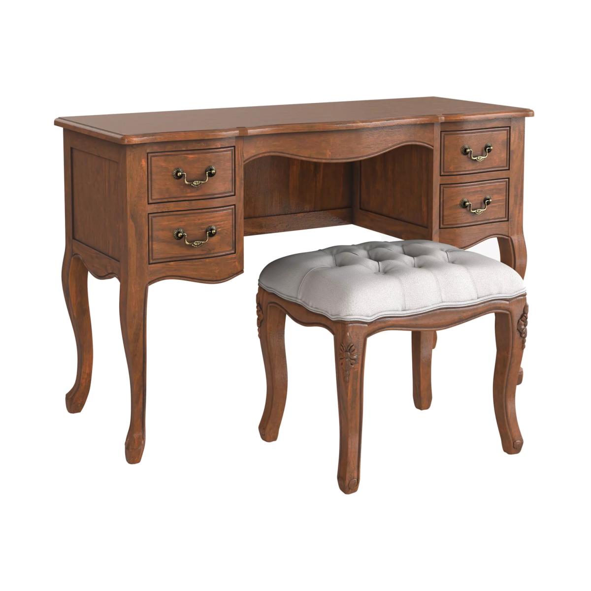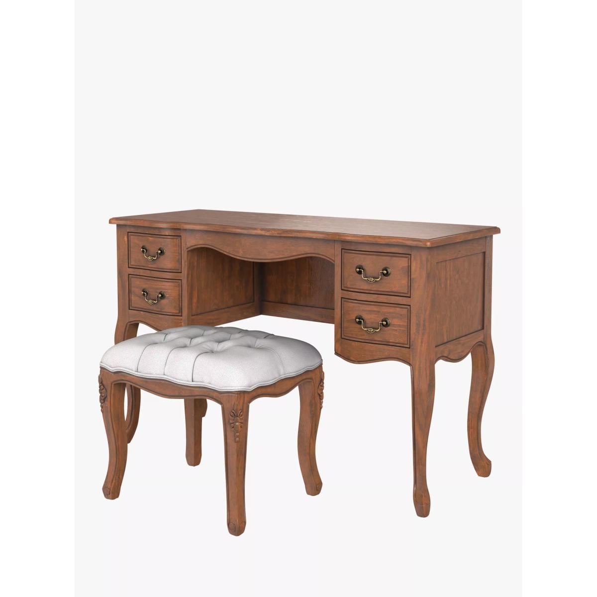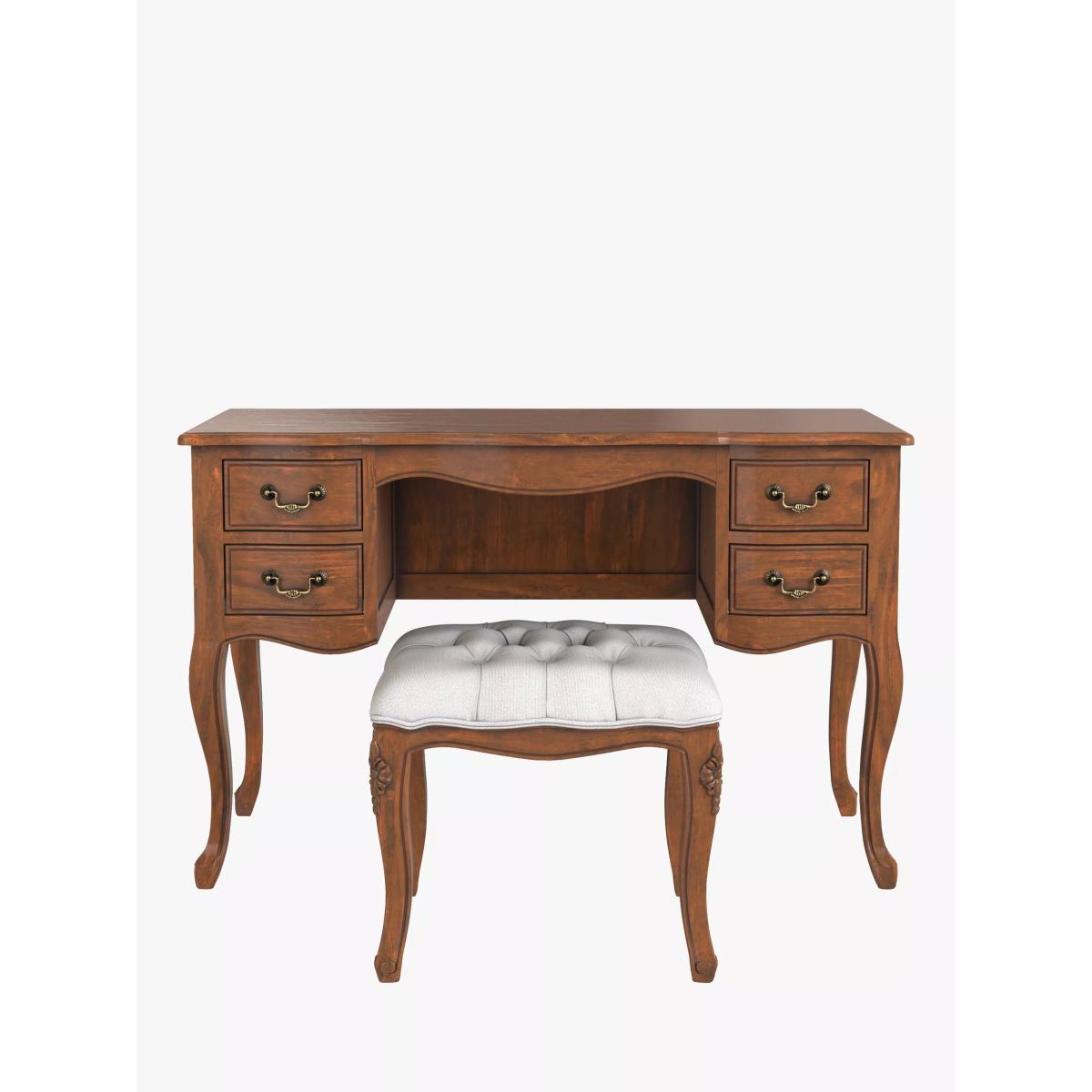 Excuding classical French charm, this dressing table set will bring an elegant style to your bedroom. It's made from solid wood with veneered panels and its traditional design details include cabriole legs, graceful curves and complementary antique brass hardware. There's also a helpful amount of storage space available in the four drawers. The matching stool has a comfortable, plush filling and it's covered in a plain weave, neutral fabric. Want to see it first? You may want to see and get a feel for the furniture in one of our shops before ordering. We'll be able to tell you where the range you'd like to view is on display.