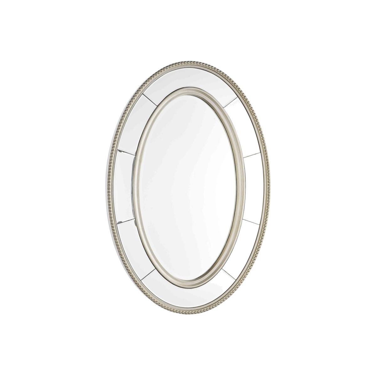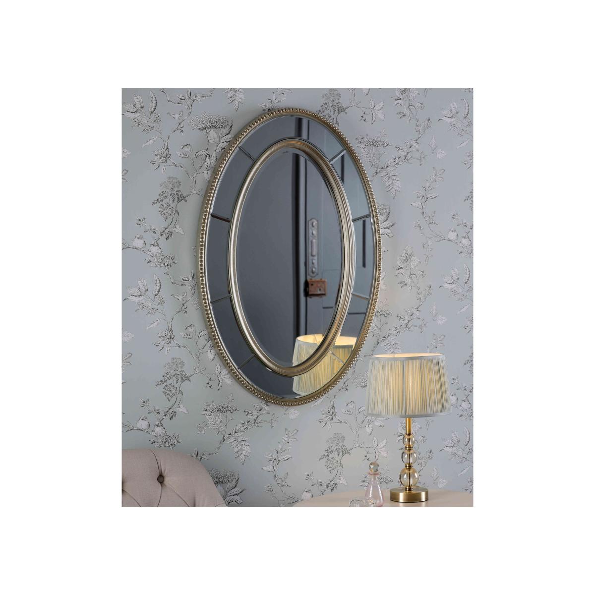 Elegance and style meet in this beautiful oval mirror. Finished in a luxurious champagne leaf, it features a classical milgrain beaded edging that will always look timeless. Why you'll love it Oval mirror designed for classic interiors. Luxurious champagne leaf finish. Elegant milgrain beaded edge. Perfect for hallways and living rooms. What you need to know Made of glass and metal. Indoor use only. Avoid placing in direct sunlight. To clean, apply cleaner to a soft, lint-free cloth and then wipe surface. Wall fixings not included. Dimensions Height: 90 cm (35 in). Width: 60 cm (24 in). Depth: 4 cm (2 in).