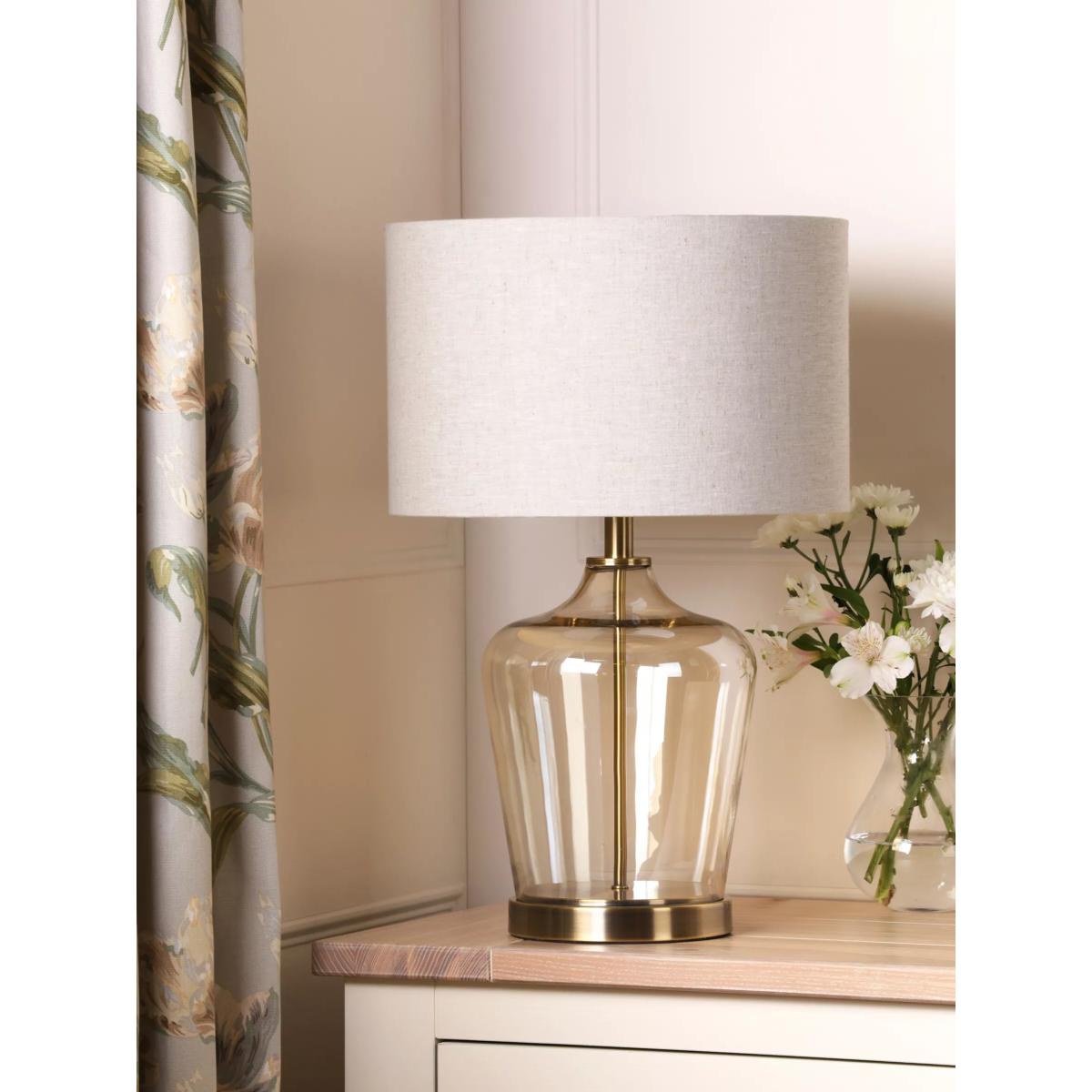 The Ockley Table Lamp by Laura Ashley features a touch on/off antique brass plinth beneath a champagne glass vase. With a three-stage touch switch function, simply touch once to turn on, again to dim and then once more to turn off. Paired with a linen shade with a metallic inner, it's a great table lamp for any room. Bulb not included. Takes one 60W E27 (ES) bulb. We recommend using LED bulbs as they are more energy efficient, typically last at least 15000 hours and use 90% less energy than a traditional halogen bulb. Less energy means lower electricity costs.