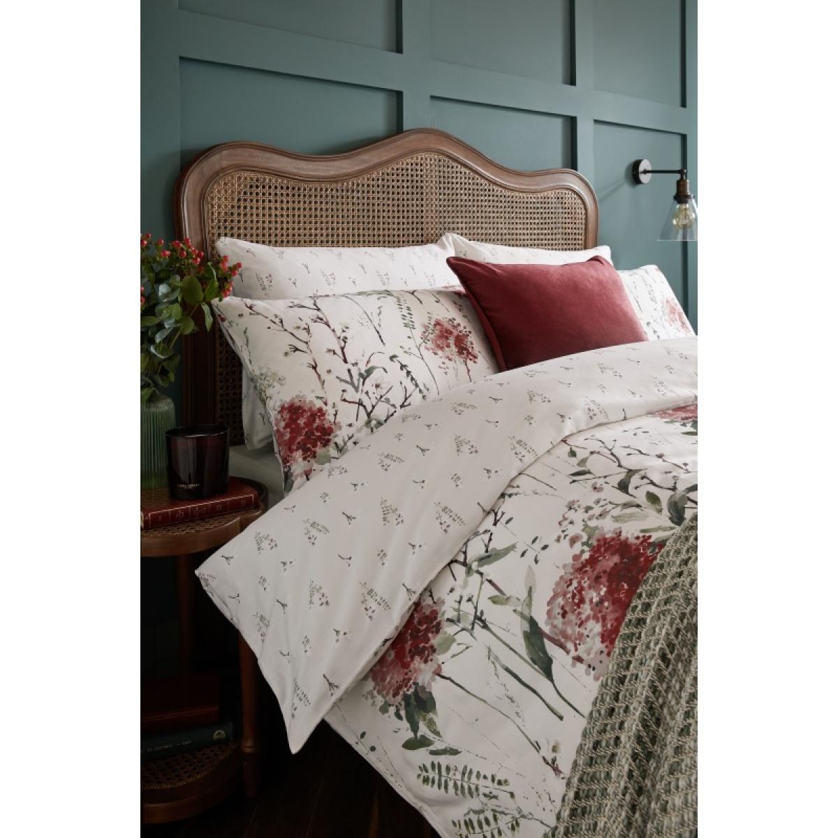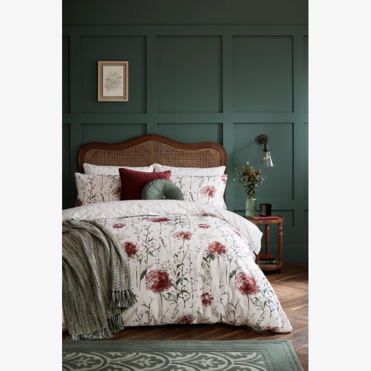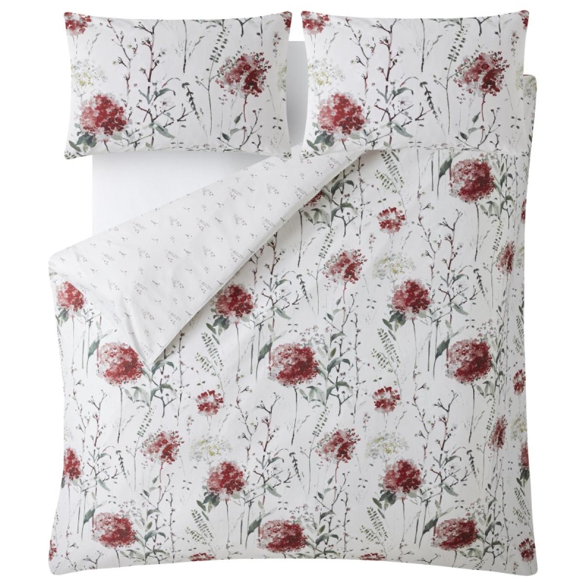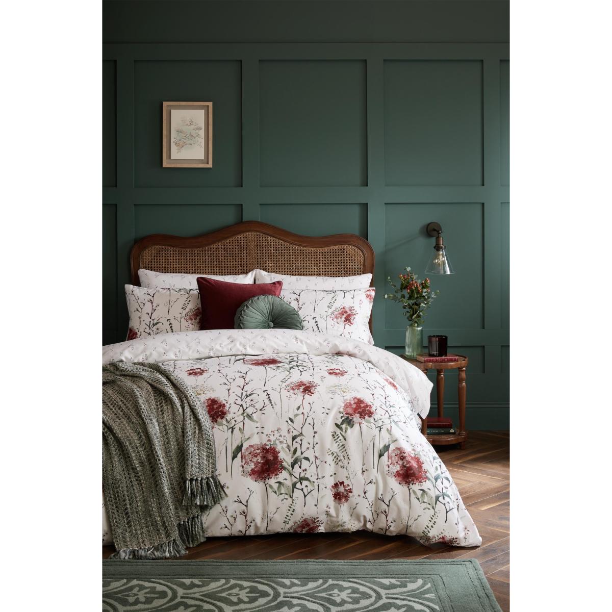 The Laura Ashley Pallington Bloom Ruby Duvet Cover Set in Red/Cream showcases a rich floral pattern with a luxurious blend of bold red and soft cream, offering a classic and elegant touch to your bedroom decor. Sophisticated and contemporary, the Pallington Bloom bedding features delicate alliums and blossom branches in a watercolour style, on a luxurious 220T. C cotton sateen bedding. Delicate, painterly sprigs and leaves decorate the bedding reverse. Features: A painterly watercolour floral design in a classic ruby red, cream and sage green palette. Reversible bed set: bedding features a beautiful, co-ordinating ditsy print reverse. 220 Thread Count 100% Cotton Care Instructions: Machine Washable Please note All screens vary in colour reproduction and whilst every effort has been made to display the colour as accurately as possible it is for guidance only.