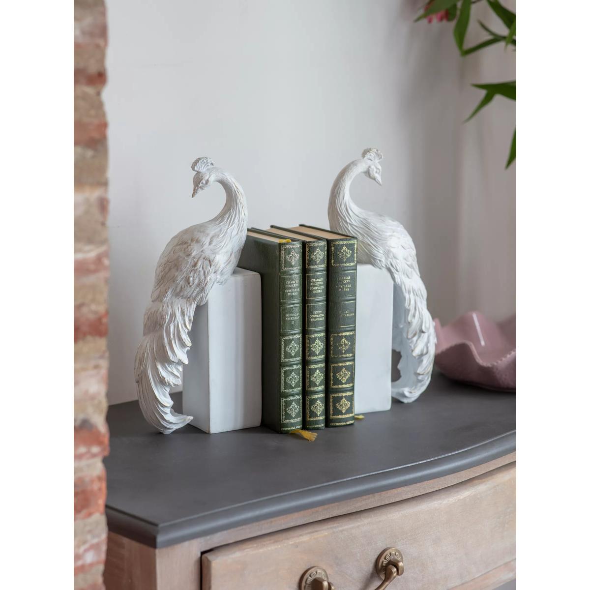 Peacock bookends inspired by Laura Ashley's favourite bird. These exquisite bookends showcase intricate details, made using resin and heavyweight limestone with a vintage-inspired antique white finish. Whether gracing your study or living room, these bookends not only hold your books in place but also add a touch of classic beauty to your home.