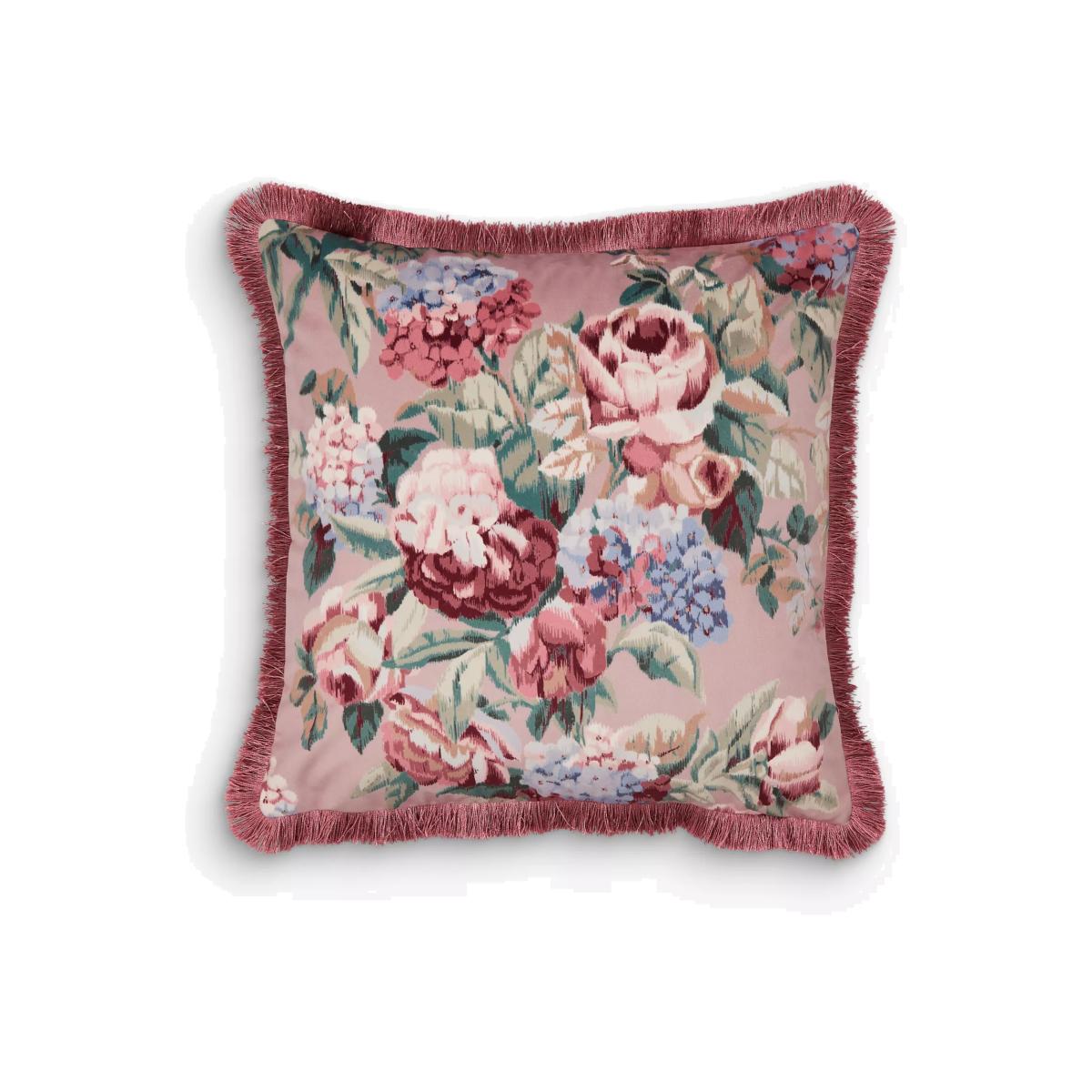 A beautifully painted floral pattern printed onto sumptuous velour velvet. With its deep mulberry tones and fringe finish, this Pembrey cushion adds drama and grandeur to any room.