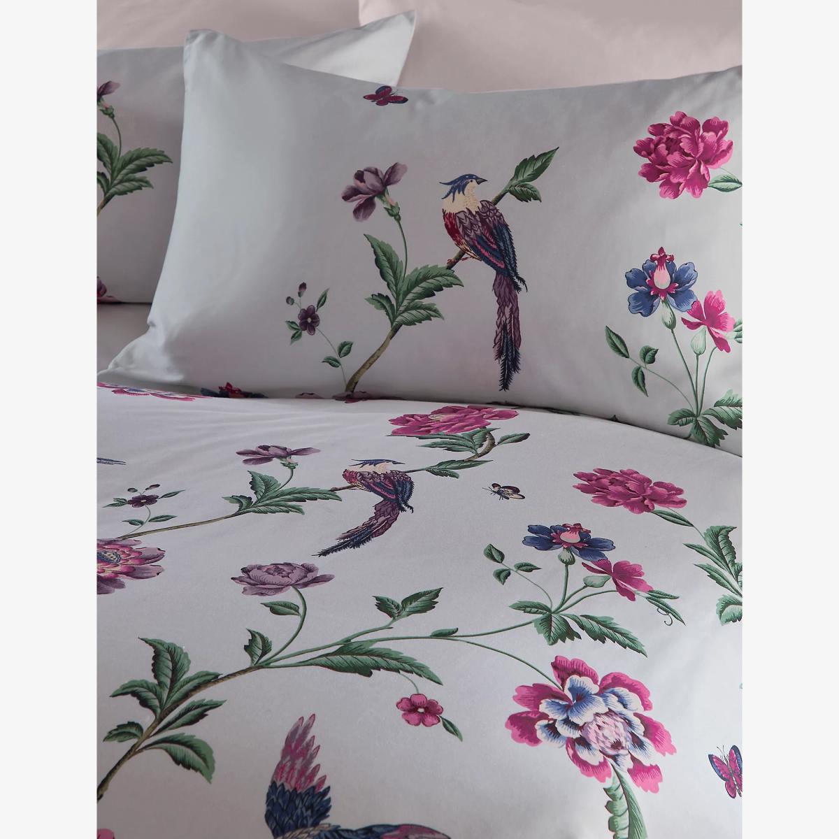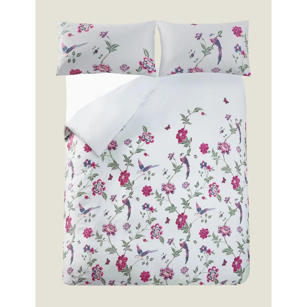Decorated with large blooms, butterflies and birds of paradise, this bedding set from Laura Ashley is a vibrant design to add to your collection. It's crafted from a luxurious cotton sateen material with a 220 thread count that ensures it feels soft and smooth. This set is plain on the reverse side for a versatile look. An easy-care finish makes for hassle-free laundering.