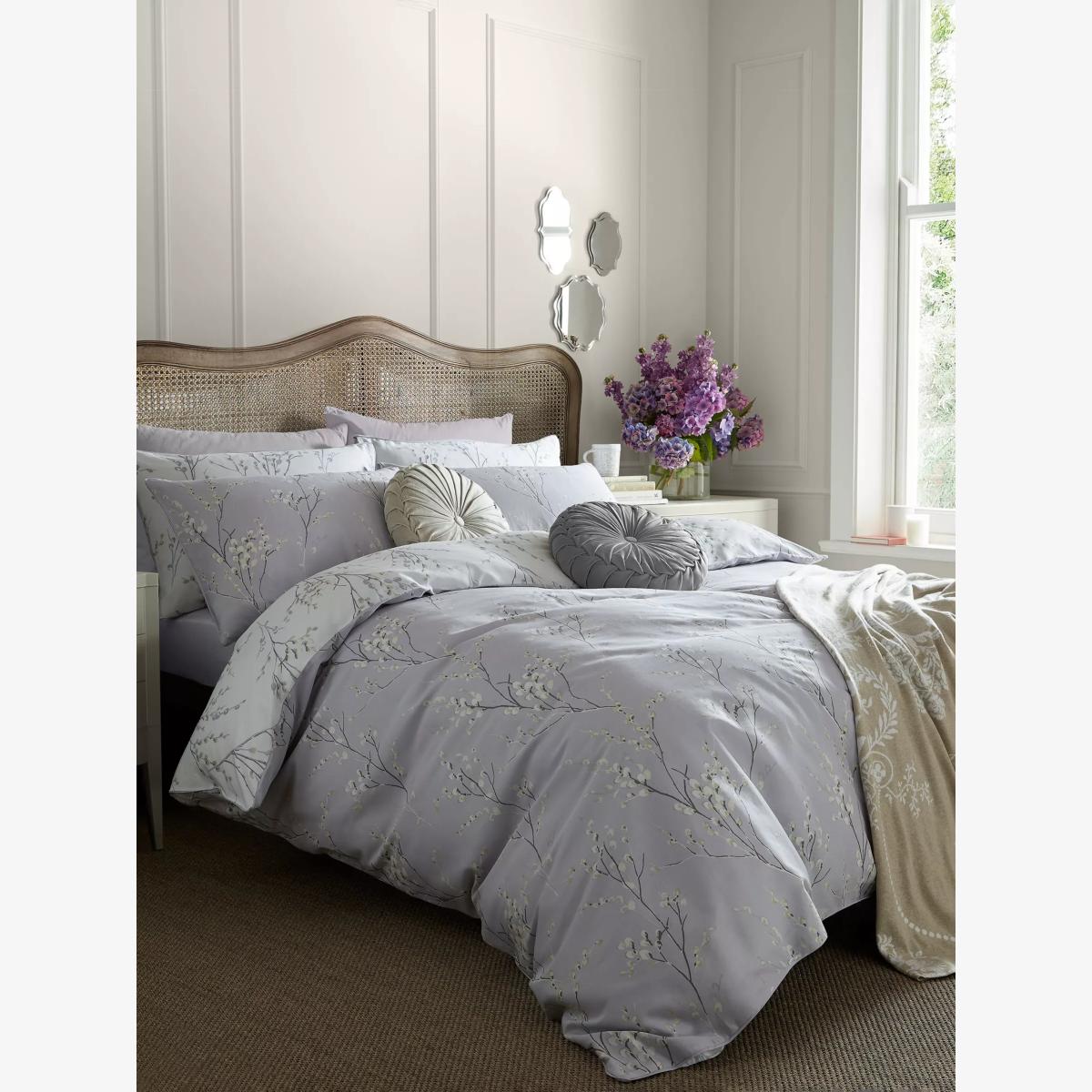 The popular Pussy Willow floral print from Laura Ashley is perfect for bringing a fresh, elegant feel to your home decor. Crafted from 100% cotton sateen in 200 thread count, this delicately printed bedlinen is in a beautiful colour palette of soft lavender with piped edge detailing. Set includes a duvet cover and two pillowcases (includes one pillowcase with the single set). Pillowcases are available to purchase separately. Thread Count This number refers to the number of threads per square inch. Typically, the higher the thread count, the softer and smoother the feel. Have you thought about sheeting? Shop here Bedding sizes To fit duvet/pillow size (cm): Standard pillowcase, L75 x W50cm Single duvet cover, L200 x W137cm Double duvet cover, L200 x W200cm King duvet cover, L220 x W230cm Super king duvet cover, L220 x W260cm