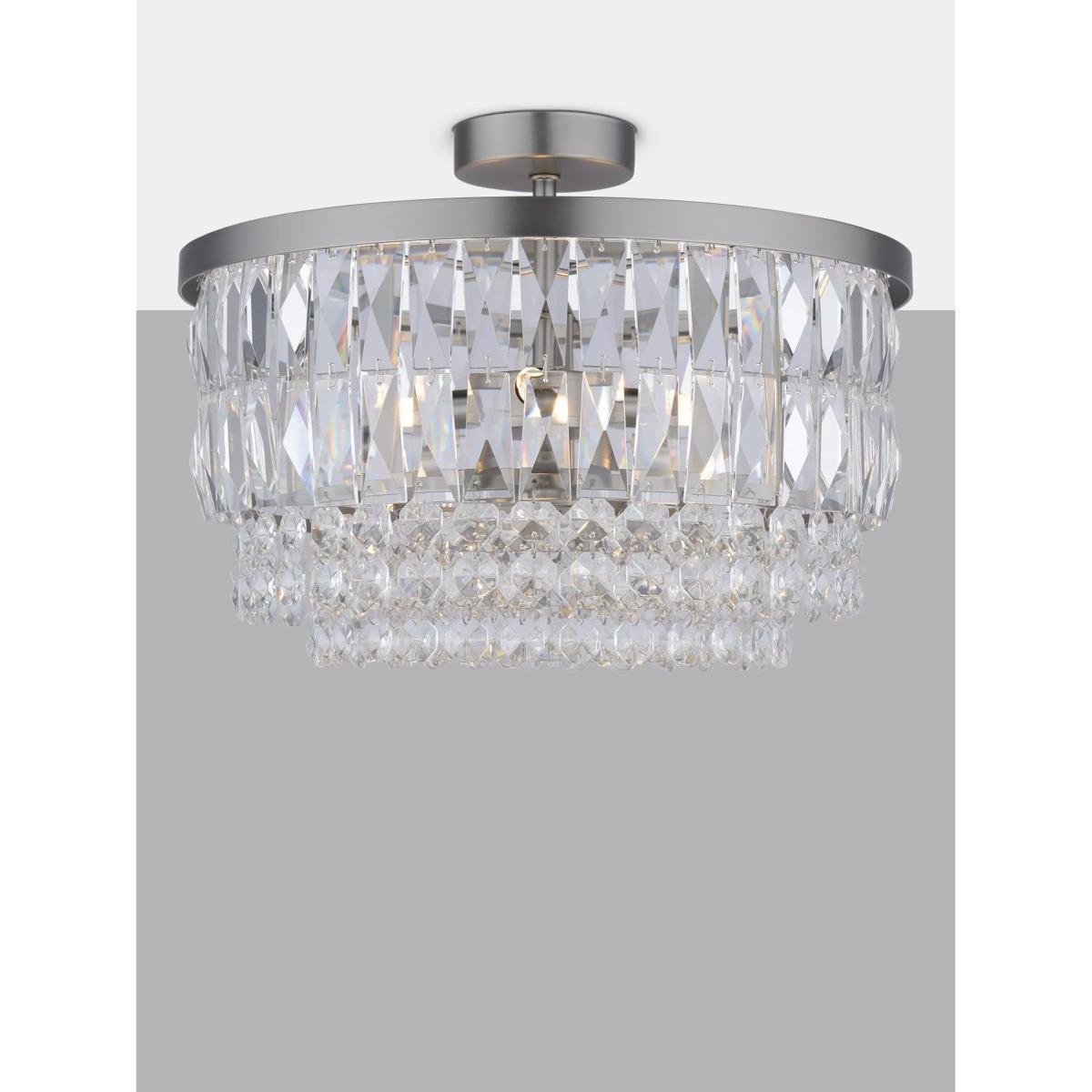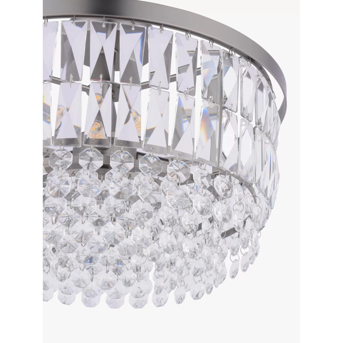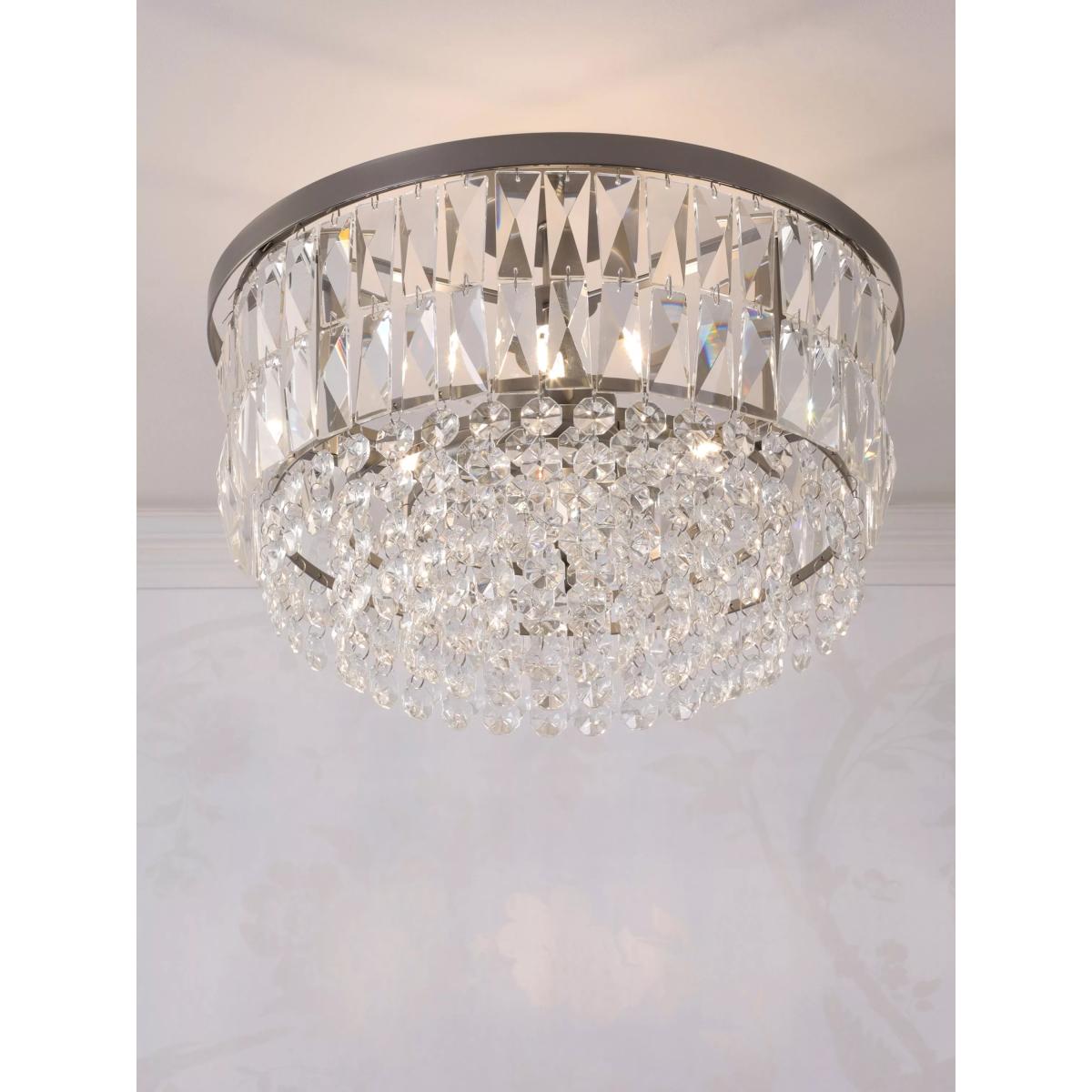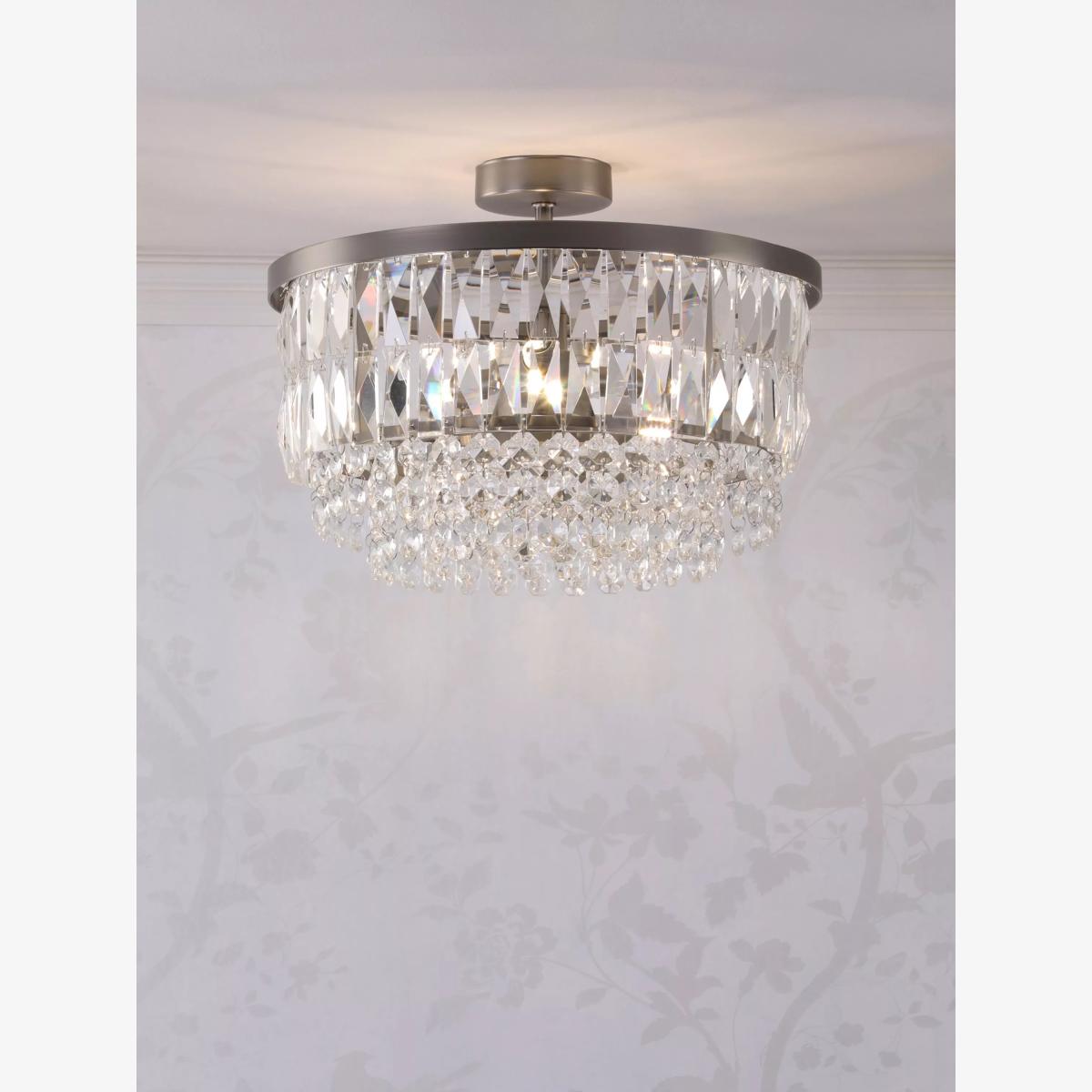 The glamorous Rhosill ceiling light by Laura Ashley features bevelled glass shapes, suspended from a circular frame in a contemporary finish. Full flush fittings attach directly to the ceiling, so they are suitable for low ceilings and small rooms. They have a neat finish with no visible cables.