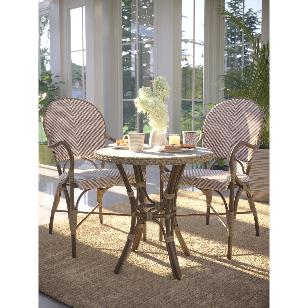 I love this bistro set because it effortlessly combines classic charm with practical outdoor durability, making it a versatile choice for both cosy garden corners and cottage-style patios. The woven design and neutral tones make it easy to incorporate into a range of interiors, from seaside-inspired schemes to more relaxed, casual outdoor spaces. When styling, consider pairing it with colourful cushions or a simple table runner to add personality without overwhelming its natural, woven texture. It works equally well with casual ceramics and natural textures like stone or wood, creating a welcoming and stylish spot for al fresco dining or afternoon coffee.