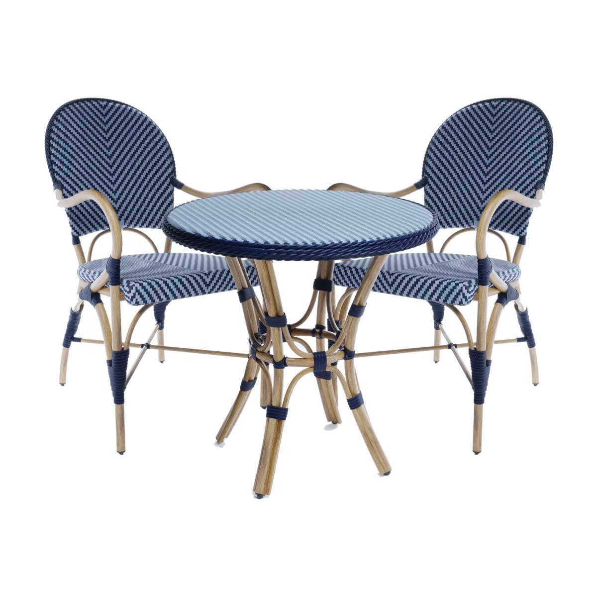 Handwoven onto expertly crafted powder-coated rust-free aluminium frames with UV and frost-resistant outdoor material, the Laura Ashley Riviera bistro set is an elegant choice for the garden or in the home. The round bistro table and the two matching dining chairs have smooth aluminium frames with an authentic wood-effect finish. Arrives fully assembled for immediate use. Low maintenance, simply wipe clean with a damp cloth to remove any marks or spillages.