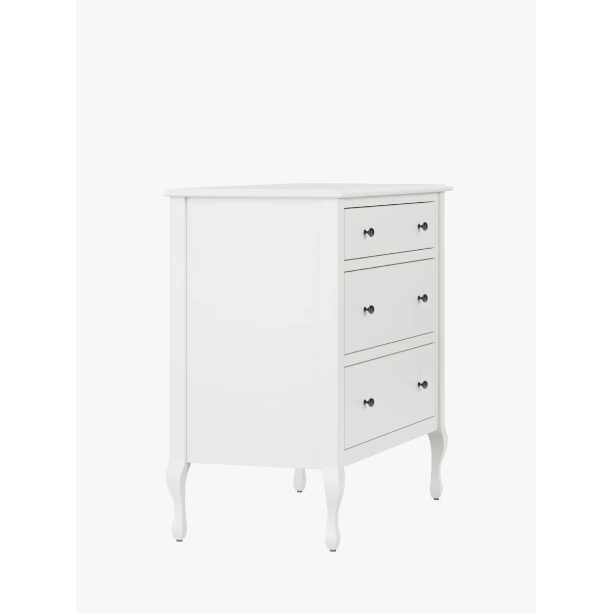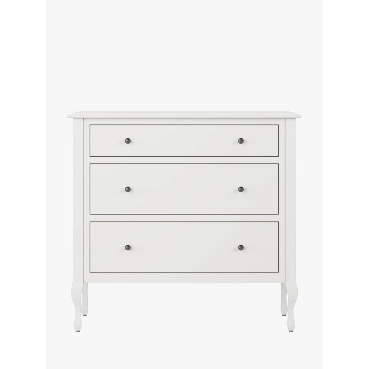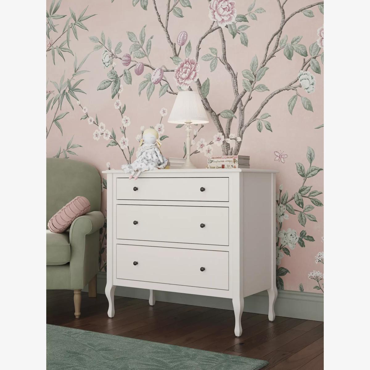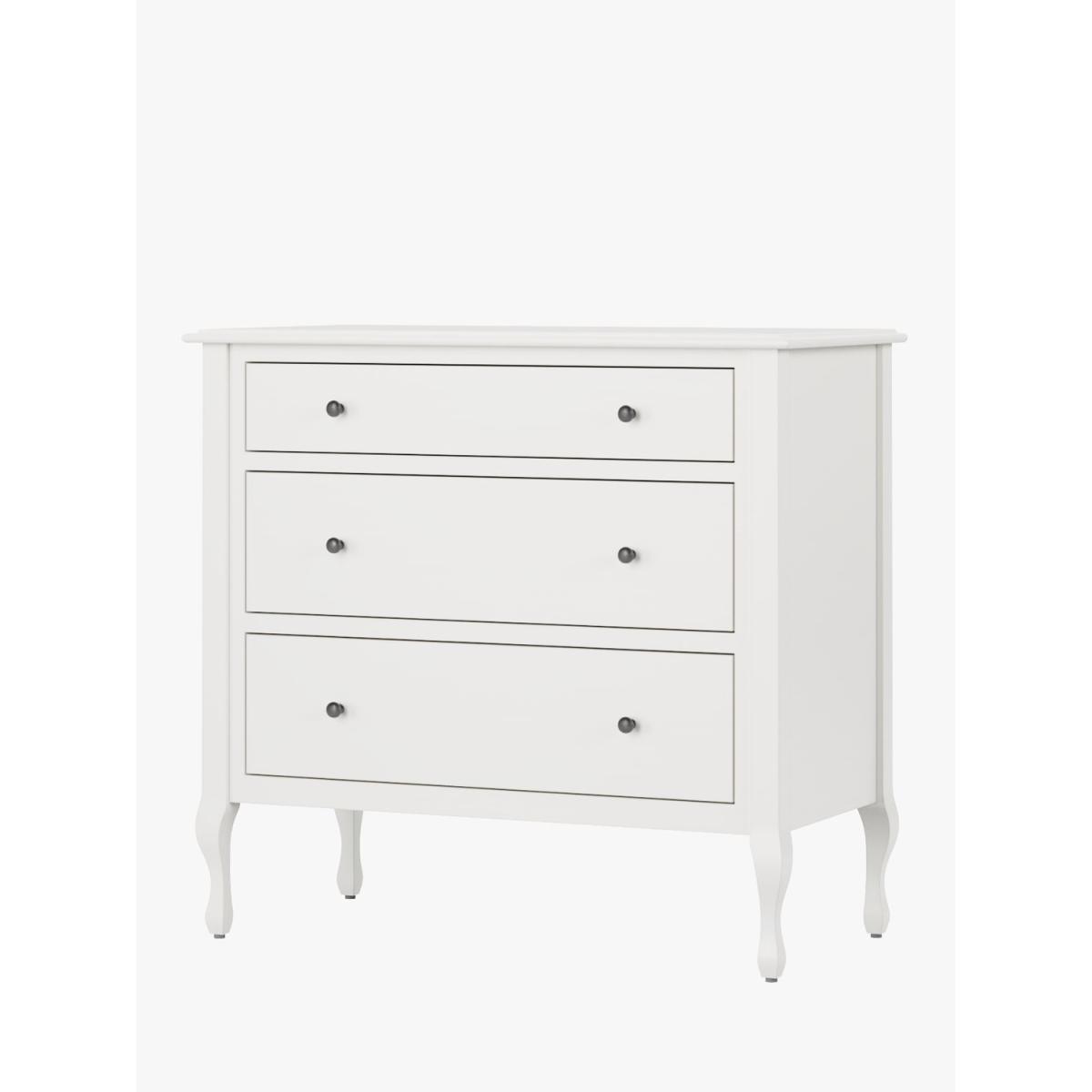 The Laura Ashley Rosie Children's furniture range is a re-scaled, Children's version of the timeless Rosalind range; borrowing from the elegant shaping of French Rococo furniture but applied in a more restrained and contemporary fashion. The 3 Drawer Chest features one shallow top drawer and two deeper drawers below, all dressed with pewter effect knobs, providing an attractive and practical configuration. The top is characterised by pretty bevelled edges and all surfaces are given a graceful yet durable painted finish. The chest has been carefully designed, manufactured and finished to comply with Children's British Standards and is suitable for Children aged 4 and above.