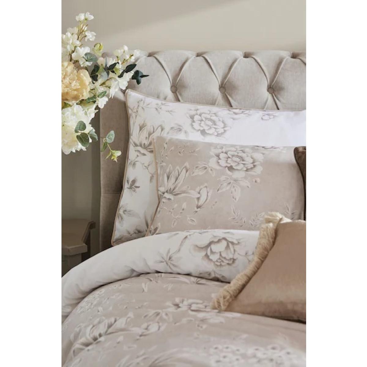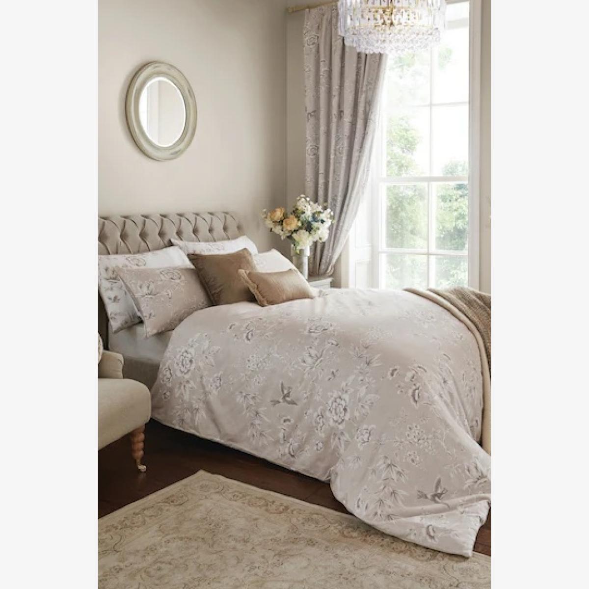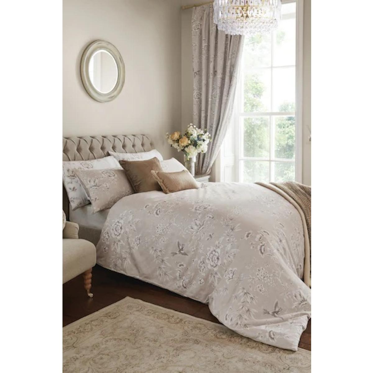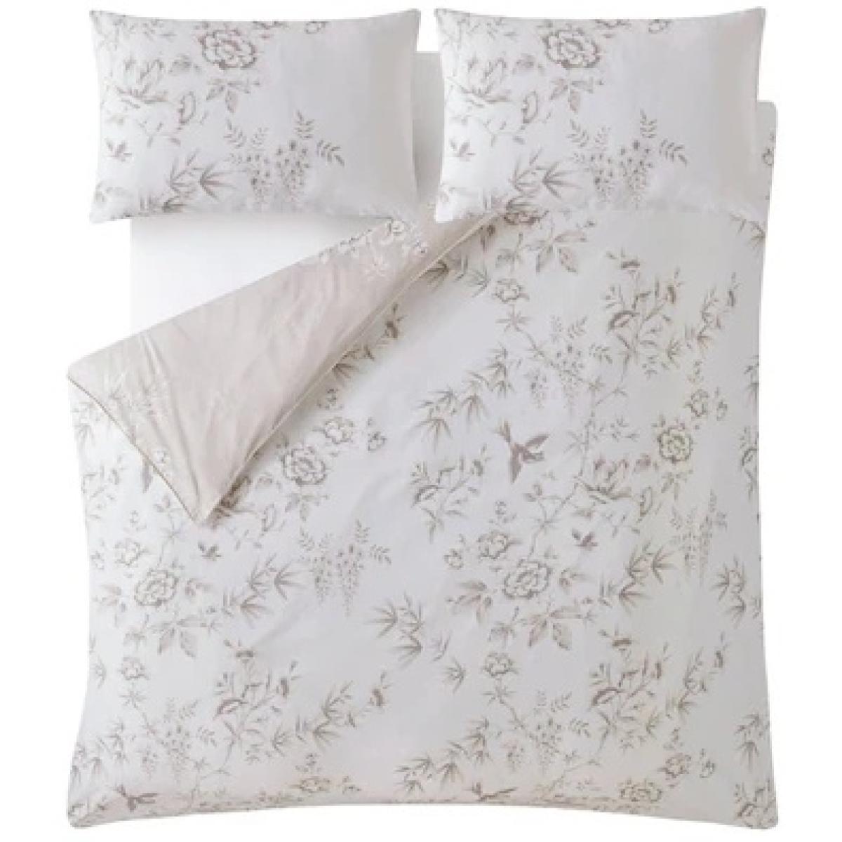 The Laura Ashley Rowsham Garden Duvet Cover Set in Natural presents a serene and timeless design with its subtle floral patterns and neutral tones, creating a calming and elegant ambiance in any bedroom. Add a touch of elegance to your bedroom with the gorgeous Rowsham Garden reversible bedding. Beautiful wisteria, peony, and magnolia flowers in a chinoiserie-inspired style trail across this luxurious 220T. C cotton sateen bedding, in a timeless palette of warm natural shades and crisp white. Features: Reversible floral design. 220 Thread Count. 100% Cotton. On-trend warm, natural colour palette. Single Duvet Includes Single Pillowcase Double, King and Superking Size Duvet Includes Pair of Pillowcases Care Instructions: Machine Washable Please note All screens vary in colour reproduction and whilst every effort has been made to display the colour as accurately as possible it is for guidance only.