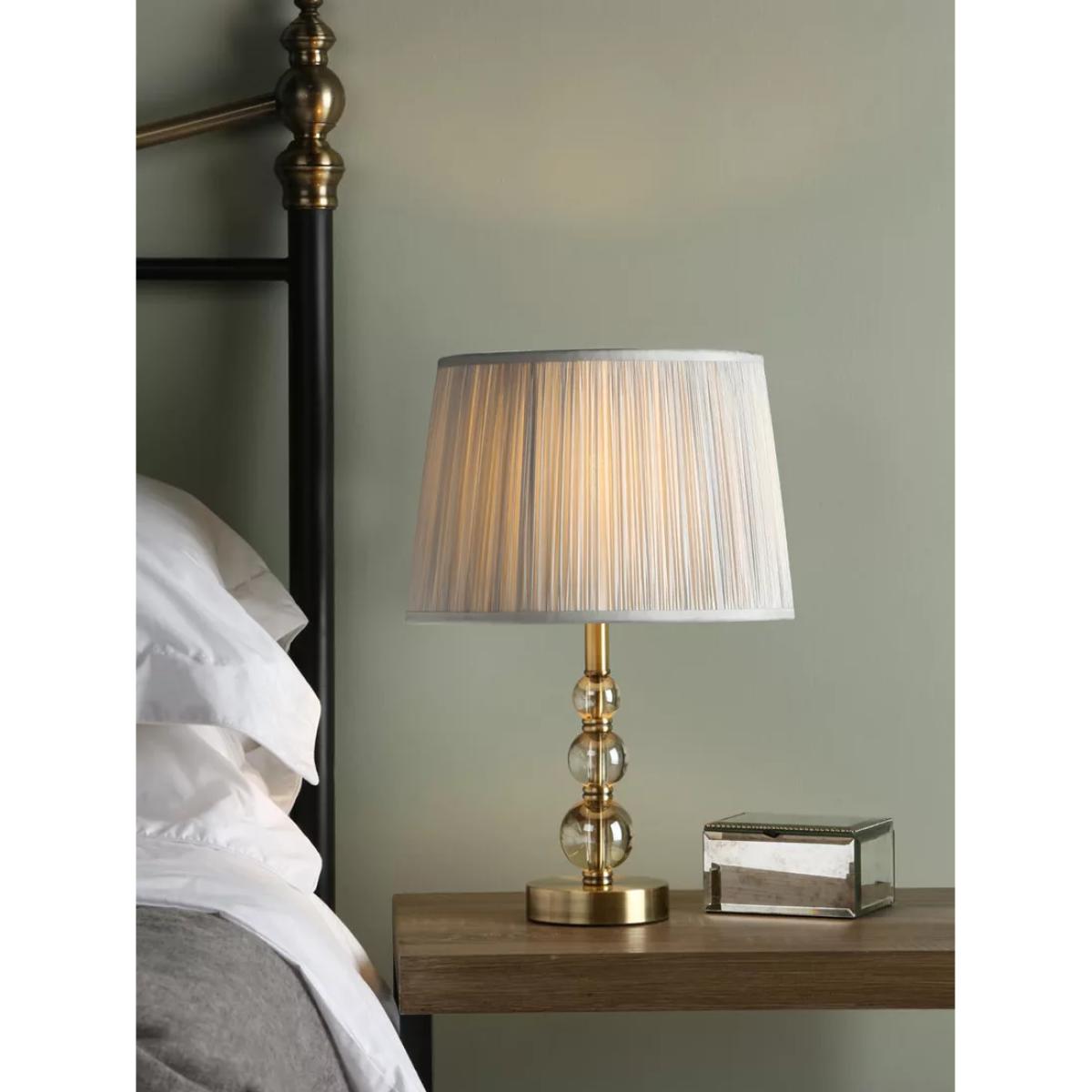 Laura Ashley's Selby table lamp has an elegant spindle form threaded with pretty faceted amber glass balls of decreasing size, poised on a round foot. Finished in warm antique brass, the Selby table light will enhance any interior, whether traditional or contemporary in style. It comes with Laura Ashley's Bacall, linen empire shade in duck egg.