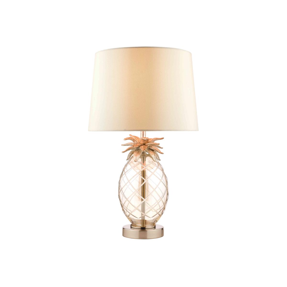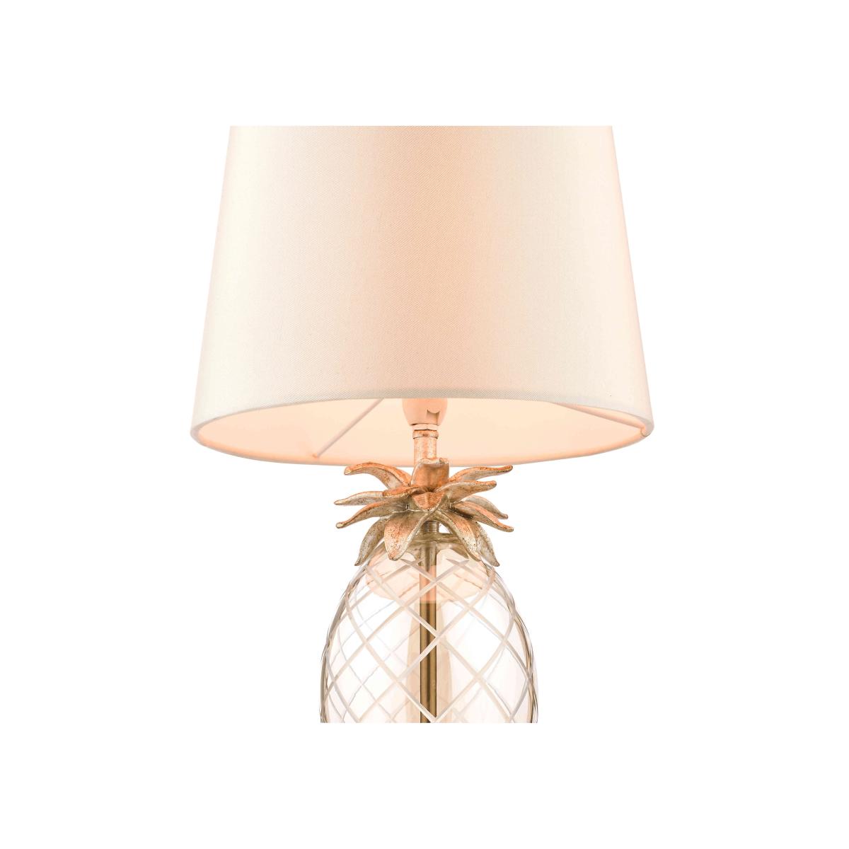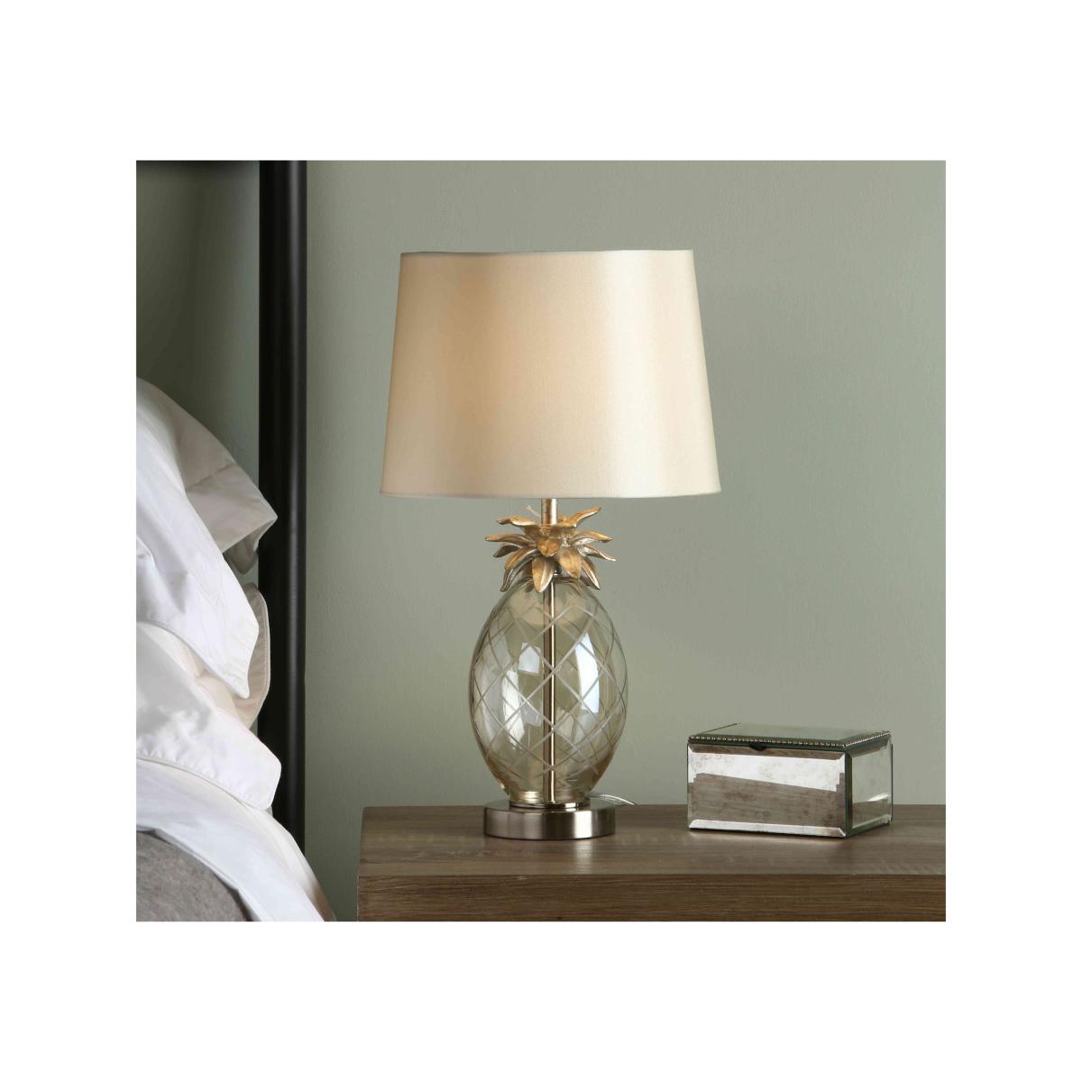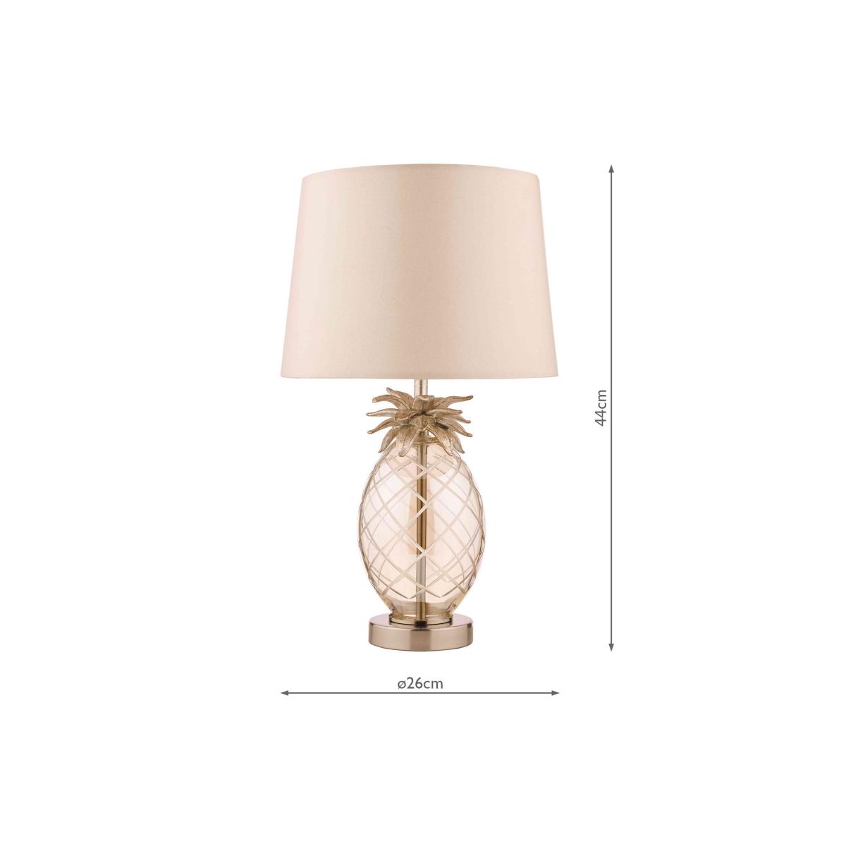 This appealing small table lamp in the shape of a pineapple is creatively designed and beautifully crafted and hand painted. By Laura Ashley. Why you'll love it Cute and quirky pineapple table lamp will brighten any corner. Hand-cut glass base is tinted a champagne colour. Resin pineapple leaves and flat circular base are hand painted in champagne gold. Faux silk tapered lampshade in taupe. This small table lamp is part of the Laura Ashley lighting collection. What you need to know Made of mild steel and glass. Supplied with 150 cm cable. Requires 1 x E147 (SES) max. 40 W bulb (not included). Please do not exceed this wattage. To clean, wipe gently with a soft dry cloth. Do not use polishes or abrasive cleaning products. Disconnect from the power outlet before cleaning or changing the bulb. Dimensions including shade Height: 44 cm (18 in). Diameter: 26 cm (11 in).