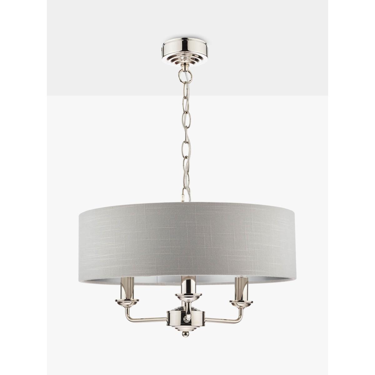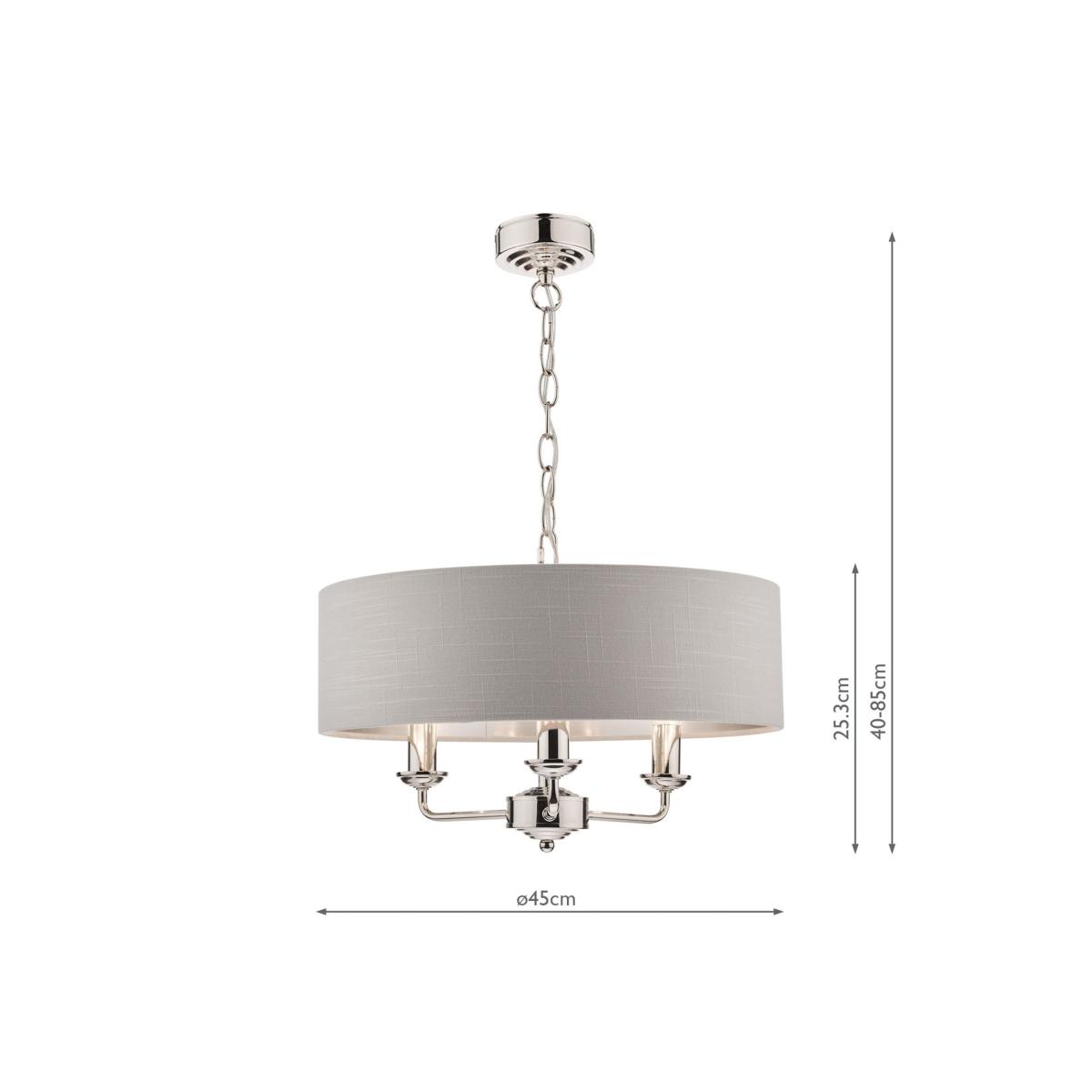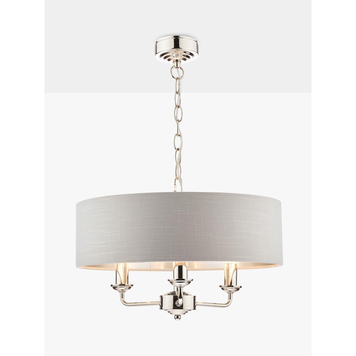 This timeless light fitting is ideal in living spaces and dining rooms, and it's suspended from a height-adjustable chain. Made from metal in a polished or satin finish, it's designed with a smart drum lampshade that encases three lights. The lampshade is made from slubbed linen and lined with a metallic inner to enhance a warm glow of light. Adding extra finesse, the ceiling rose has a stepped design that gives the fitting an Art-Deco inspired touch. Three LED bulbs are required.