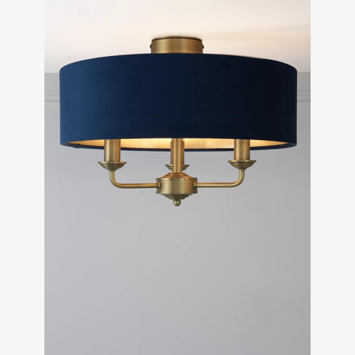 I’m a fan of this Sorrento semi-flush light for the way its antique brass arms sit crisply against the deep navy drum shade, giving you bright, even illumination without eating into ceiling height. It suits contemporary-classic or coastal-inspired rooms - think halls, snug dining corners or bedrooms - and pairs beautifully with oak furniture and soft grey walls. For practical styling, echo the brass finish in mirror frames or shelf brackets and introduce natural textures like a sisal rug or linen cushions. Fit a warm-white LED bulb to bring out the metal’s warmth and keep the shade’s colour looking rich.