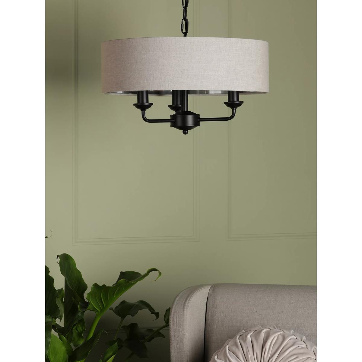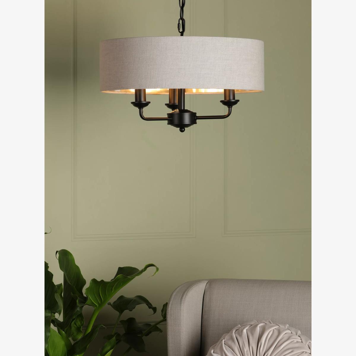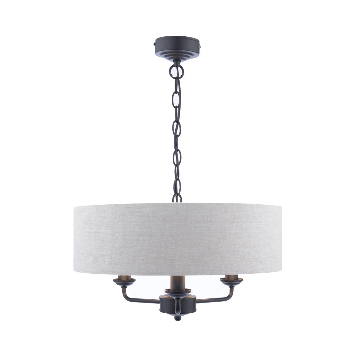 The good looking Sorrento ceiling light is a graceful blend of textured fabric and painted metal. A shallow, drum shade surrounds a three arm lamp-holder, creating a clean finish for an effortlessly elegant look. This stylish piece will illuminate your favourite room and create a bright, inviting space. Height adjustable at the point of installation.