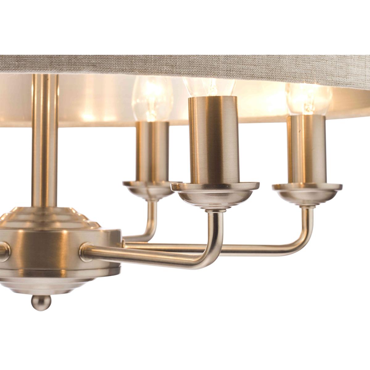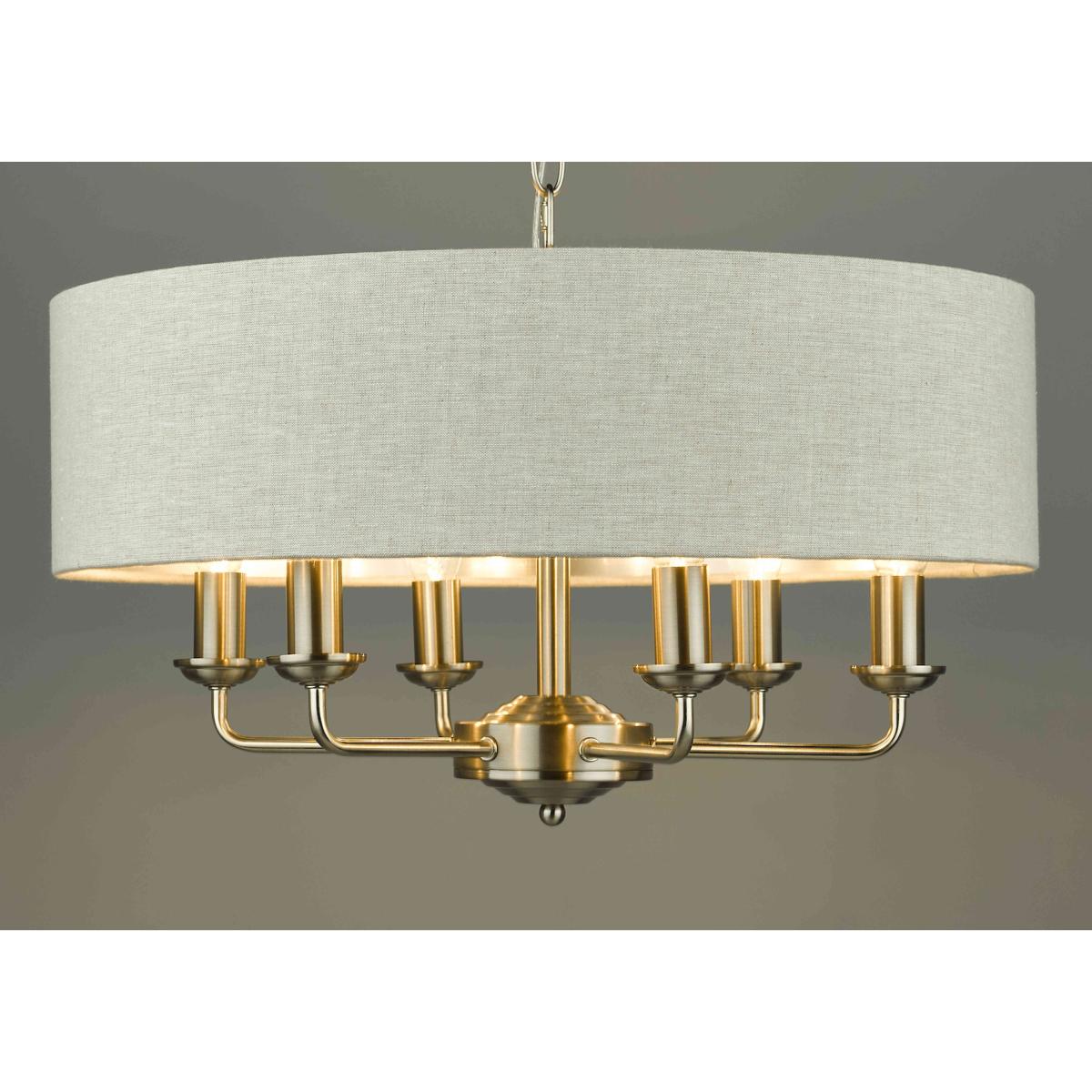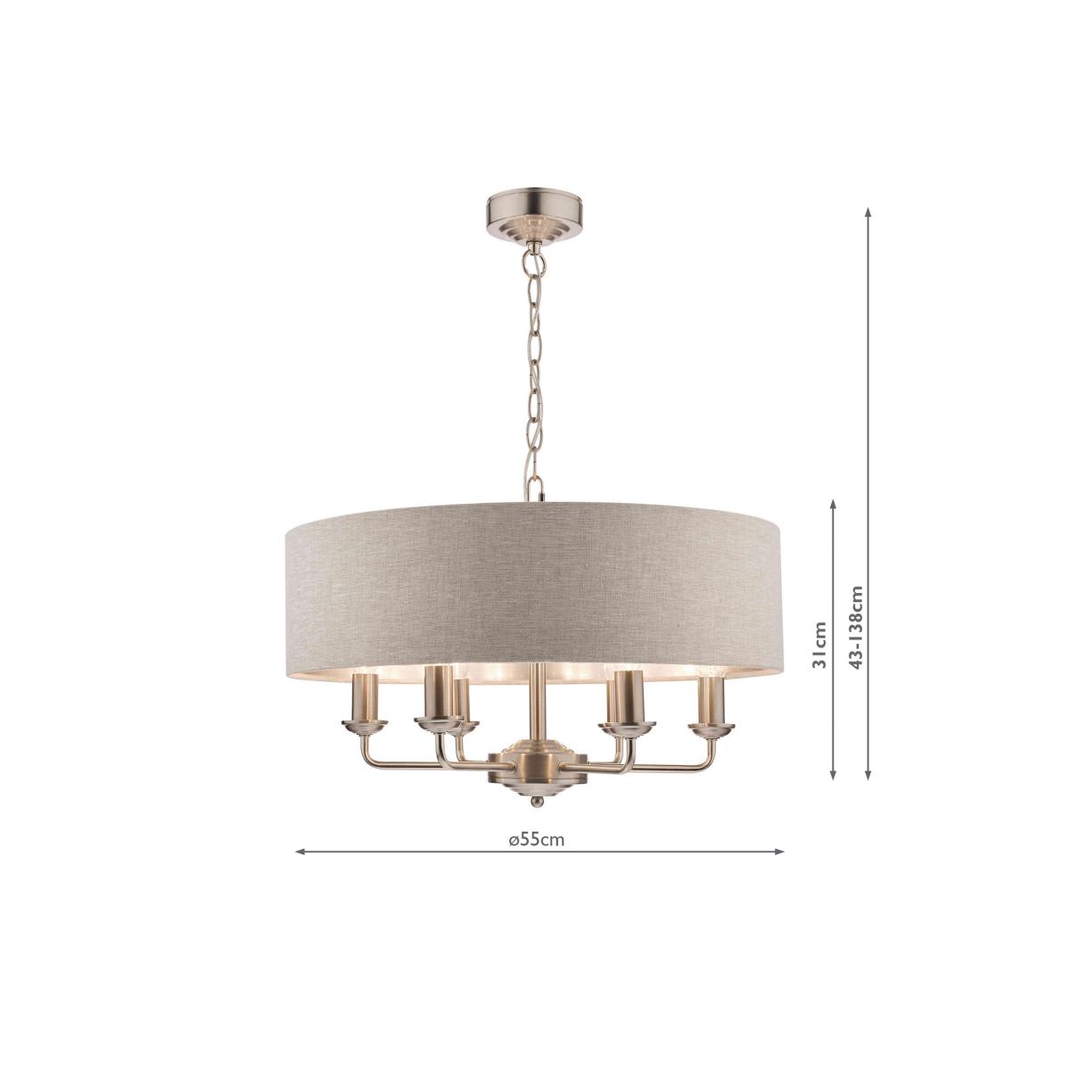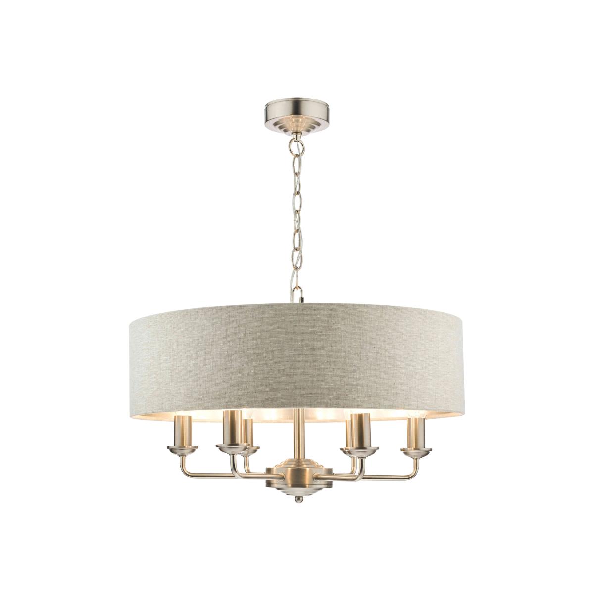The Sorrento six-arm chandelier is the very definition of statement lighting. Blending contemporary and classic design motifs, it’s truly striking. In a choice of metal finishes. Why you'll love it Striking modern chandelier suits contemporary and classic interiors. Its 6 candelabra-style lights are supported by slender curved arms. With matching bulb holders, ceiling rose and chain. In a choice of metal finishes with coordinating lampshade. Antique brass with ivory shade, satin nickel with natural shade or matt antique brass with blue shade. Silk-effect drum-shaped shade has a pearlised lining. Height adjustable at installation. This 6-arm chandelier is part of the Laura Ashley lighting collection. What you need to know Made of mild steel. Requires 6 x E14 (SES) max. 40 W bulbs (not included). Please do not exceed this wattage. To clean, wipe gently with a soft dry cloth. Do not use polishes or abrasive cleaning products. Be sure to switch off before cleaning or changing the bulbs. Dimensions including shade Height: 31 cm (13 in). Diameter: 55 cm (22 in). Minimum height from ceiling including light: 40 cm (16 in). Maximum height from ceiling including light: 135 cm (53 in). Item code: LASO6CDRNATU-001