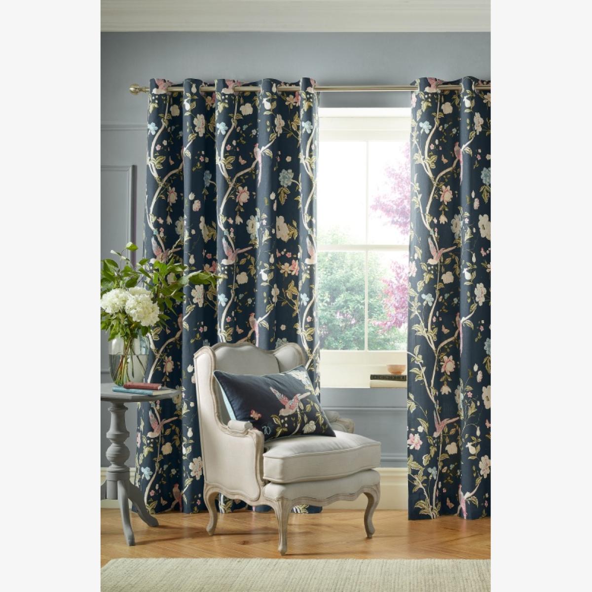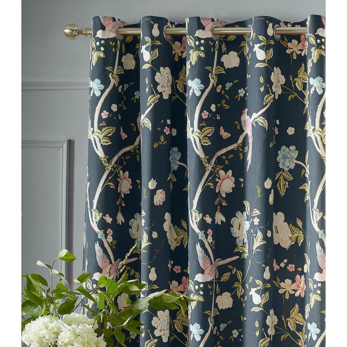 Introduce timeless elegance to your home with the Laura Ashley Summer Palace Eyelet Curtains in Midnight. Inspired by classic chinoiserie designs, these curtains feature a beautifully intricate floral and bird motif, adding a touch of sophistication to any space. This beautiful Midnight blue palette encompasses blooms, butterflies, and fabulous birds of paradise. Features Composition: 100% Cotton Face, 50% Polyester 50% Cotton Lining Eyelet Header Fully Lined Pair Care Instructions Dry Clean Only   Please note All screens vary in colour reproduction and whilst every effort has been made to display the colour as accurately as possible it is for guidance only.